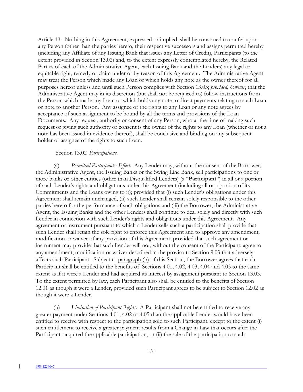 Article 13. Nothing in this Agreement, expressed or implied, shall be construed to confer upon any Person (other than the parties hereto, their respective successors and assigns permitted hereby (including any Affiliate of any Issuing Bank that issues any Letter of Credit), Participants (to the extent provided in Section 13.02) and, to the extent expressly contemplated hereby, the Related Parties of each of the Administrative Agent, each Issuing Bank and the Lenders) any legal or equitable right, remedy or claim under or by reason of this Agreement. The Administrative Agent may treat the Person which made any Loan or which holds any note as the owner thereof for all purposes hereof unless and until such Person complies with Section 13.03; provided, however, that the Administrative Agent may in its discretion (but shall not be required to) follow instructions from the Person which made any Loan or which holds any note to direct payments relating to such Loan or note to another Person. Any assignee of the rights to any Loan or any note agrees by acceptance of such assignment to be bound by all the terms and provisions of the Loan Documents. Any request, authority or consent of any Person, who at the time of making such request or giving such authority or consent is the owner of the rights to any Loan (whether or not a note has been issued in evidence thereof), shall be conclusive and binding on any subsequent holder or assignee of the rights to such Loan. Section 13.02 Participations. (a) Permitted Participants; Effect. Any Lender may, without the consent of the Borrower, the Administrative Agent, the Issuing Banks or the Swing Line Bank, sell participations to one or more banks or other entities (other than Disqualified Lenders) (a “Participant”) in all or a portion of such Lender’s rights and obligations under this Agreement (including all or a portion of its Commitments and the Loans owing to it); provided that (i) such Lender’s obligations under this Agreement shall remain unchanged, (ii) such Lender shall remain solely responsible to the other parties hereto for the performance of such obligations and (iii) the Borrower, the Administrative Agent, the Issuing Banks and the other Lenders shall continue to deal solely and directly with such Lender in connection with such Lender’s rights and obligations under this Agreement. Any agreement or instrument pursuant to which a Lender sells such a participation shall provide that such Lender shall retain the sole right to enforce this Agreement and to approve any amendment, modification or waiver of any provision of this Agreement; provided that such agreement or instrument may provide that such Lender will not, without the consent of the Participant, agree to any amendment, modification or waiver described in the proviso to Section 9.03 that adversely affects such Participant. Subject to paragraph (b) of this Section, the Borrower agrees that each Participant shall be entitled to the benefits of Sections 4.01, 4.02, 4.03, 4.04 and 4.05 to the same extent as if it were a Lender and had acquired its interest by assignment pursuant to Section 13.03. To the extent permitted by law, each Participant also shall be entitled to the benefits of Section 12.01 as though it were a Lender, provided such Participant agrees to be subject to Section 12.02 as though it were a Lender. (b) Limitation of Participant Rights. A Participant shall not be entitled to receive any greater payment under Sections 4.01, 4.02 or 4.05 than the applicable Lender would have been entitled to receive with respect to the participation sold to such Participant, except to the extent (i) such entitlement to receive a greater payment results from a Change in Law that occurs after the Participant acquired the applicable participation, or (ii) the sale of the participation to such 151 #98412540v7