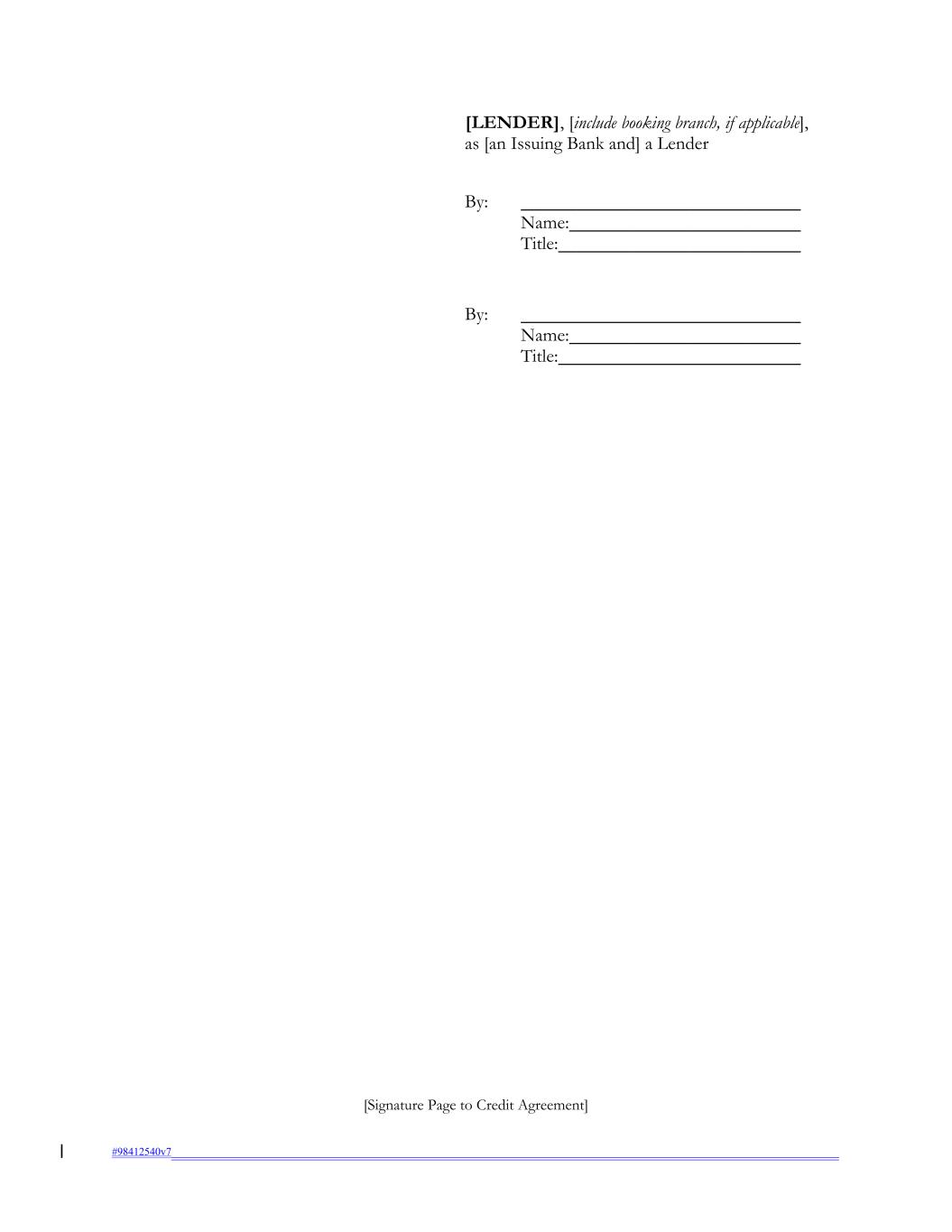 [Signature Page to Credit Agreement] #98412540v7 [LENDER], [include booking branch, if applicable], as [an Issuing Bank and] a Lender Name: Title: By: By: Name: Title: