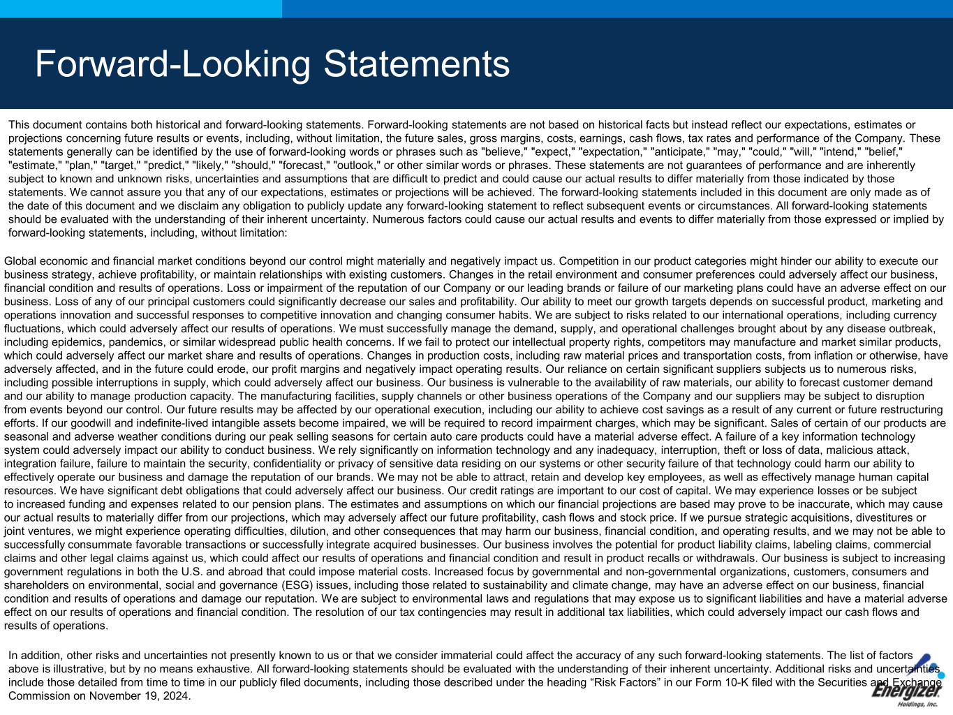 This document contains both historical and forward-looking statements. Forward-looking statements are not based on historical facts but instead reflect our expectations, estimates or projections concerning future results or events, including, without limitation, the future sales, gross margins, costs, earnings, cash flows, tax rates and performance of the Company. These statements generally can be identified by the use of forward-looking words or phrases such as "believe," "expect," "expectation," "anticipate," "may," "could," "will," "intend," "belief," "estimate," "plan," "target," "predict," "likely," "should," "forecast," "outlook," or other similar words or phrases. These statements are not guarantees of performance and are inherently subject to known and unknown risks, uncertainties and assumptions that are difficult to predict and could cause our actual results to differ materially from those indicated by those statements. We cannot assure you that any of our expectations, estimates or projections will be achieved. The forward-looking statements included in this document are only made as of the date of this document and we disclaim any obligation to publicly update any forward-looking statement to reflect subsequent events or circumstances. All forward-looking statements should be evaluated with the understanding of their inherent uncertainty. Numerous factors could cause our actual results and events to differ materially from those expressed or implied by forward-looking statements, including, without limitation: Global economic and financial market conditions beyond our control might materially and negatively impact us. Competition in our product categories might hinder our ability to execute our business strategy, achieve profitability, or maintain relationships with existing customers. Changes in the retail environment and consumer preferences could adversely affect our business, financial condition and results of operations. Loss or impairment of the reputation of our Company or our leading brands or failure of our marketing plans could have an adverse effect on our business. Loss of any of our principal customers could significantly decrease our sales and profitability. Our ability to meet our growth targets depends on successful product, marketing and operations innovation and successful responses to competitive innovation and changing consumer habits. We are subject to risks related to our international operations, including currency fluctuations, which could adversely affect our results of operations. We must successfully manage the demand, supply, and operational challenges brought about by any disease outbreak, including epidemics, pandemics, or similar widespread public health concerns. If we fail to protect our intellectual property rights, competitors may manufacture and market similar products, which could adversely affect our market share and results of operations. Changes in production costs, including raw material prices and transportation costs, from inflation or otherwise, have adversely affected, and in the future could erode, our profit margins and negatively impact operating results. Our reliance on certain significant suppliers subjects us to numerous risks, including possible interruptions in supply, which could adversely affect our business. Our business is vulnerable to the availability of raw materials, our ability to forecast customer demand and our ability to manage production capacity. The manufacturing facilities, supply channels or other business operations of the Company and our suppliers may be subject to disruption from events beyond our control. Our future results may be affected by our operational execution, including our ability to achieve cost savings as a result of any current or future restructuring efforts. If our goodwill and indefinite-lived intangible assets become impaired, we will be required to record impairment charges, which may be significant. Sales of certain of our products are seasonal and adverse weather conditions during our peak selling seasons for certain auto care products could have a material adverse effect. A failure of a key information technology system could adversely impact our ability to conduct business. We rely significantly on information technology and any inadequacy, interruption, theft or loss of data, malicious attack, integration failure, failure to maintain the security, confidentiality or privacy of sensitive data residing on our systems or other security failure of that technology could harm our ability to effectively operate our business and damage the reputation of our brands. We may not be able to attract, retain and develop key employees, as well as effectively manage human capital resources. We have significant debt obligations that could adversely affect our business. Our credit ratings are important to our cost of capital. We may experience losses or be subject to increased funding and expenses related to our pension plans. The estimates and assumptions on which our financial projections are based may prove to be inaccurate, which may cause our actual results to materially differ from our projections, which may adversely affect our future profitability, cash flows and stock price. If we pursue strategic acquisitions, divestitures or joint ventures, we might experience operating difficulties, dilution, and other consequences that may harm our business, financial condition, and operating results, and we may not be able to successfully consummate favorable transactions or successfully integrate acquired businesses. Our business involves the potential for product liability claims, labeling claims, commercial claims and other legal claims against us, which could affect our results of operations and financial condition and result in product recalls or withdrawals. Our business is subject to increasing government regulations in both the U.S. and abroad that could impose material costs. Increased focus b