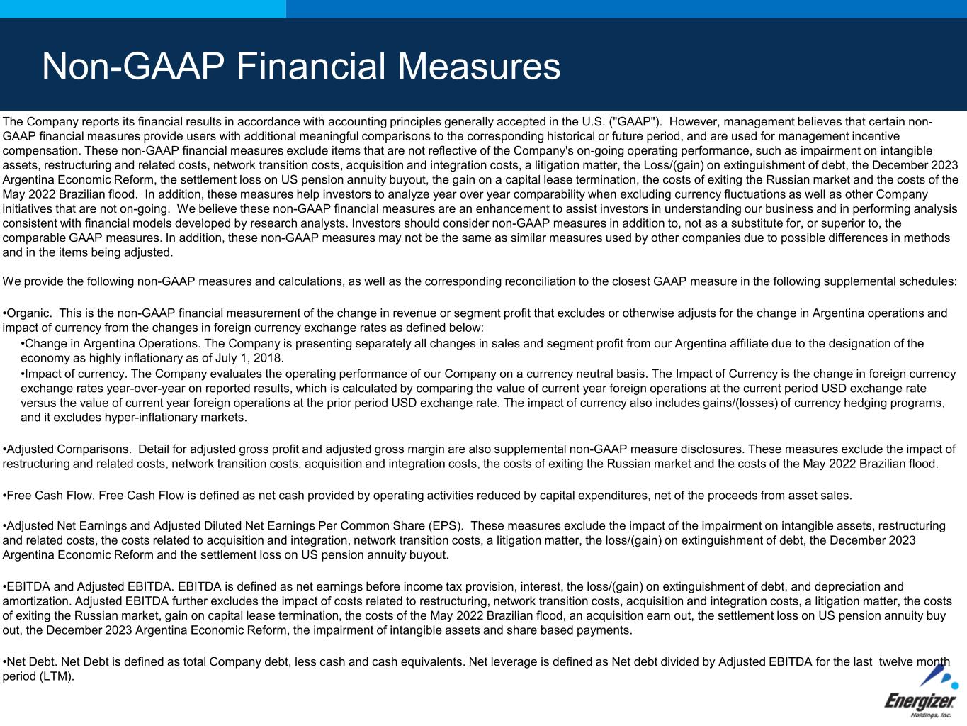 Non-GAAP Financial Measures The Company reports its financial results in accordance with accounting principles generally accepted in the U.S. ("GAAP"). However, management believes that certain non- GAAP financial measures provide users with additional meaningful comparisons to the corresponding historical or future period, and are used for management incentive compensation. These non-GAAP financial measures exclude items that are not reflective of the Company's on-going operating performance, such as impairment on intangible assets, restructuring and related costs, network transition costs, acquisition and integration costs, a litigation matter, the Loss/(gain) on extinguishment of debt, the December 2023 Argentina Economic Reform, the settlement loss on US pension annuity buyout, the gain on a capital lease termination, the costs of exiting the Russian market and the costs of the May 2022 Brazilian flood. In addition, these measures help investors to analyze year over year comparability when excluding currency fluctuations as well as other Company initiatives that are not on-going. We believe these non-GAAP financial measures are an enhancement to assist investors in understanding our business and in performing analysis consistent with financial models developed by research analysts. Investors should consider non-GAAP measures in addition to, not as a substitute for, or superior to, the comparable GAAP measures. In addition, these non-GAAP measures may not be the same as similar measures used by other companies due to possible differences in methods and in the items being adjusted. We provide the following non-GAAP measures and calculations, as well as the corresponding reconciliation to the closest GAAP measure in the following supplemental schedules: •Organic. This is the non-GAAP financial measurement of the change in revenue or segment profit that excludes or otherwise adjusts for the change in Argentina operations and impact of currency from the changes in foreign currency exchange rates as defined below: •Change in Argentina Operations. The Company is presenting separately all changes in sales and segment profit from our Argentina affiliate due to the designation of the economy as highly inflationary as of July 1, 2018. •Impact of currency. The Company evaluates the operating performance of our Company on a currency neutral basis. The Impact of Currency is the change in foreign currency exchange rates year-over-year on reported results, which is calculated by comparing the value of current year foreign operations at the current period USD exchange rate versus the value of current year foreign operations at the prior period USD exchange rate. The impact of currency also includes gains/(losses) of currency hedging programs, and it excludes hyper-inflationary markets. •Adjusted Comparisons. Detail for adjusted gross profit and adjusted gross margin are also supplemental non-GAAP measure disclosures. These measures exclude the impact of restructuring and related costs, network transition costs, acquisition and integration costs, the costs of exiting the Russian market and the costs of the May 2022 Brazilian flood. •Free Cash Flow. Free Cash Flow is defined as net cash provided by operating activities reduced by capital expenditures, net of the proceeds from asset sales. •Adjusted Net Earnings and Adjusted Diluted Net Earnings Per Common Share (EPS). These measures exclude the impact of the impairment on intangible assets, restructuring and related costs, the costs related to acquisition and integration, network transition costs, a litigation matter, the loss/(gain) on extinguishment of debt, the December 2023 Argentina Economic Reform and the settlement loss on US pension annuity buyout. •EBITDA and Adjusted EBITDA. EBITDA is defined as net earnings before income tax provision, interest, the loss/(gain) on extinguishment of debt, and depreciation and amortization. Adjusted EBITDA further excludes the impact of costs related to restructuring, network transition costs, acquisition and integration costs, a litigation matter, the costs of exiting the Russian market, gain on capital lease termination, the costs of the May 2022 Brazilian flood, an acquisition earn out, the settlement loss on US pension annuity buy out, the December 2023 Argentina Economic Reform, the impairment of intangible assets and share based payments. •Net Debt. Net Debt is defined as total Company debt, less cash and cash equivalents. Net leverage is defined as Net debt divided by Adjusted EBITDA for the last twelve month period (LTM).