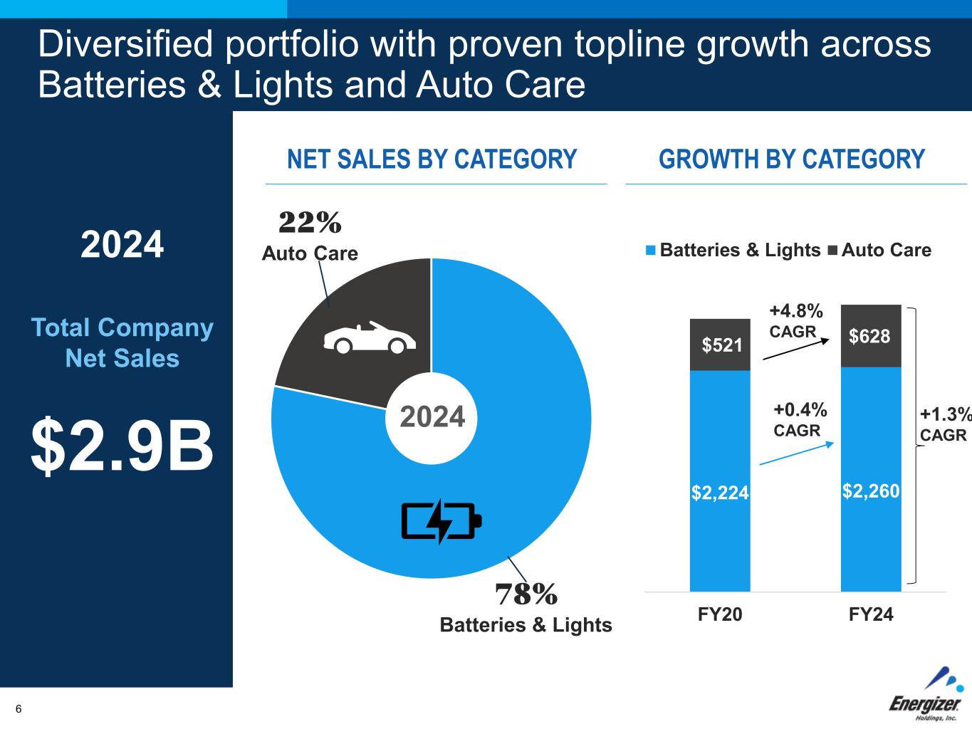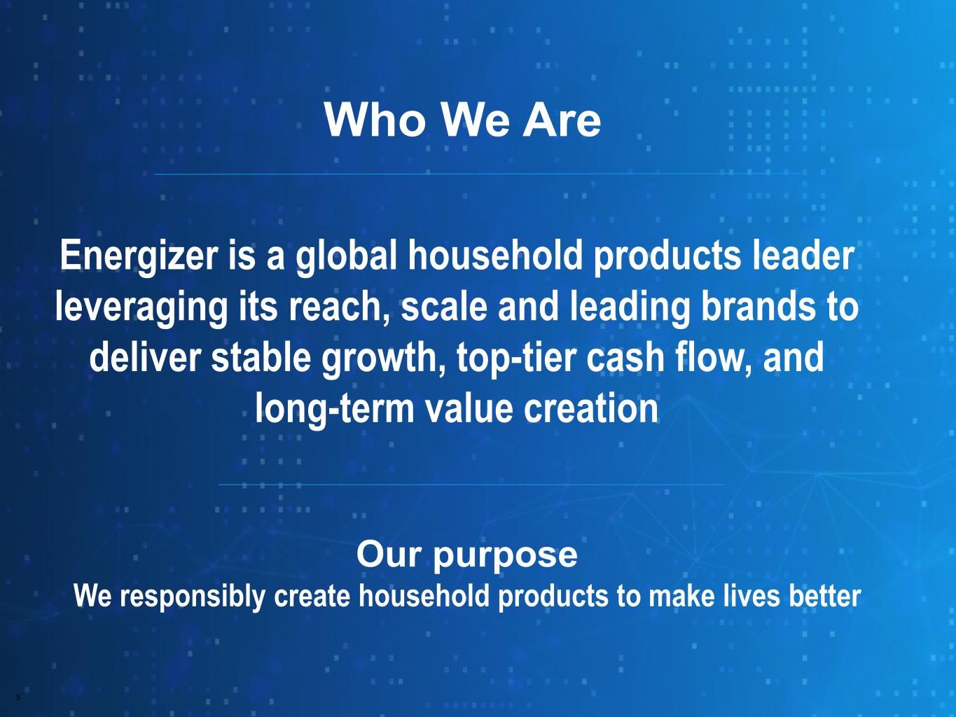 5 Energizer is a global household products leader leveraging its reach, scale and leading brands to deliver stable growth, top-tier cash flow, and long-term value creation Who We Are Our purpose We responsibly create household products to make lives better