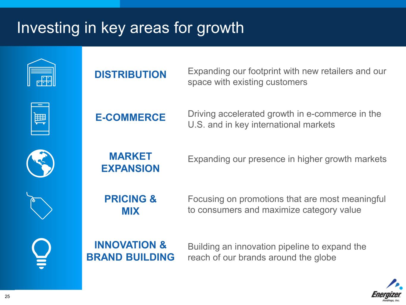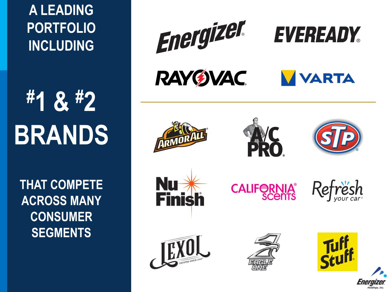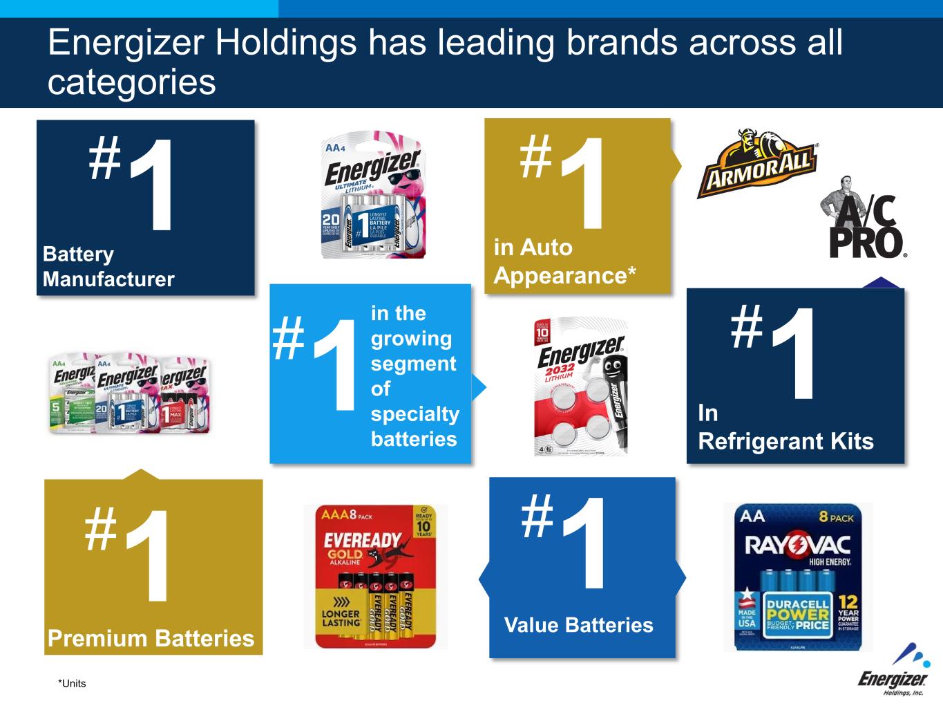 FOR INTERNAL USE ONLY – DO NOT DISTRIBUTE Energizer Holdings has leading brands across all categories #1 In Refrigerant Kits in Auto Appearance* #1 #1 Value Batteries #1 in the growing segment of specialty batteries Premium Batteries #1 #1 Battery Manufacturer *Units