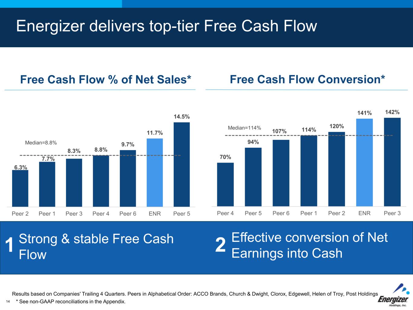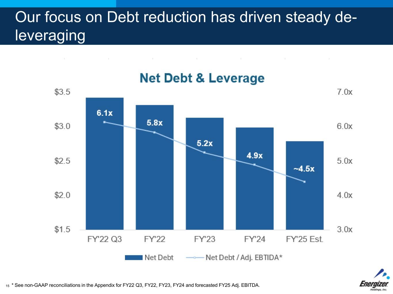 FOR INTERNAL USE ONLY – DO NOT DISTRIBUTE14 Energizer delivers top-tier Free Cash Flow Results based on Companies' Trailing 4 Quarters. Peers in Alphabetical Order: ACCO Brands, Church & Dwight, Clorox, Edgewell, Helen of Troy, Post Holdings Free Cash Flow Conversion* * See non-GAAP reconciliations in the Appendix. 1 2 Effective conversion of Net Earnings into Cash Strong & stable Free Cash Flow 6.3% 7.7% 8.3% 8.8% 9.7% 11.7% 14.5% Median=8.8% Peer 2 Peer 1 Peer 3 Peer 4 Peer 6 ENR Peer 5 70% 94% 107% 114% 120% 141% 142% Median=114% Peer 4 Peer 5 Peer 6 Peer 1 Peer 2 ENR Peer 3 Free Cash Flow % of Net Sales*
