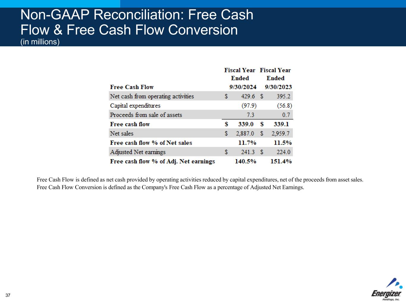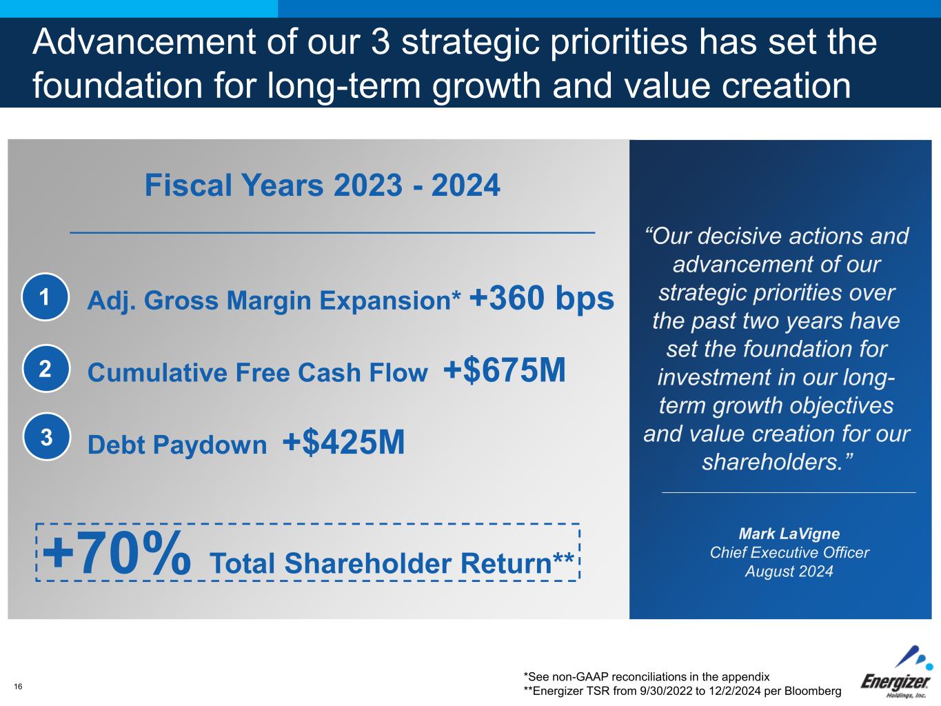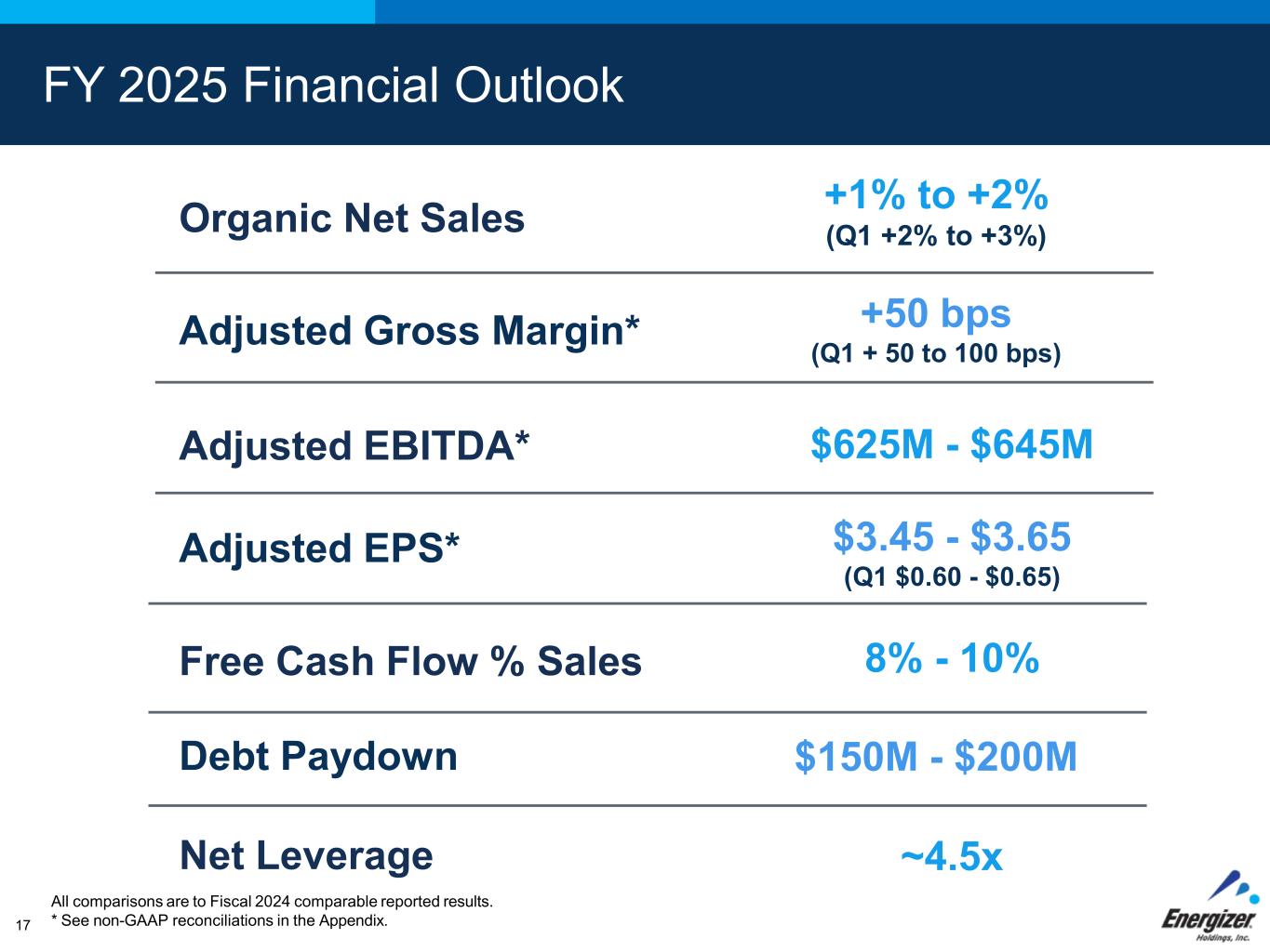 FOR INTERNAL USE ONLY – DO NOT DISTRIBUTE16 Advancement of our 3 strategic priorities has set the foundation for long-term growth and value creation Adj. Gross Margin Expansion* +360 bps Cumulative Free Cash Flow +$675M Debt Paydown +$425M +70% Total Shareholder Return** 1 3 2 Fiscal Years 2023 - 2024 *See non-GAAP reconciliations in the appendix **Energizer TSR from 9/30/2022 to 12/2/2024 per Bloomberg Mark LaVigne Chief Executive Officer August 2024 “Our decisive actions and advancement of our strategic priorities over the past two years have set the foundation for investment in our long- term growth objectives and value creation for our shareholders.”