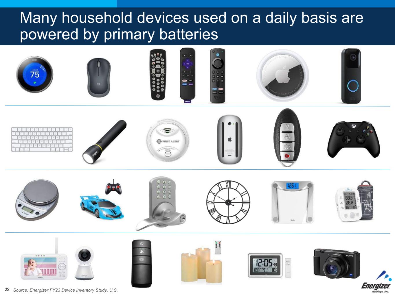 Many household devices used on a daily basis are powered by primary batteries Source: Energizer FY23 Device Inventory Study, U.S.22