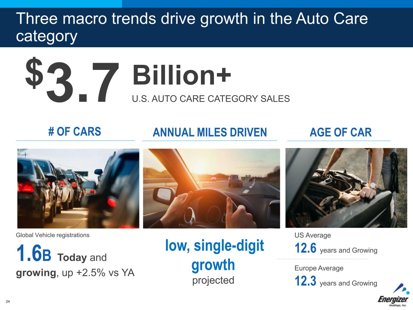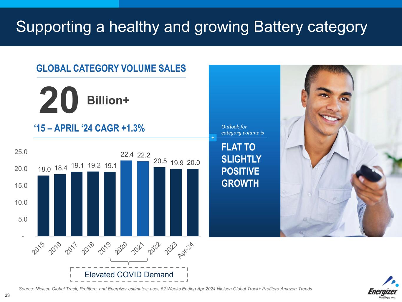 FOR INTERNAL USE ONLY – DO NOT DISTRIBUTE Supporting a healthy and growing Battery category 18.0 18.4 19.1 19.2 19.1 22.4 22.2 20.5 19.9 20.0 - 5.0 10.0 15.0 20.0 25.0 Source: Nielsen Global Track, Profitero, and Energizer estimates; uses 52 Weeks Ending Apr 2024 Nielsen Global Track+ Profitero Amazon Trends 23 Elevated COVID Demand GLOBAL CATEGORY VOLUME SALES 20 Billion+ ‘15 – APRIL ‘24 CAGR +1.3% + Outlook for category volume is FLAT TO SLIGHTLY POSITIVE GROWTH