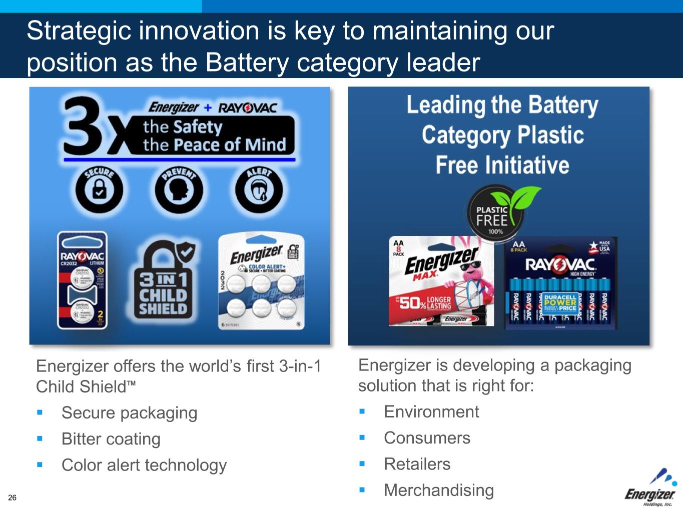 FOR INTERNAL USE ONLY – DO NOT DISTRIBUTE Strategic innovation is key to maintaining our position as the Battery category leader Energizer is developing a packaging solution that is right for:  Environment  Consumers  Retailers  Merchandising26 Energizer offers the world’s first 3-in-1 Child Shield™  Secure packaging  Bitter coating  Color alert technology
