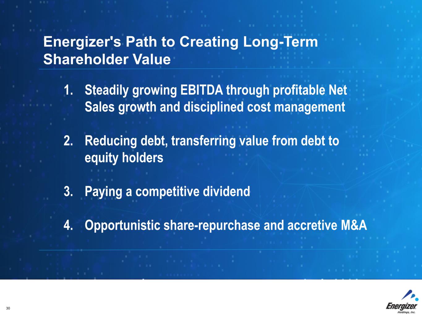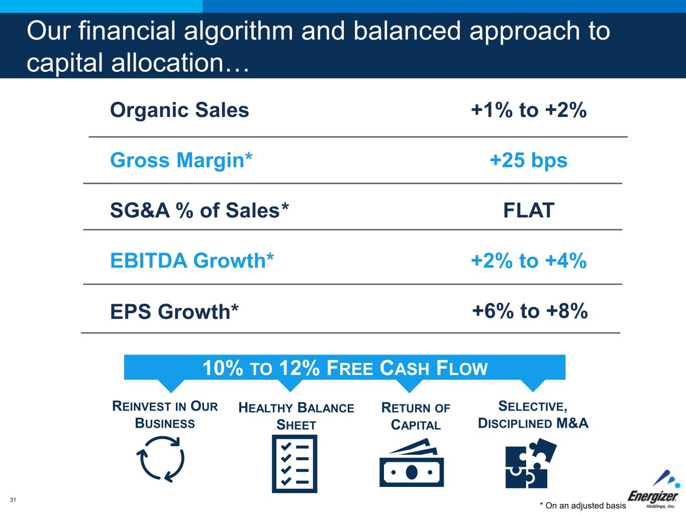 FOR INTERNAL USE ONLY – DO NOT DISTRIBUTE30 1. Steadily growing EBITDA through profitable Net Sales growth and disciplined cost management 2. Reducing debt, transferring value from debt to equity holders 3. Paying a competitive dividend 4. Opportunistic share-repurchase and accretive M&A Energizer's Path to Creating Long-Term Shareholder Value
