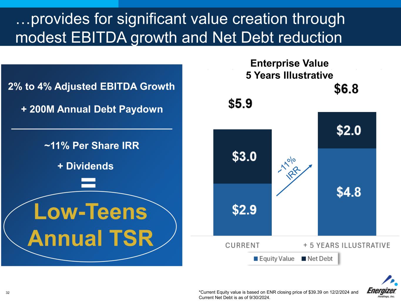 FOR INTERNAL USE ONLY – DO NOT DISTRIBUTE32 …provides for significant value creation through modest EBITDA growth and Net Debt reduction 2% to 4% Adjusted EBITDA Growth + 200M Annual Debt Paydown ~11% Per Share IRR + Dividends Low-Teens Annual TSR = *Current Equity value is based on ENR closing price of $39.39 on 12/2/2024 and Current Net Debt is as of 9/30/2024. Enterprise Value 5 Years Illustrative