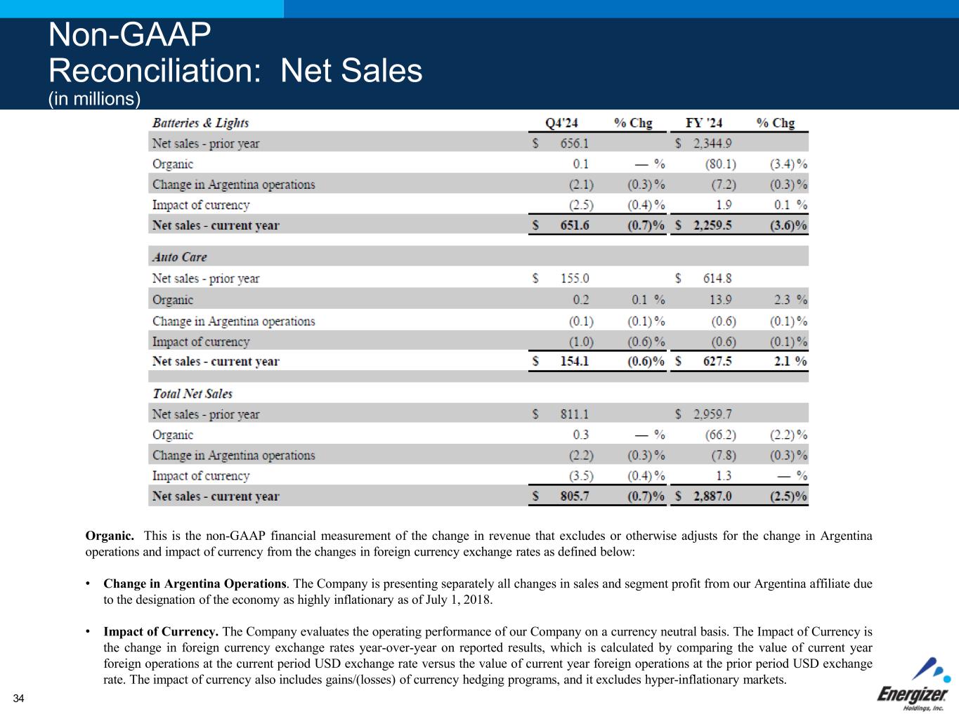 Non-GAAP Reconciliation: Net Sales (in millions) Organic. This is the non-GAAP financial measurement of the change in revenue that excludes or otherwise adjusts for the change in Argentina operations and impact of currency from the changes in foreign currency exchange rates as defined below: • Change in Argentina Operations. The Company is presenting separately all changes in sales and segment profit from our Argentina affiliate due to the designation of the economy as highly inflationary as of July 1, 2018. • Impact of Currency. The Company evaluates the operating performance of our Company on a currency neutral basis. The Impact of Currency is the change in foreign currency exchange rates year-over-year on reported results, which is calculated by comparing the value of current year foreign operations at the current period USD exchange rate versus the value of current year foreign operations at the prior period USD exchange rate. The impact of currency also includes gains/(losses) of currency hedging programs, and it excludes hyper-inflationary markets. 34