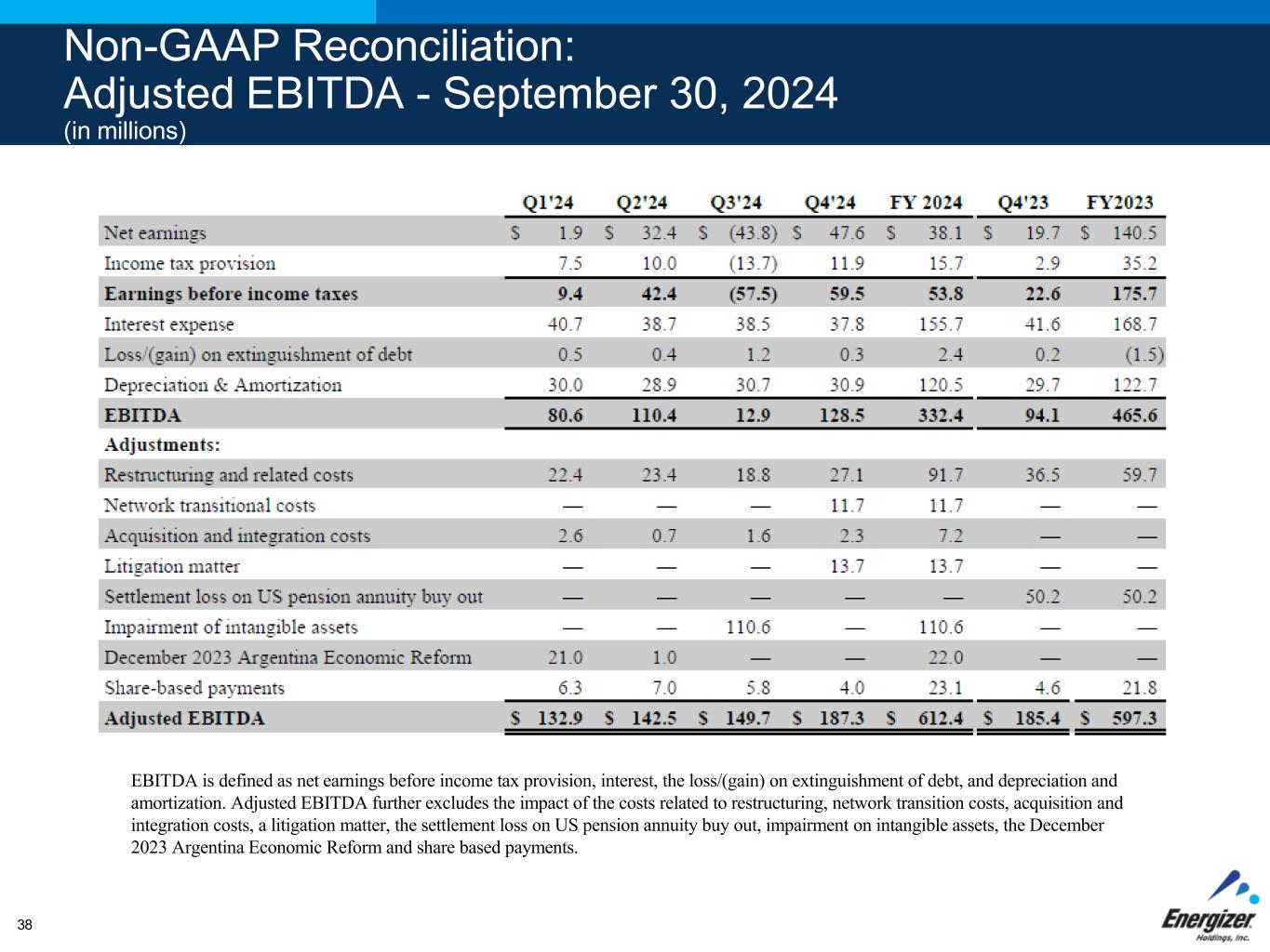 Non-GAAP Reconciliation: Adjusted Earnings Per Share (in millions, except per share data) Adjusted Net Earnings and Adjusted Diluted Net Earnings Per Common Share (EPS). These measures exclude the impact of restructuring and related costs, network transition costs, the costs related to acquisition and integration, a litigation matter, impairment of intangible assets, the loss/(gain) on extinguishment of debt, the December 2023 Argentina Economic Reform and Settlement loss on US pension annuity buy out. The effective tax rate for the Adjusted Net earnings and Adjusted Diluted EPS for the quarters ended September 30, 2024 and 2023 was 22.1% and 20.7%, respectively, and for the twelve months ended September 30, 2024 and 2023 was 22.9% and 21.2%, respectively, as calculated utilizing the statutory rate for where the costs were incurred. 36