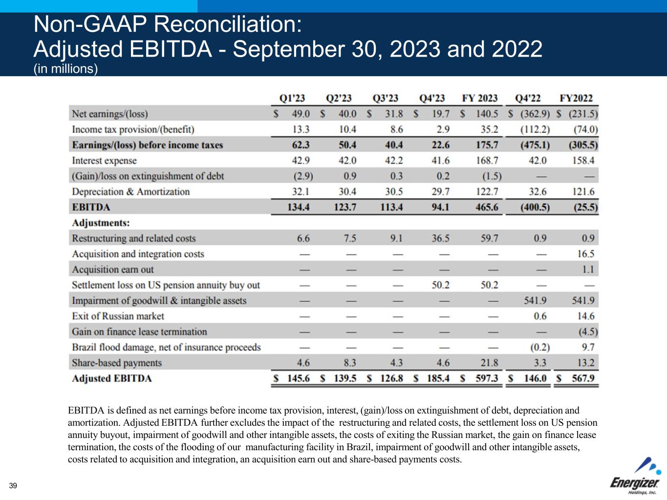 Non-GAAP Reconciliation: Adjusted EBITDA - September 30, 2023 and 2022 (in millions) EBITDA is defined as net earnings before income tax provision, interest, (gain)/loss on extinguishment of debt, depreciation and amortization. Adjusted EBITDA further excludes the impact of the restructuring and related costs, the settlement loss on US pension annuity buyout, impairment of goodwill and other intangible assets, the costs of exiting the Russian market, the gain on finance lease termination, the costs of the flooding of our manufacturing facility in Brazil, impairment of goodwill and other intangible assets, costs related to acquisition and integration, an acquisition earn out and share-based payments costs. 39