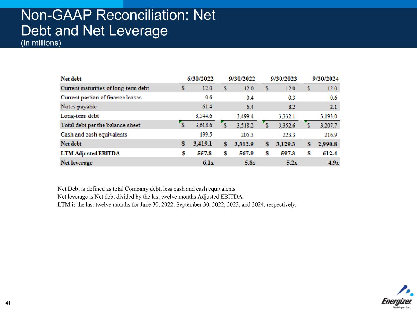 Non-GAAP Reconciliation: Net Debt and Net Leverage (in millions) Net Debt is defined as total Company debt, less cash and cash equivalents. Net leverage is Net debt divided by the last twelve months Adjusted EBITDA. LTM is the last twelve months for June 30, 2022, September 30, 2022, 2023, and 2024, respectively. 41
