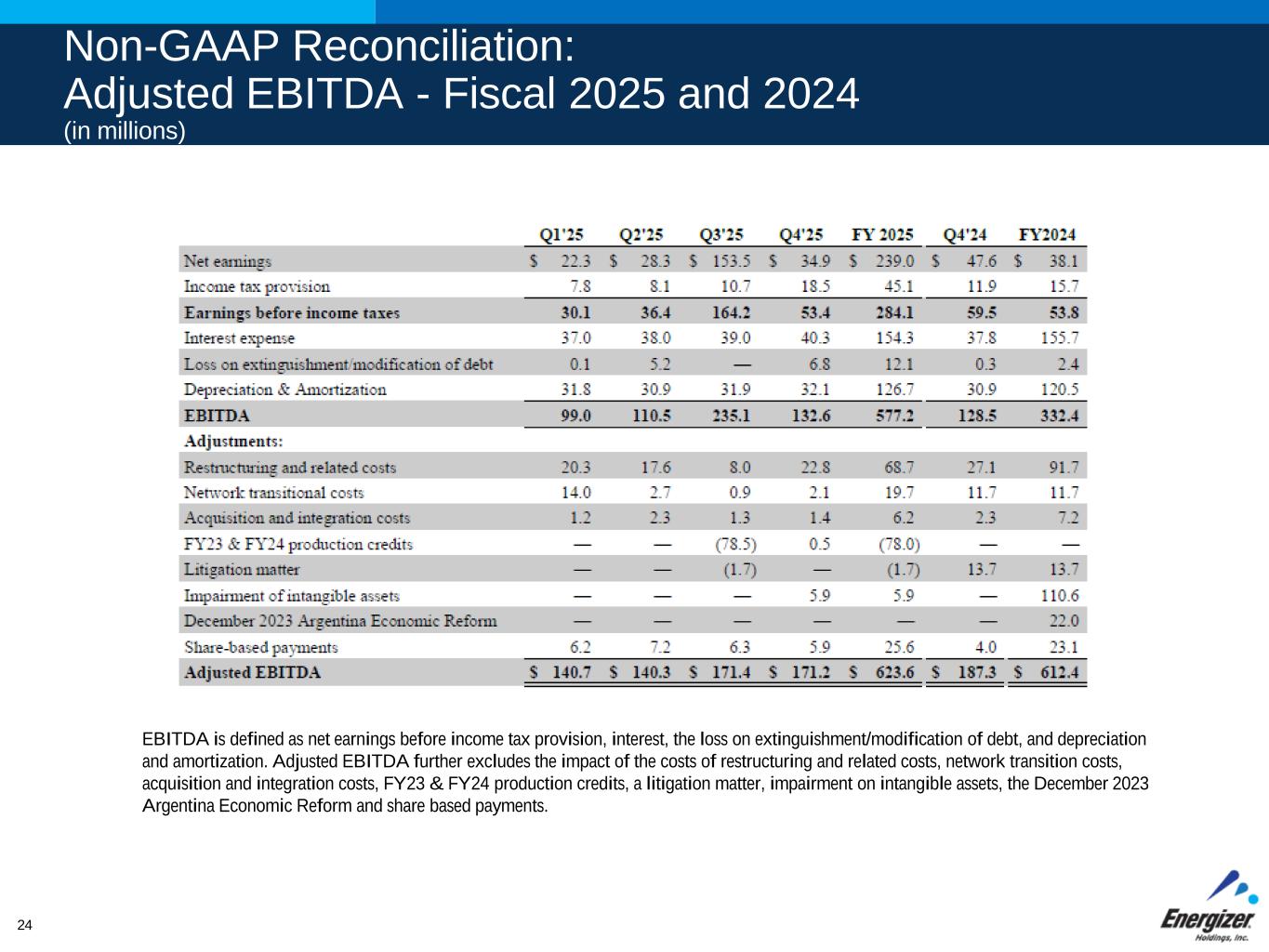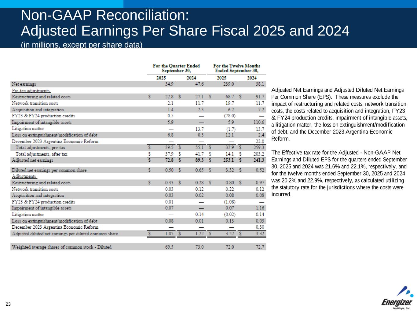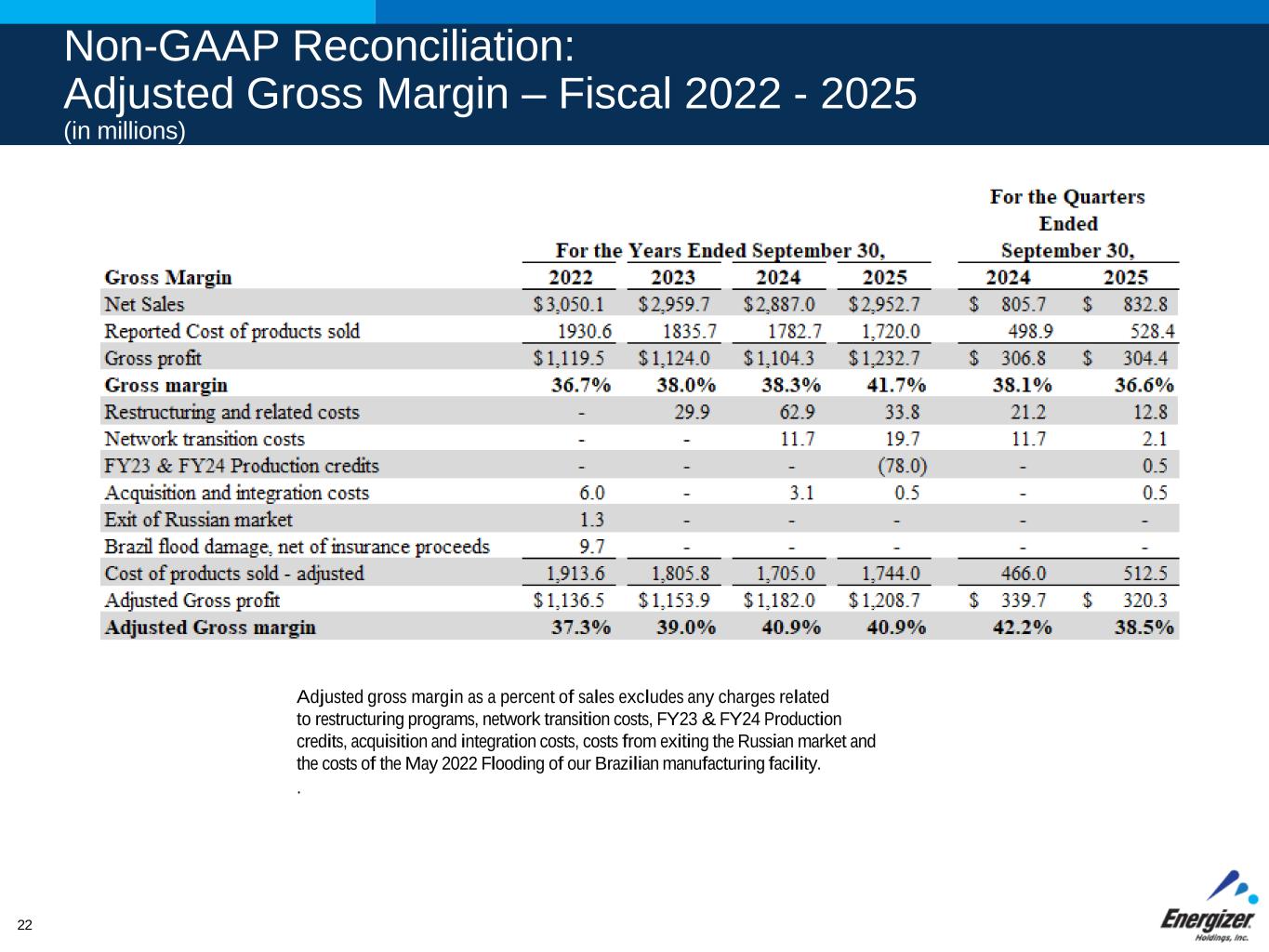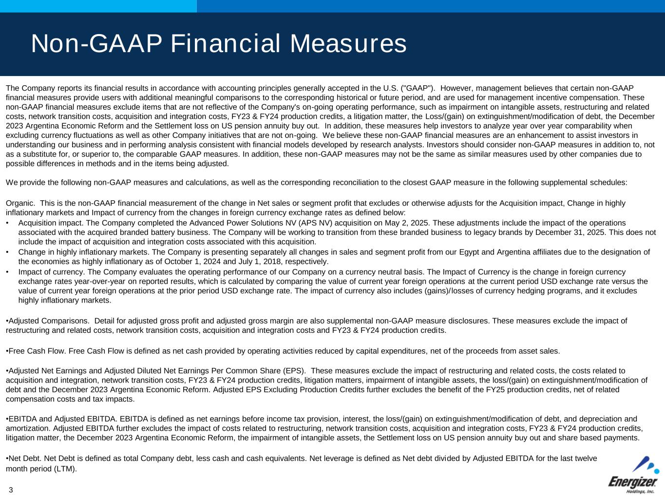 Non-GAAP Financial Measures The Company reports its financial results in accordance with accounting principles generally accepted in the U.S. ("GAAP"). However, management believes that certain non-GAAP financial measures provide users with additional meaningful comparisons to the corresponding historical or future period, and are used for management incentive compensation. These non-GAAP financial measures exclude items that are not reflective of the Company's on-going operating performance, such as impairment on intangible assets, restructuring and related costs, network transition costs, acquisition and integration costs, FY23 & FY24 production credits, a litigation matter, the Loss/(gain) on extinguishment/modification of debt, the December 2023 Argentina Economic Reform and the Settlement loss on US pension annuity buy out. In addition, these measures help investors to analyze year over year comparability when excluding currency fluctuations as well as other Company initiatives that are not on-going. We believe these non-GAAP financial measures are an enhancement to assist investors in understanding our business and in performing analysis consistent with financial models developed by research analysts. Investors should consider non-GAAP measures in addition to, not as a substitute for, or superior to, the comparable GAAP measures. In addition, these non-GAAP measures may not be the same as similar measures used by other companies due to possible differences in methods and in the items being adjusted. We provide the following non-GAAP measures and calculations, as well as the corresponding reconciliation to the closest GAAP measure in the following supplemental schedules: Organic. This is the non-GAAP financial measurement of the change in Net sales or segment profit that excludes or otherwise adjusts for the Acquisition impact, Change in highly inflationary markets and Impact of currency from the changes in foreign currency exchange rates as defined below: • Acquisition impact. The Company completed the Advanced Power Solutions NV (APS NV) acquisition on May 2, 2025. These adjustments include the impact of the operations associated with the acquired branded battery business. The Company will be working to transition from these branded business to legacy brands by December 31, 2025. This does not include the impact of acquisition and integration costs associated with this acquisition. • Change in highly inflationary markets. The Company is presenting separately all changes in sales and segment profit from our Egypt and Argentina affiliates due to the designation of the economies as highly inflationary as of October 1, 2024 and July 1, 2018, respectively. • Impact of currency. The Company evaluates the operating performance of our Company on a currency neutral basis. The Impact of Currency is the change in foreign currency exchange rates year-over-year on reported results, which is calculated by comparing the value of current year foreign operations at the current period USD exchange rate versus the value of current year foreign operations at the prior period USD exchange rate. The impact of currency also includes (gains)/ losses of currency hedging programs, and it excludes highly inflationary markets. •Adjusted Comparisons. Detail for adjusted gross profit and adjusted gross margin are also supplemental non-GAAP measure disclosures. These measures exclude the impact of restructuring and related costs, network transition costs, acquisition and integration costs and FY23 & FY24 production credits. •Free Cash Flow. Free Cash Flow is defined as net cash provided by operating activities reduced by capital expenditures, net of the proceeds from asset sales. •Adjusted Net Earnings and Adjusted Diluted Net Earnings Per Common Share (EPS). These measures exclude the impact of restructuring and related costs, the costs related to acquisition and integration, network transition costs, FY23 & FY24 production credits, litigation matters, impairment of intangible assets, the loss/(gain) on extinguishment/modification of debt and the December 2023 Argentina Economic Reform. Adjusted EPS Excluding Production Credits further excludes the benefit of the FY25 production credits, net of related compensation costs and tax impacts. •EBITDA and Adjusted EBITDA. EBITDA is defined as net earnings before income tax provision, interest, the loss/(gain) on extinguishment/modification of debt, and depreciation and amortization. Adjusted EBITDA further excludes the impact of costs related to restructuring, network transition costs, acquisition and integration costs, FY23 & FY24 production credits, litigation matter, the December 2023 Argentina Economic Reform, the impairment of intangible assets, the Settlement loss on US pension annuity buy out and share based payments. •Net Debt. Net Debt is defined as total Company debt, less cash and cash equivalents. Net leverage is defined as Net debt divided by Adjusted EBITDA for the last twelve month period (LTM). 3