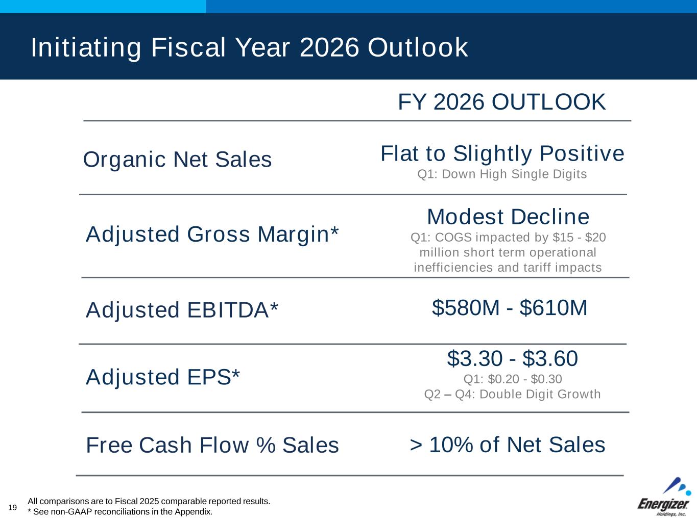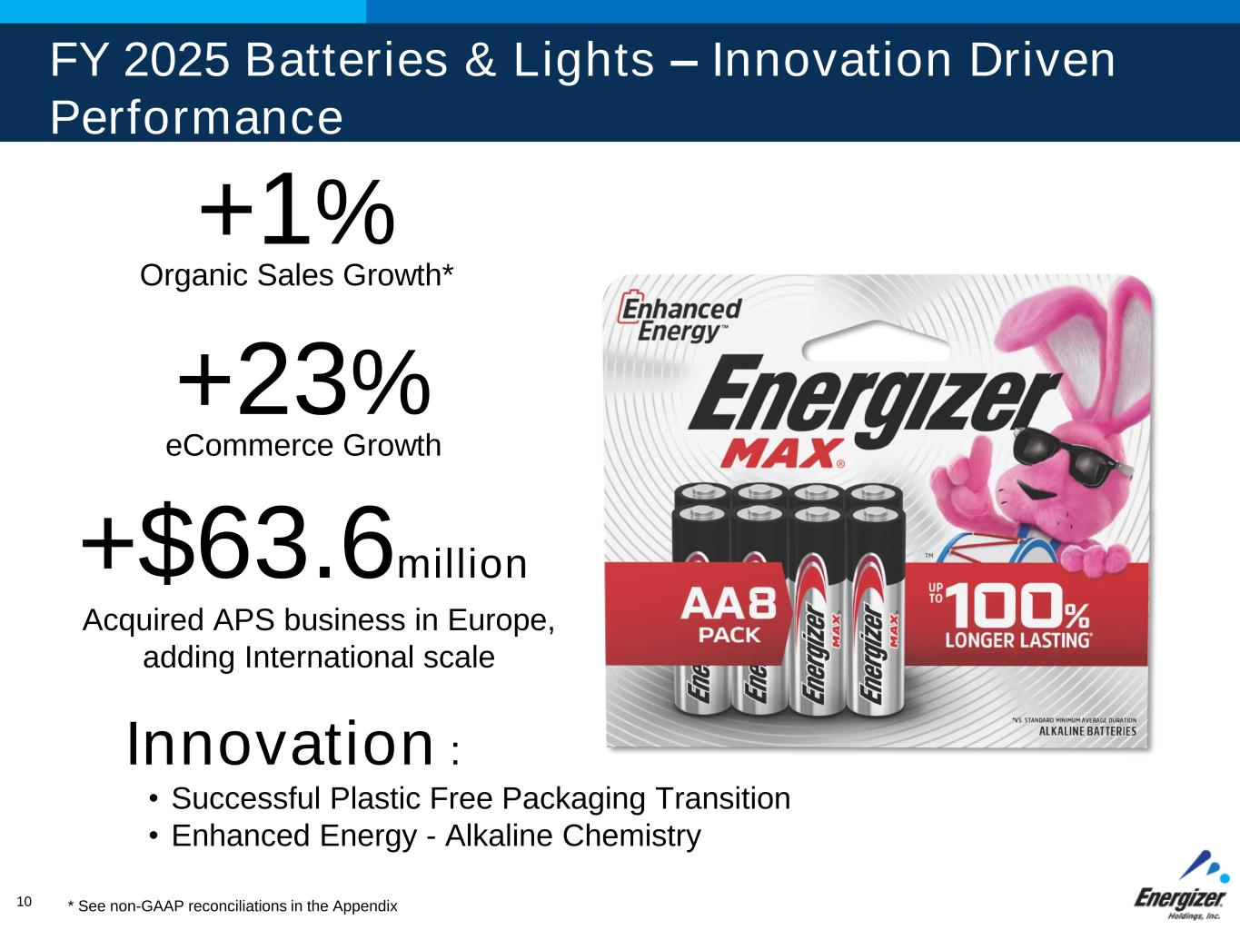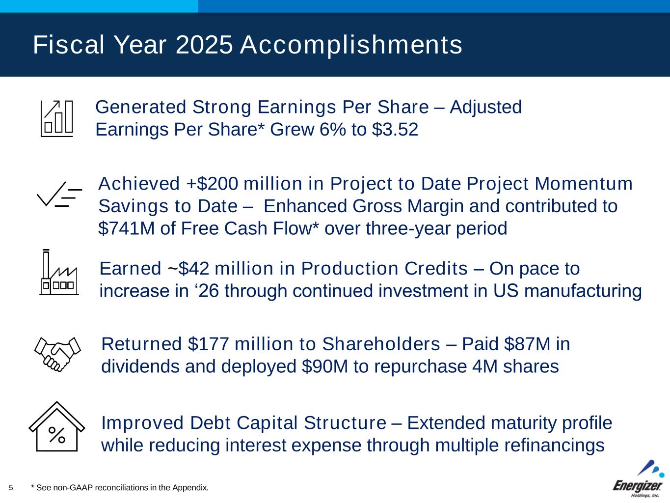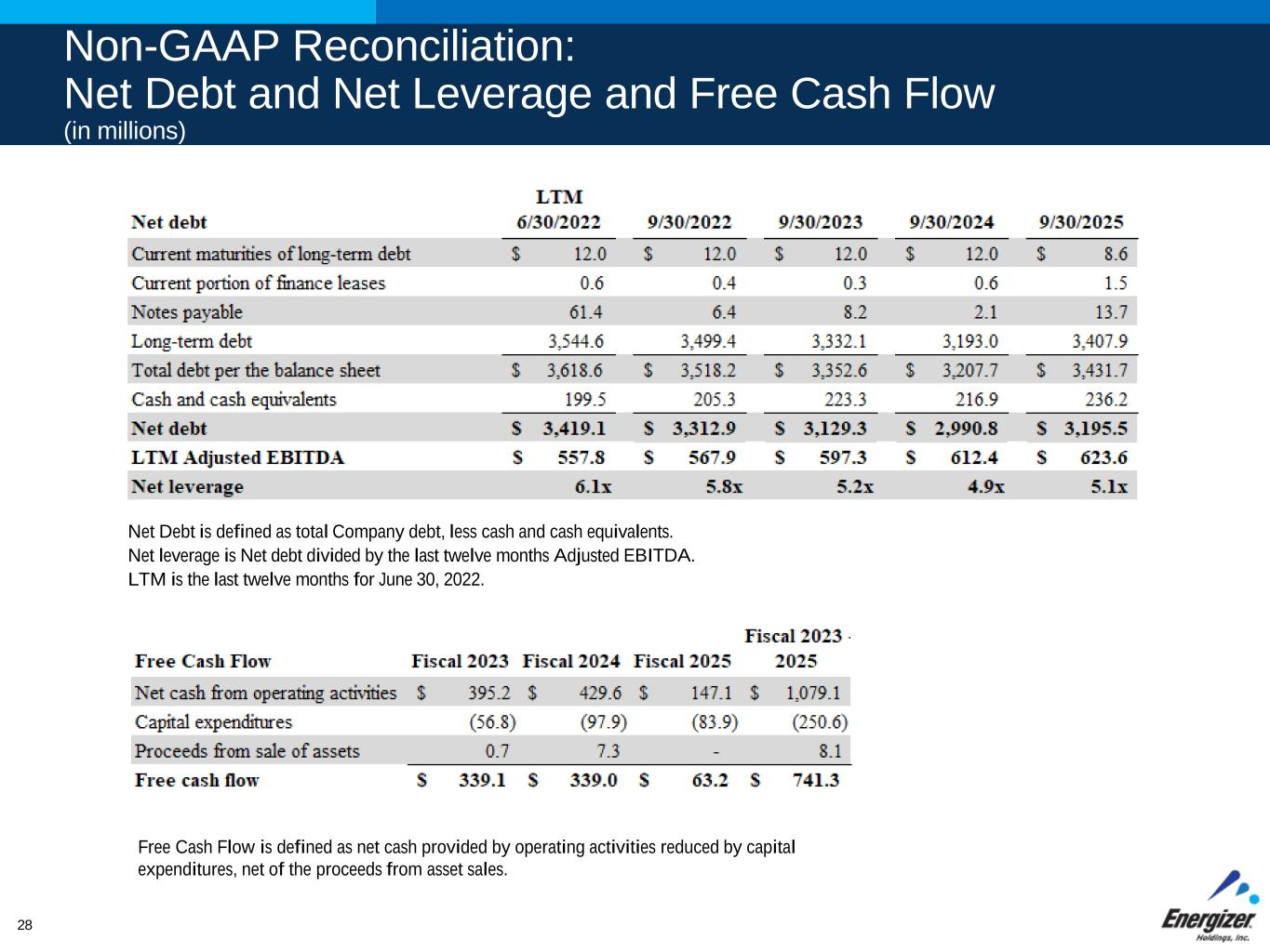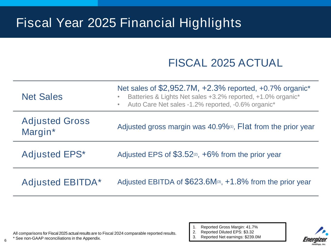 Non-GAAP Financial Measures The Company reports its financial results in accordance with accounting principles generally accepted in the U.S. ("GAAP"). However, management believes that certain non-GAAP financial measures provide users with additional meaningful comparisons to the corresponding historical or future period, and are used for management incentive compensation. These non-GAAP financial measures exclude items that are not reflective of the Company's on-going operating performance, such as impairment on intangible assets, restructuring and related costs, network transition costs, acquisition and integration costs, FY23 & FY24 production credits, a litigation matter, the Loss/(gain) on extinguishment/modification of debt, the December 2023 Argentina Economic Reform and the Settlement loss on US pension annuity buy out. In addition, these measures help investors to analyze year over year comparability when excluding currency fluctuations as well as other Company initiatives that are not on-going. We believe these non-GAAP financial measures are an enhancement to assist investors in understanding our business and in performing analysis consistent with financial models developed by research analysts. Investors should consider non-GAAP measures in addition to, not as a substitute for, or superior to, the comparable GAAP measures. In addition, these non-GAAP measures may not be the same as similar measures used by other companies due to possible differences in methods and in the items being adjusted. We provide the following non-GAAP measures and calculations, as well as the corresponding reconciliation to the closest GAAP measure in the following supplemental schedules: Organic. This is the non-GAAP financial measurement of the change in Net sales or segment profit that excludes or otherwise adjusts for the Acquisition impact, Change in highly inflationary markets and Impact of currency from the changes in foreign currency exchange rates as defined below: • Acquisition impact. The Company completed the Advanced Power Solutions NV (APS NV) acquisition on May 2, 2025. These adjustments include the impact of the operations associated with the acquired branded battery business. The Company will be working to transition from these branded business to legacy brands by December 31, 2025. This does not include the impact of acquisition and integration costs associated with this acquisition. • Change in highly inflationary markets. The Company is presenting separately all changes in sales and segment profit from our Egypt and Argentina affiliates due to the designation of the economies as highly inflationary as of October 1, 2024 and July 1, 2018, respectively. • Impact of currency. The Company evaluates the operating performance of our Company on a currency neutral basis. The Impact of Currency is the change in foreign currency exchange rates year-over-year on reported results, which is calculated by comparing the value of current year foreign operations at the current period USD exchange rate versus the value of current year foreign operations at the prior period USD exchange rate. The impact of currency also includes (gains)/ losses of currency hedging programs, and it excludes highly inflationary markets. •Adjusted Comparisons. Detail for adjusted gross profit and adjusted gross margin are also supplemental non-GAAP measure disclosures. These measures exclude the impact of restructuring and related costs, network transition costs, acquisition and integration costs and FY23 & FY24 production credits. •Free Cash Flow. Free Cash Flow is defined as net cash provided by operating activities reduced by capital expenditures, net of the proceeds from asset sales. •Adjusted Net Earnings and Adjusted Diluted Net Earnings Per Common Share (EPS). These measures exclude the impact of restructuring and related costs, the costs related to acquisition and integration, network transition costs, FY23 & FY24 production credits, litigation matters, impairment of intangible assets, the loss/(gain) on extinguishment/modification of debt and the December 2023 Argentina Economic Reform. Adjusted EPS Excluding Production Credits further excludes the benefit of the FY25 production credits, net of related compensation costs and tax impacts. •EBITDA and Adjusted EBITDA. EBITDA is defined as net earnings before income tax provision, interest, the loss/(gain) on extinguishment/modification of debt, and depreciation and amortization. Adjusted EBITDA further excludes the impact of costs related to restructuring, network transition costs, acquisition and integration costs, FY23 & FY24 production credits, litigation matter, the December 2023 Argentina Economic Reform, the impairment of intangible assets, the Settlement loss on US pension annuity buy out and share based payments. •Net Debt. Net Debt is defined as total Company debt, less cash and cash equivalents. Net leverage is defined as Net debt divided by Adjusted EBITDA for the last twelve month period (LTM). 3