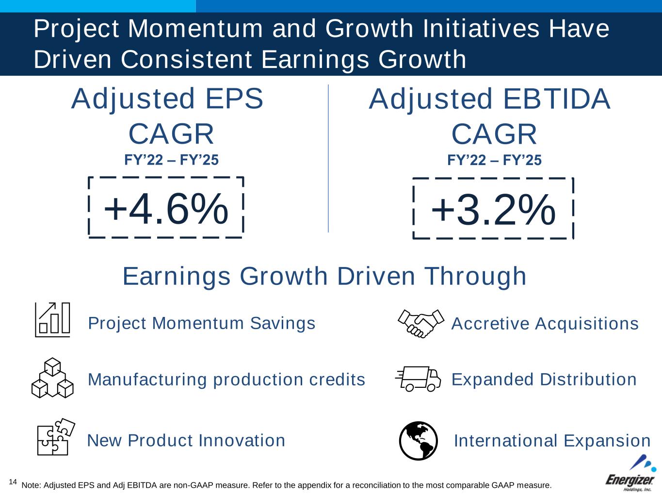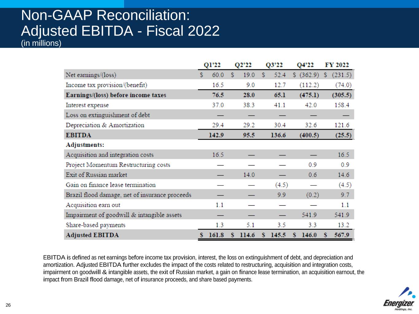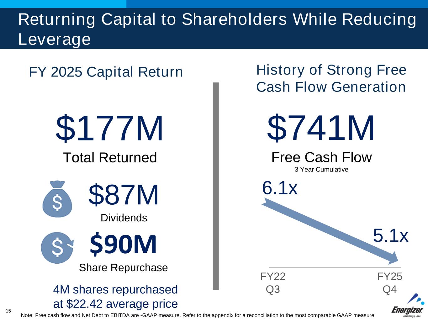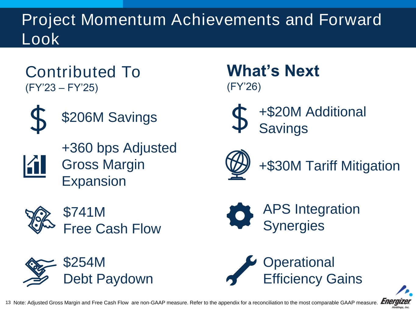 Non-GAAP Financial Measures The Company reports its financial results in accordance with accounting principles generally accepted in the U.S. ("GAAP"). However, management believes that certain non-GAAP financial measures provide users with additional meaningful comparisons to the corresponding historical or future period, and are used for management incentive compensation. These non-GAAP financial measures exclude items that are not reflective of the Company's on-going operating performance, such as impairment on intangible assets, restructuring and related costs, network transition costs, acquisition and integration costs, FY23 & FY24 production credits, a litigation matter, the Loss/(gain) on extinguishment/modification of debt, the December 2023 Argentina Economic Reform and the Settlement loss on US pension annuity buy out. In addition, these measures help investors to analyze year over year comparability when excluding currency fluctuations as well as other Company initiatives that are not on-going. We believe these non-GAAP financial measures are an enhancement to assist investors in understanding our business and in performing analysis consistent with financial models developed by research analysts. Investors should consider non-GAAP measures in addition to, not as a substitute for, or superior to, the comparable GAAP measures. In addition, these non-GAAP measures may not be the same as similar measures used by other companies due to possible differences in methods and in the items being adjusted. We provide the following non-GAAP measures and calculations, as well as the corresponding reconciliation to the closest GAAP measure in the following supplemental schedules: Organic. This is the non-GAAP financial measurement of the change in Net sales or segment profit that excludes or otherwise adjusts for the Acquisition impact, Change in highly inflationary markets and Impact of currency from the changes in foreign currency exchange rates as defined below: • Acquisition impact. The Company completed the Advanced Power Solutions NV (APS NV) acquisition on May 2, 2025. These adjustments include the impact of the operations associated with the acquired branded battery business. The Company will be working to transition from these branded business to legacy brands by December 31, 2025. This does not include the impact of acquisition and integration costs associated with this acquisition. • Change in highly inflationary markets. The Company is presenting separately all changes in sales and segment profit from our Egypt and Argentina affiliates due to the designation of the economies as highly inflationary as of October 1, 2024 and July 1, 2018, respectively. • Impact of currency. The Company evaluates the operating performance of our Company on a currency neutral basis. The Impact of Currency is the change in foreign currency exchange rates year-over-year on reported results, which is calculated by comparing the value of current year foreign operations at the current period USD exchange rate versus the value of current year foreign operations at the prior period USD exchange rate. The impact of currency also includes (gains)/ losses of currency hedging programs, and it excludes highly inflationary markets. •Adjusted Comparisons. Detail for adjusted gross profit and adjusted gross margin are also supplemental non-GAAP measure disclosures. These measures exclude the impact of restructuring and related costs, network transition costs, acquisition and integration costs and FY23 & FY24 production credits. •Free Cash Flow. Free Cash Flow is defined as net cash provided by operating activities reduced by capital expenditures, net of the proceeds from asset sales. •Adjusted Net Earnings and Adjusted Diluted Net Earnings Per Common Share (EPS). These measures exclude the impact of restructuring and related costs, the costs related to acquisition and integration, network transition costs, FY23 & FY24 production credits, litigation matters, impairment of intangible assets, the loss/(gain) on extinguishment/modification of debt and the December 2023 Argentina Economic Reform. Adjusted EPS Excluding Production Credits further excludes the benefit of the FY25 production credits, net of related compensation costs and tax impacts. •EBITDA and Adjusted EBITDA. EBITDA is defined as net earnings before income tax provision, interest, the loss/(gain) on extinguishment/modification of debt, and depreciation and amortization. Adjusted EBITDA further excludes the impact of costs related to restructuring, network transition costs, acquisition and integration costs, FY23 & FY24 production credits, litigation matter, the December 2023 Argentina Economic Reform, the impairment of intangible assets, the Settlement loss on US pension annuity buy out and share based payments. •Net Debt. Net Debt is defined as total Company debt, less cash and cash equivalents. Net leverage is defined as Net debt divided by Adjusted EBITDA for the last twelve month period (LTM). 3