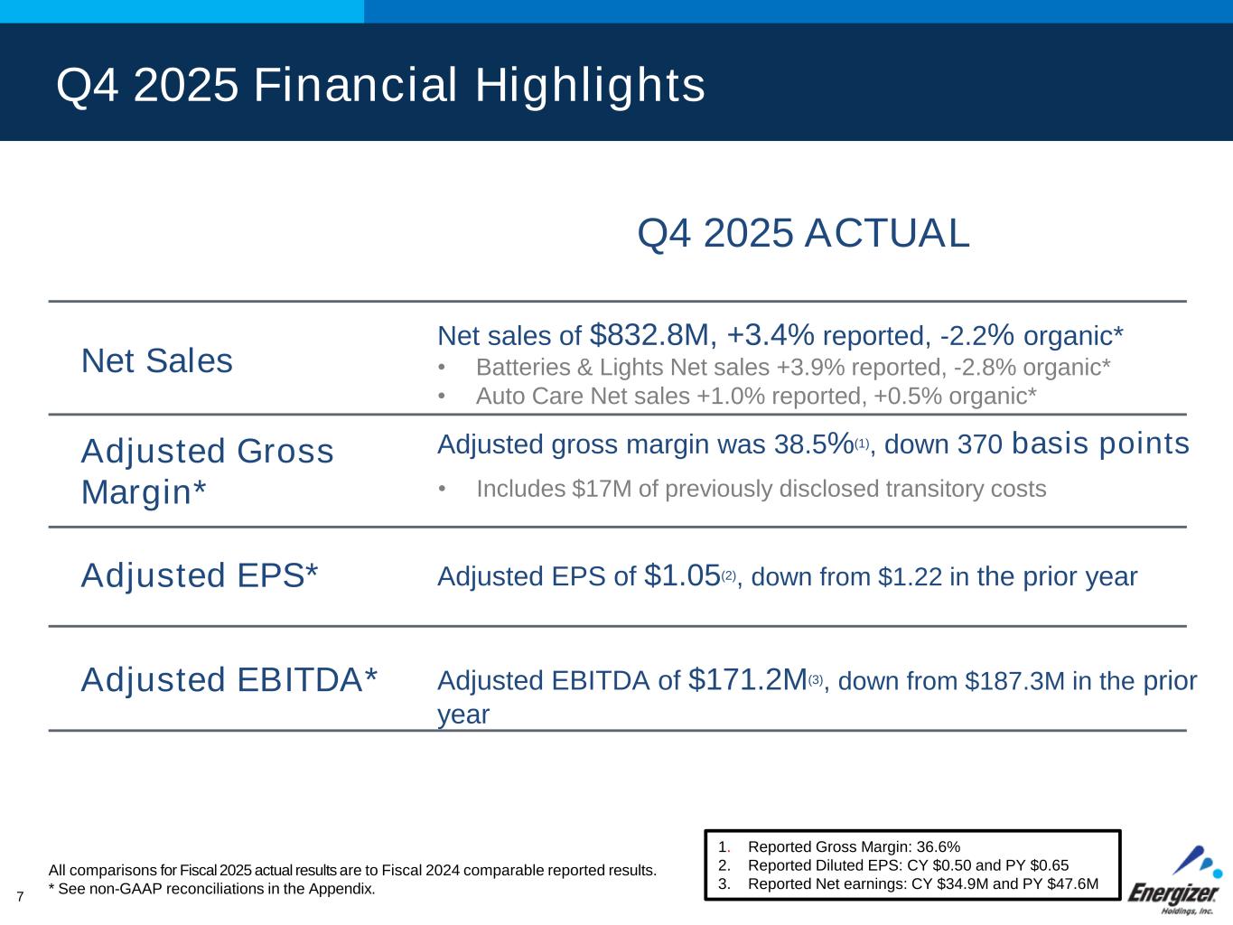Fiscal Year 2025 Financial Highlights FISCAL 2025 ACTUAL 6 All comparisons for Fiscal 2025 actual results are to Fiscal 2024 comparable reported results. * See non-GAAP reconciliations in the Appendix. 1. Reported Gross Margin: 41.7% 2. Reported Diluted EPS: $3.32 3. Reported Net earnings: $239.0M Net sales of $2,952.7M, +2.3% reported, +0.7% organic* • Batteries & Lights Net sales +3.2% reported, +1.0% organic* • Auto Care Net sales -1.2% reported, -0.6% organic* Adjusted gross margin was 40.9%(1), Flat from the prior year Adjusted EPS of $3.52(2), +6% from the prior year Adjusted EBITDA of $623.6M(3), +1.8% from the prior year Net Sales Adjusted Gross Margin* Adjusted EPS* Adjusted EBITDA*