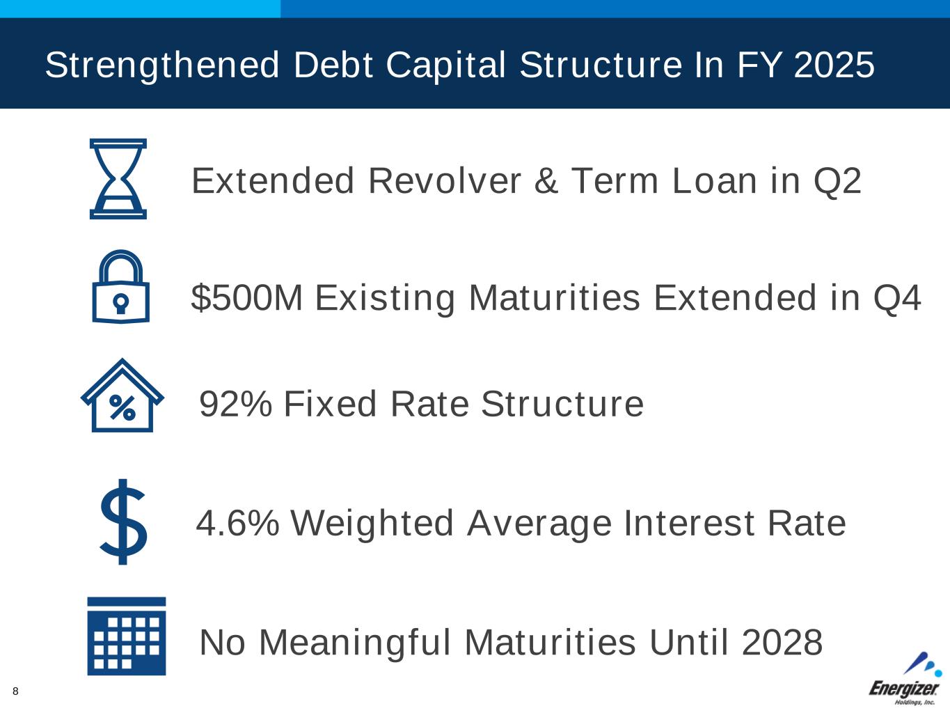 Q4 2025 Financial Highlights Q4 2025 ACTUAL 7 All comparisons for Fiscal 2025 actual results are to Fiscal 2024 comparable reported results. * See non-GAAP reconciliations in the Appendix. 1. Reported Gross Margin: 36.6% 2. Reported Diluted EPS: CY $0.50 and PY $0.65 3. Reported Net earnings: CY $34.9M and PY $47.6M Net sales of $832.8M, +3.4% reported, -2.2% organic* • Batteries & Lights Net sales +3.9% reported, -2.8% organic* • Auto Care Net sales +1.0% reported, +0.5% organic* Adjusted gross margin was 38.5%(1), down 370 basis points Adjusted EPS of $1.05(2), down from $1.22 in the prior year Adjusted EBITDA of $171.2M(3), down from $187.3M in the prior year Net Sales Adjusted Gross Margin* Adjusted EPS* Adjusted EBITDA* • Includes $17M of previously disclosed transitory costs