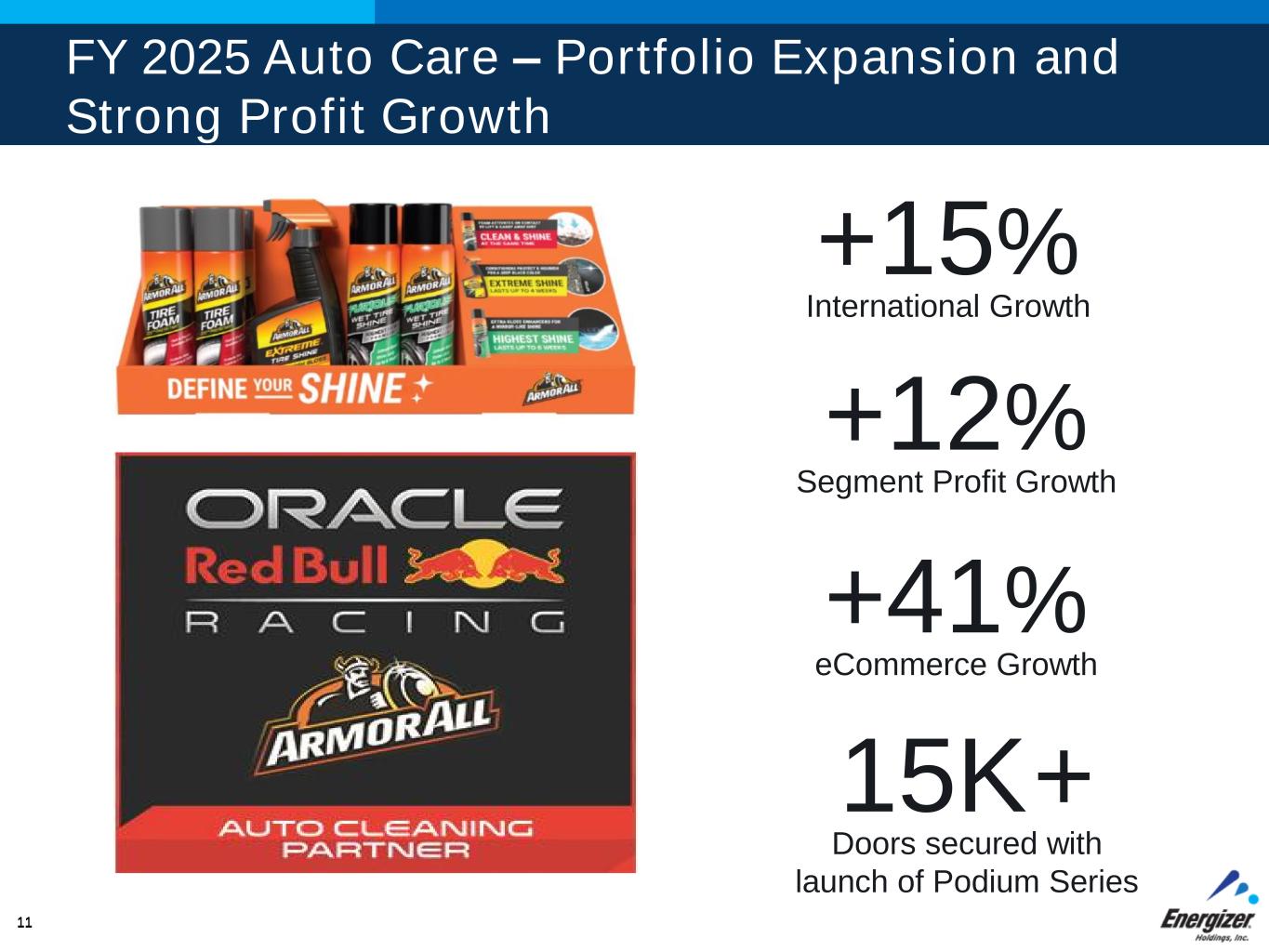 FOR INTERNAL USE ONLY – DO NOT DISTRIBUTE FY 2025 Auto Care – Portfolio Expansion and Strong Profit Growth +15% International Growth +12% Segment Profit Growth +41% eCommerce Growth 15K+ Doors secured with launch of Podium Series 11