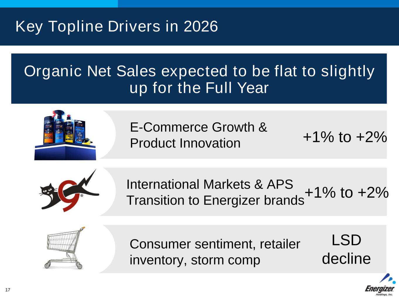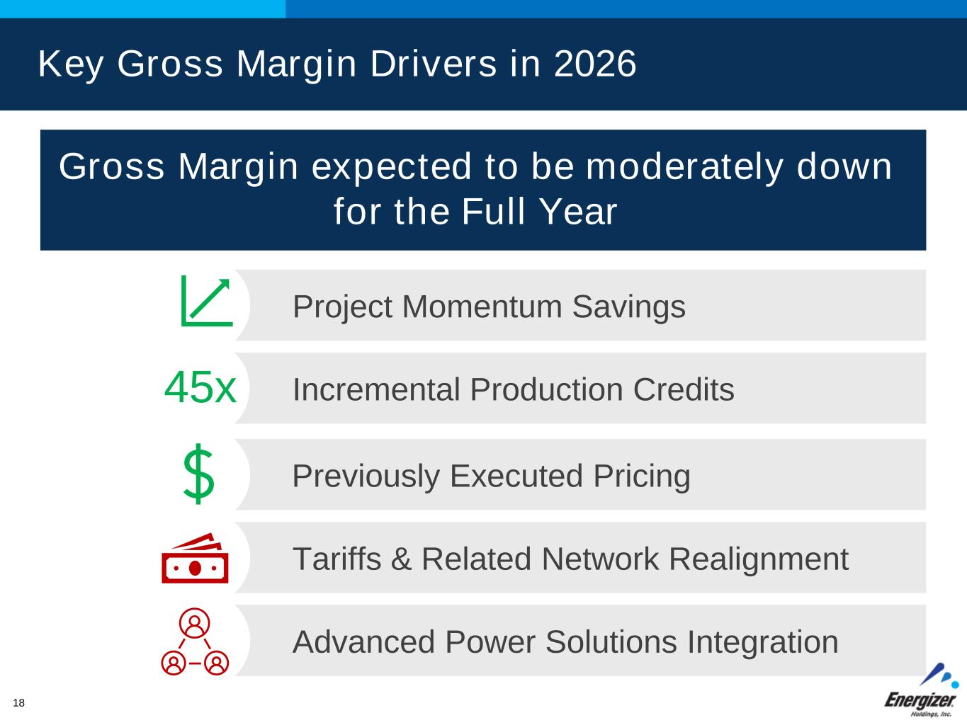 FOR INTERNAL USE ONLY – DO NOT DISTRIBUTE Organic Net Sales expected to be flat to slightly up for the Full Year E-Commerce Growth & Product Innovation +1% to +2% International Markets & APS Transition to Energizer brands +1% to +2% Key Topline Drivers in 2026 Consumer sentiment, retailer inventory, storm comp LSD decline 17