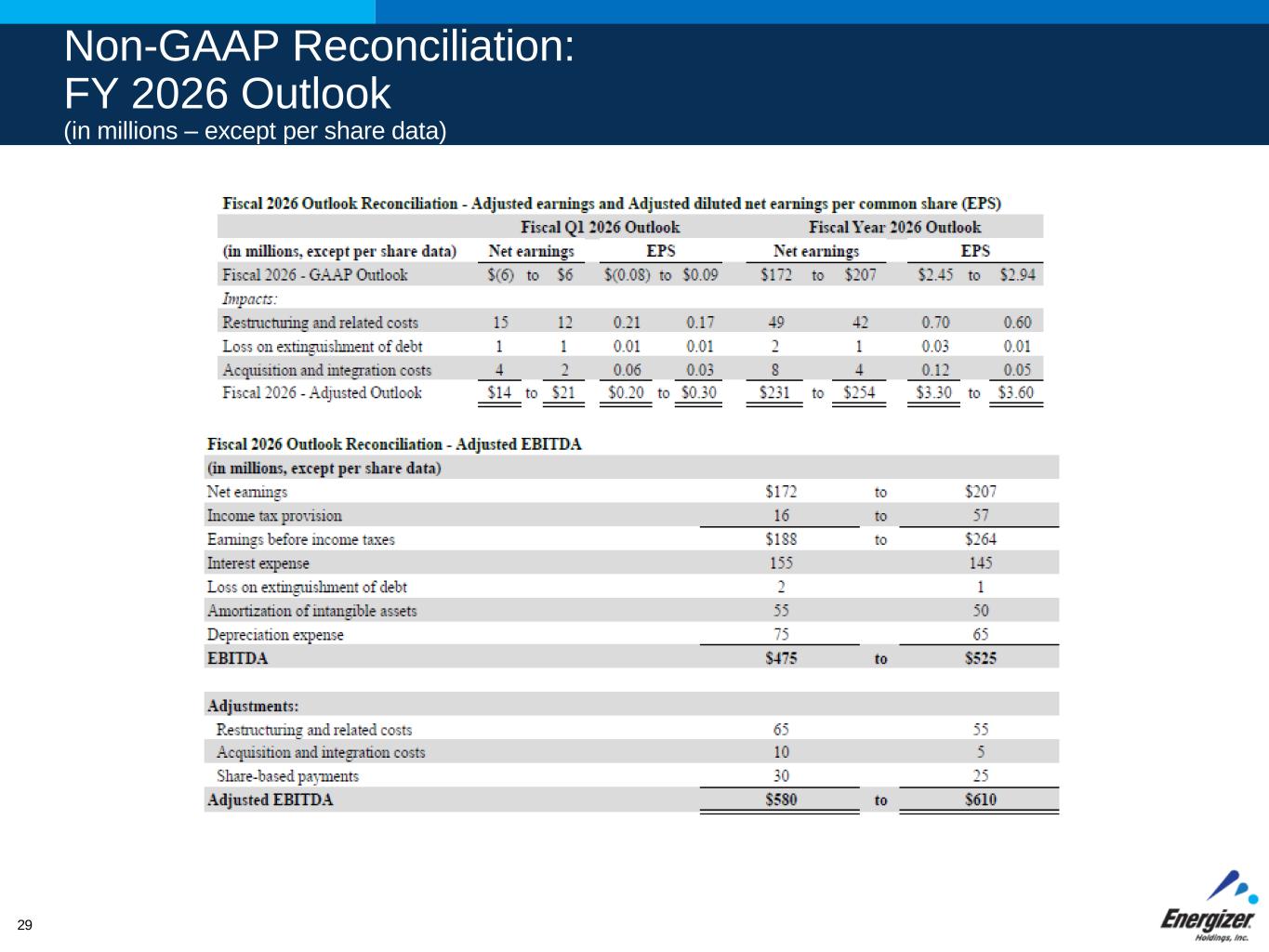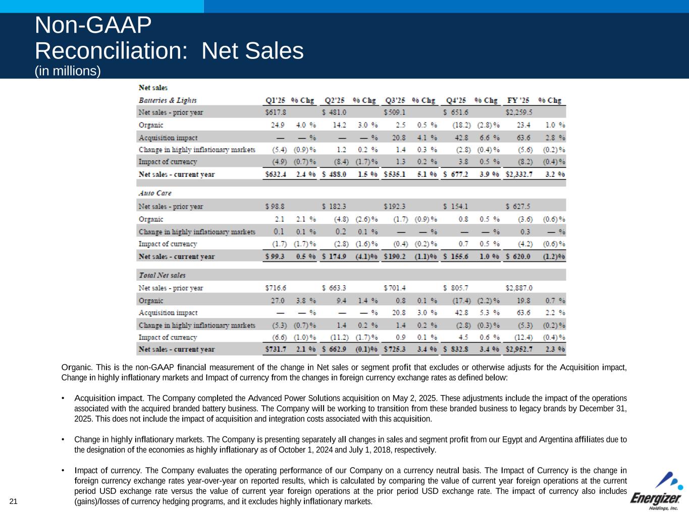 Non-GAAP Reconciliation: Net Sales (in millions) Organic. This is the non-GAAP financial measurement of the change in Net sales or segment profit that excludes or otherwise adjusts for the Acquisition impact, Change in highly inflationary markets and Impact of currency from the changes in foreign currency exchange rates as defined below: • Acquisition impact. The Company completed the Advanced Power Solutions acquisition on May 2, 2025. These adjustments include the impact of the operations associated with the acquired branded battery business. The Company will be working to transition from these branded business to legacy brands by December 31, 2025. This does not include the impact of acquisition and integration costs associated with this acquisition. • Change in highly inflationary markets. The Company is presenting separately all changes in sales and segment profit from our Egypt and Argentina affiliates due to the designation of the economies as highly inflationary as of October 1, 2024 and July 1, 2018, respectively. • Impact of currency. The Company evaluates the operating performance of our Company on a currency neutral basis. The Impact of Currency is the change in foreign currency exchange rates year-over-year on reported results, which is calculated by comparing the value of current year foreign operations at the current period USD exchange rate versus the value of current year foreign operations at the prior period USD exchange rate. The impact of currency also includes (gains)/losses of currency hedging programs, and it excludes highly inflationary markets.21