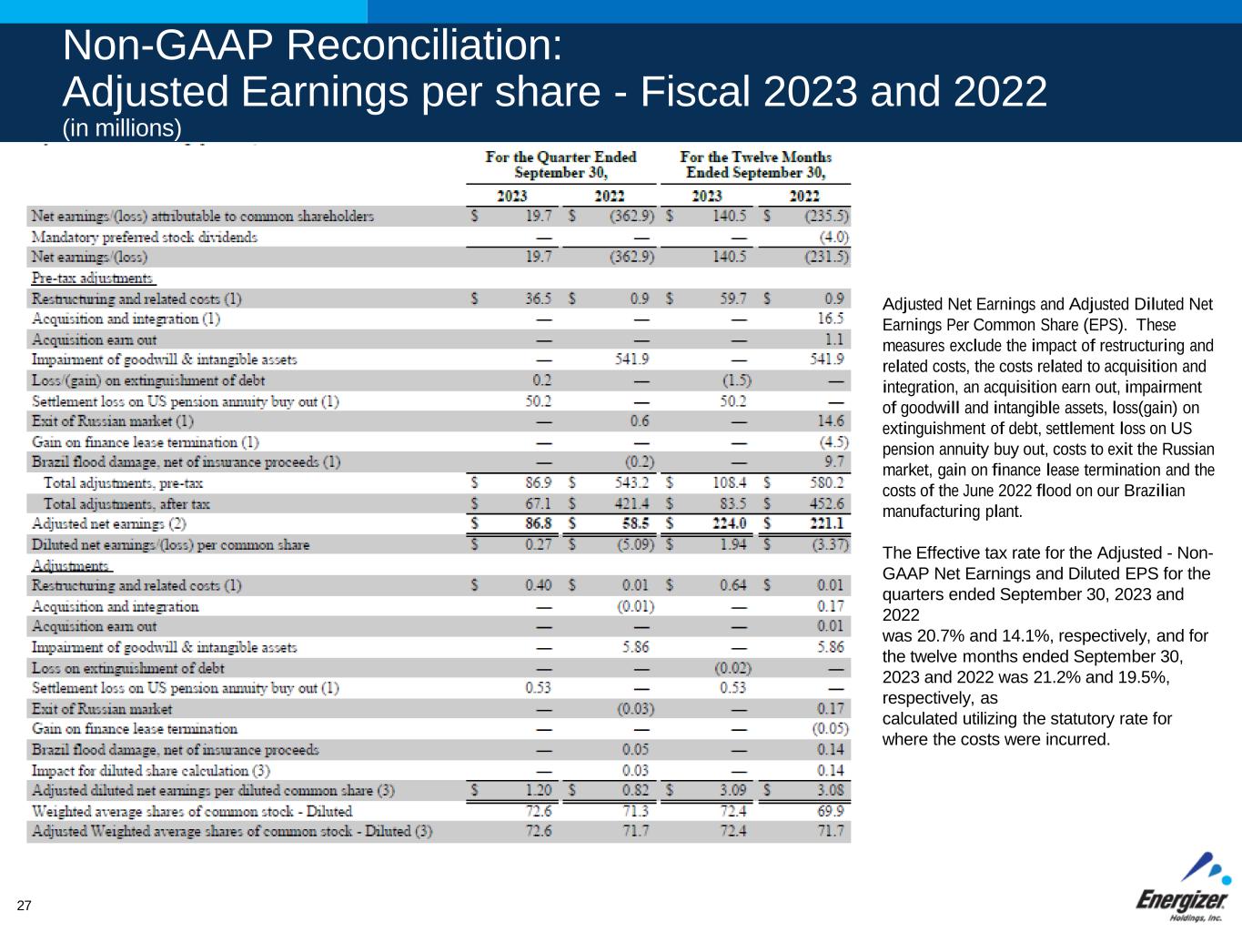 Non-GAAP Reconciliation: Adjusted Earnings per share - Fiscal 2023 and 2022 (in millions) 27 Adjusted Net Earnings and Adjusted Diluted Net Earnings Per Common Share (EPS). These measures exclude the impact of restructuring and related costs, the costs related to acquisition and integration, an acquisition earn out, impairment of goodwill and intangible assets, loss(gain) on extinguishment of debt, settlement loss on US pension annuity buy out, costs to exit the Russian market, gain on finance lease termination and the costs of the June 2022 flood on our Brazilian manufacturing plant. The Effective tax rate for the Adjusted - Non- GAAP Net Earnings and Diluted EPS for the quarters ended September 30, 2023 and 2022 was 20.7% and 14.1%, respectively, and for the twelve months ended September 30, 2023 and 2022 was 21.2% and 19.5%, respectively, as calculated utilizing the statutory rate for where the costs were incurred.