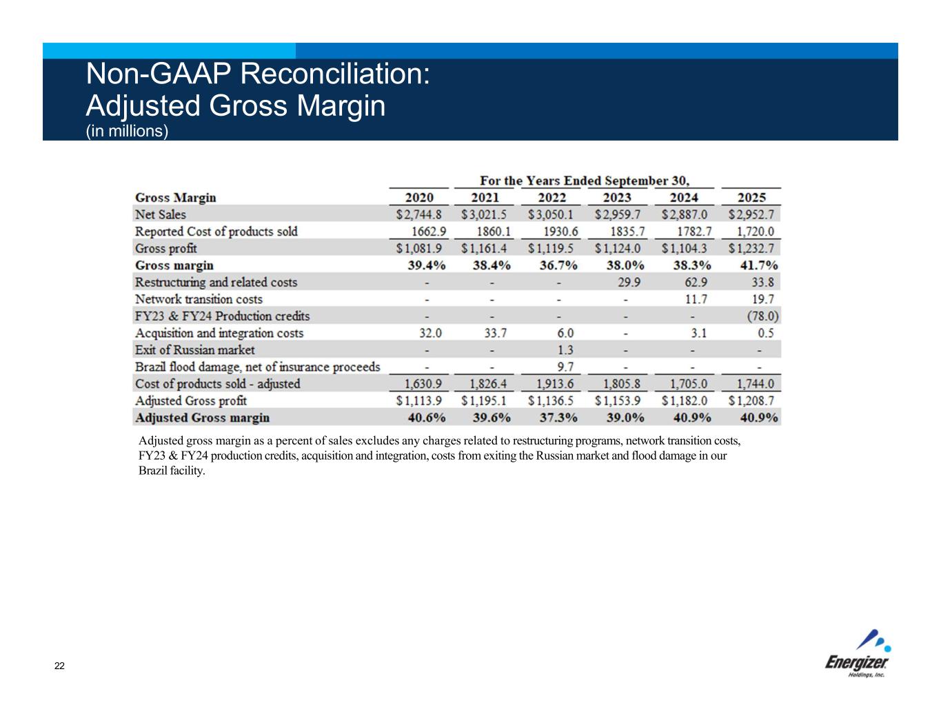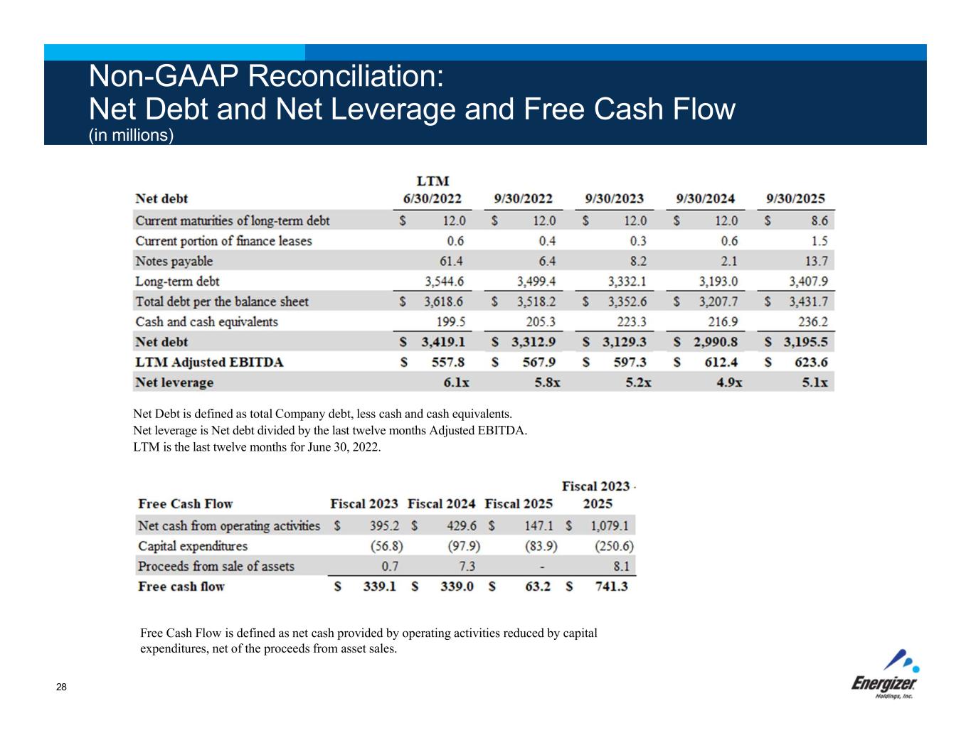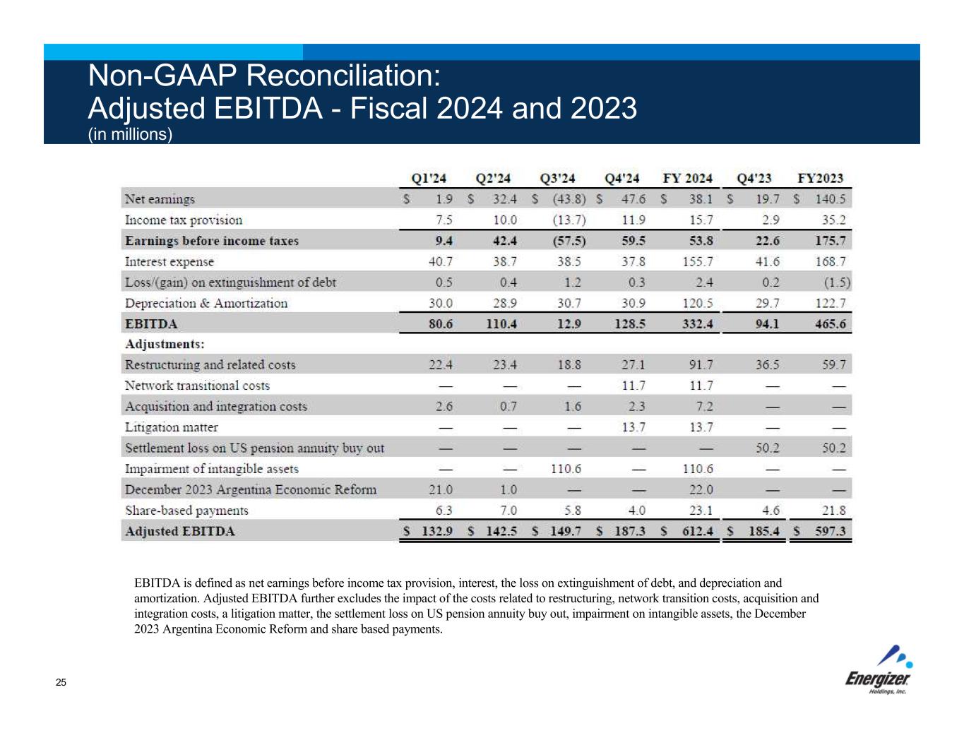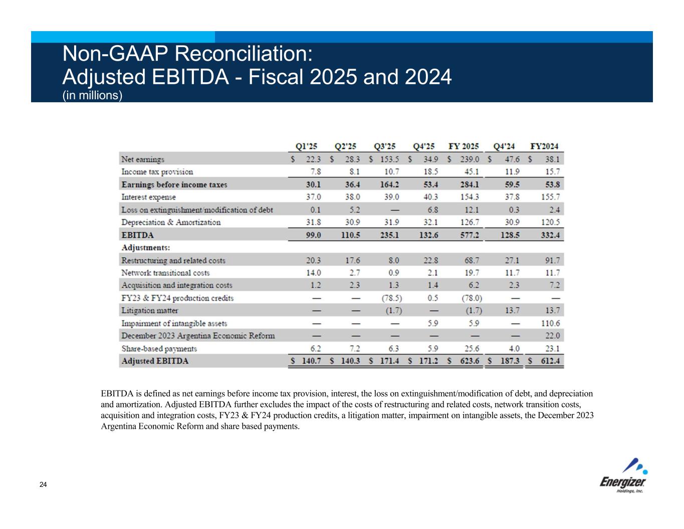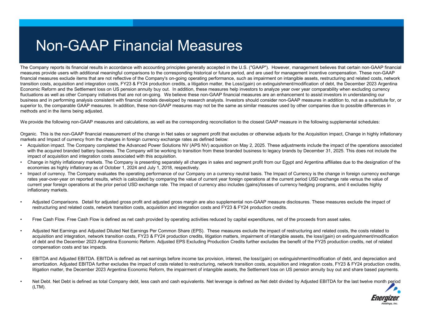Non-GAAP Financial Measures The Company reports its financial results in accordance with accounting principles generally accepted in the U.S. ("GAAP"). However, management believes that certain non-GAAP financial measures provide users with additional meaningful comparisons to the corresponding historical or future period, and are used for management incentive compensation. These non-GAAP financial measures exclude items that are not reflective of the Company's on-going operating performance, such as impairment on intangible assets, restructuring and related costs, network transition costs, acquisition and integration costs, FY23 & FY24 production credits, a litigation matter, the Loss/(gain) on extinguishment/modification of debt, the December 2023 Argentina Economic Reform and the Settlement loss on US pension annuity buy out. In addition, these measures help investors to analyze year over year comparability when excluding currency fluctuations as well as other Company initiatives that are not on-going. We believe these non-GAAP financial measures are an enhancement to assist investors in understanding our business and in performing analysis consistent with financial models developed by research analysts. Investors should consider non-GAAP measures in addition to, not as a substitute for, or superior to, the comparable GAAP measures. In addition, these non-GAAP measures may not be the same as similar measures used by other companies due to possible differences in methods and in the items being adjusted. We provide the following non-GAAP measures and calculations, as well as the corresponding reconciliation to the closest GAAP measure in the following supplemental schedules: Organic. This is the non-GAAP financial measurement of the change in Net sales or segment profit that excludes or otherwise adjusts for the Acquisition impact, Change in highly inflationary markets and Impact of currency from the changes in foreign currency exchange rates as defined below: • Acquisition impact. The Company completed the Advanced Power Solutions NV (APS NV) acquisition on May 2, 2025. These adjustments include the impact of the operations associated with the acquired branded battery business. The Company will be working to transition from these branded business to legacy brands by December 31, 2025. This does not include the impact of acquisition and integration costs associated with this acquisition. • Change in highly inflationary markets. The Company is presenting separately all changes in sales and segment profit from our Egypt and Argentina affiliates due to the designation of the economies as highly inflationary as of October 1, 2024 and July 1, 2018, respectively. • Impact of currency. The Company evaluates the operating performance of our Company on a currency neutral basis. The Impact of Currency is the change in foreign currency exchange rates year-over-year on reported results, which is calculated by comparing the value of current year foreign operations at the current period USD exchange rate versus the value of current year foreign operations at the prior period USD exchange rate. The impact of currency also includes (gains)/losses of currency hedging programs, and it excludes highly inflationary markets. • Adjusted Comparisons. Detail for adjusted gross profit and adjusted gross margin are also supplemental non-GAAP measure disclosures. These measures exclude the impact of restructuring and related costs, network transition costs, acquisition and integration costs and FY23 & FY24 production credits. • Free Cash Flow. Free Cash Flow is defined as net cash provided by operating activities reduced by capital expenditures, net of the proceeds from asset sales. • Adjusted Net Earnings and Adjusted Diluted Net Earnings Per Common Share (EPS). These measures exclude the impact of restructuring and related costs, the costs related to acquisition and integration, network transition costs, FY23 & FY24 production credits, litigation matters, impairment of intangible assets, the loss/(gain) on extinguishment/modification of debt and the December 2023 Argentina Economic Reform. Adjusted EPS Excluding Production Credits further excludes the benefit of the FY25 production credits, net of related compensation costs and tax impacts. • EBITDA and Adjusted EBITDA. EBITDA is defined as net earnings before income tax provision, interest, the loss/(gain) on extinguishment/modification of debt, and depreciation and amortization. Adjusted EBITDA further excludes the impact of costs related to restructuring, network transition costs, acquisition and integration costs, FY23 & FY24 production credits, litigation matter, the December 2023 Argentina Economic Reform, the impairment of intangible assets, the Settlement loss on US pension annuity buy out and share based payments. • Net Debt. Net Debt is defined as total Company debt, less cash and cash equivalents. Net leverage is defined as Net debt divided by Adjusted EBITDA for the last twelve month period (LTM).