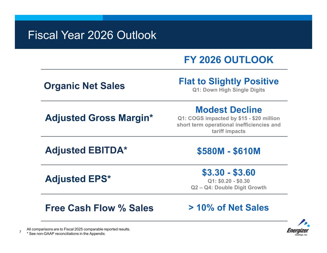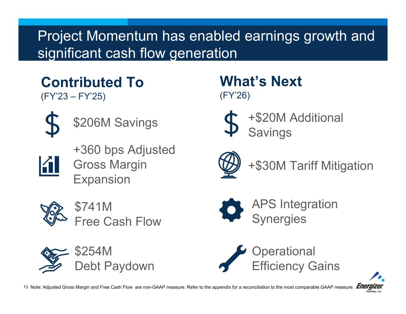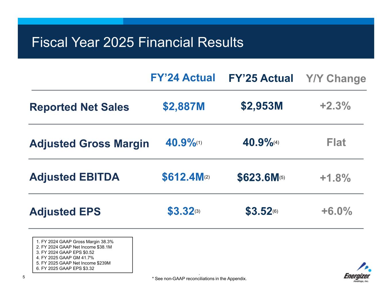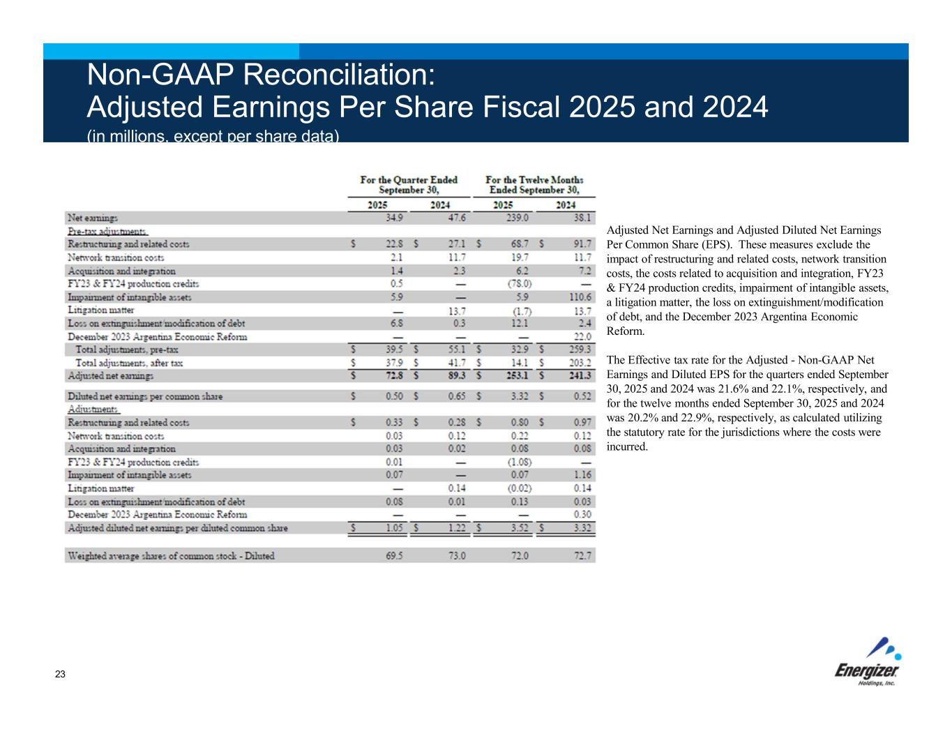 Non-GAAP Financial Measures The Company reports its financial results in accordance with accounting principles generally accepted in the U.S. ("GAAP"). However, management believes that certain non-GAAP financial measures provide users with additional meaningful comparisons to the corresponding historical or future period, and are used for management incentive compensation. These non-GAAP financial measures exclude items that are not reflective of the Company's on-going operating performance, such as impairment on intangible assets, restructuring and related costs, network transition costs, acquisition and integration costs, FY23 & FY24 production credits, a litigation matter, the Loss/(gain) on extinguishment/modification of debt, the December 2023 Argentina Economic Reform and the Settlement loss on US pension annuity buy out. In addition, these measures help investors to analyze year over year comparability when excluding currency fluctuations as well as other Company initiatives that are not on-going. We believe these non-GAAP financial measures are an enhancement to assist investors in understanding our business and in performing analysis consistent with financial models developed by research analysts. Investors should consider non-GAAP measures in addition to, not as a substitute for, or superior to, the comparable GAAP measures. In addition, these non-GAAP measures may not be the same as similar measures used by other companies due to possible differences in methods and in the items being adjusted. We provide the following non-GAAP measures and calculations, as well as the corresponding reconciliation to the closest GAAP measure in the following supplemental schedules: Organic. This is the non-GAAP financial measurement of the change in Net sales or segment profit that excludes or otherwise adjusts for the Acquisition impact, Change in highly inflationary markets and Impact of currency from the changes in foreign currency exchange rates as defined below: • Acquisition impact. The Company completed the Advanced Power Solutions NV (APS NV) acquisition on May 2, 2025. These adjustments include the impact of the operations associated with the acquired branded battery business. The Company will be working to transition from these branded business to legacy brands by December 31, 2025. This does not include the impact of acquisition and integration costs associated with this acquisition. • Change in highly inflationary markets. The Company is presenting separately all changes in sales and segment profit from our Egypt and Argentina affiliates due to the designation of the economies as highly inflationary as of October 1, 2024 and July 1, 2018, respectively. • Impact of currency. The Company evaluates the operating performance of our Company on a currency neutral basis. The Impact of Currency is the change in foreign currency exchange rates year-over-year on reported results, which is calculated by comparing the value of current year foreign operations at the current period USD exchange rate versus the value of current year foreign operations at the prior period USD exchange rate. The impact of currency also includes (gains)/losses of currency hedging programs, and it excludes highly inflationary markets. • Adjusted Comparisons. Detail for adjusted gross profit and adjusted gross margin are also supplemental non-GAAP measure disclosures. These measures exclude the impact of restructuring and related costs, network transition costs, acquisition and integration costs and FY23 & FY24 production credits. • Free Cash Flow. Free Cash Flow is defined as net cash provided by operating activities reduced by capital expenditures, net of the proceeds from asset sales. • Adjusted Net Earnings and Adjusted Diluted Net Earnings Per Common Share (EPS). These measures exclude the impact of restructuring and related costs, the costs related to acquisition and integration, network transition costs, FY23 & FY24 production credits, litigation matters, impairment of intangible assets, the loss/(gain) on extinguishment/modification of debt and the December 2023 Argentina Economic Reform. Adjusted EPS Excluding Production Credits further excludes the benefit of the FY25 production credits, net of related compensation costs and tax impacts. • EBITDA and Adjusted EBITDA. EBITDA is defined as net earnings before income tax provision, interest, the loss/(gain) on extinguishment/modification of debt, and depreciation and amortization. Adjusted EBITDA further excludes the impact of costs related to restructuring, network transition costs, acquisition and integration costs, FY23 & FY24 production credits, litigation matter, the December 2023 Argentina Economic Reform, the impairment of intangible assets, the Settlement loss on US pension annuity buy out and share based payments. • Net Debt. Net Debt is defined as total Company debt, less cash and cash equivalents. Net leverage is defined as Net debt divided by Adjusted EBITDA for the last twelve month period (LTM).