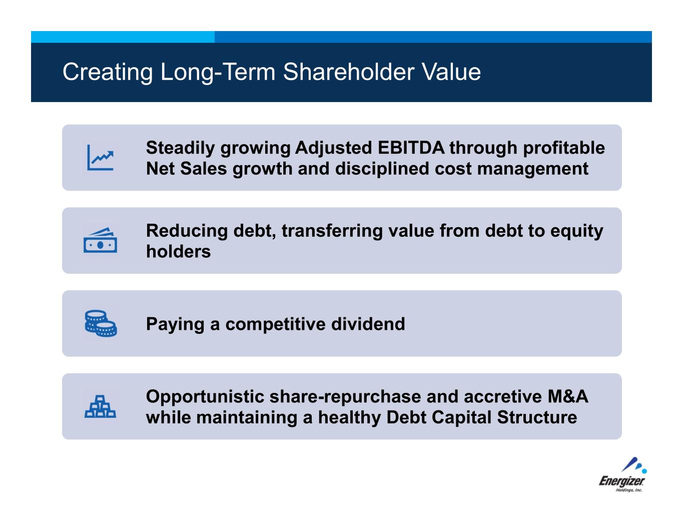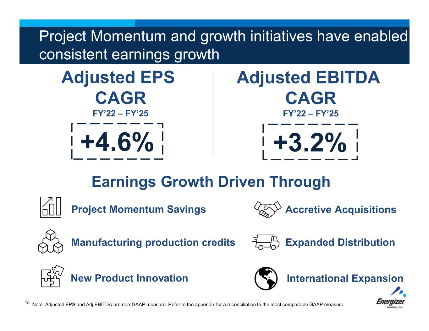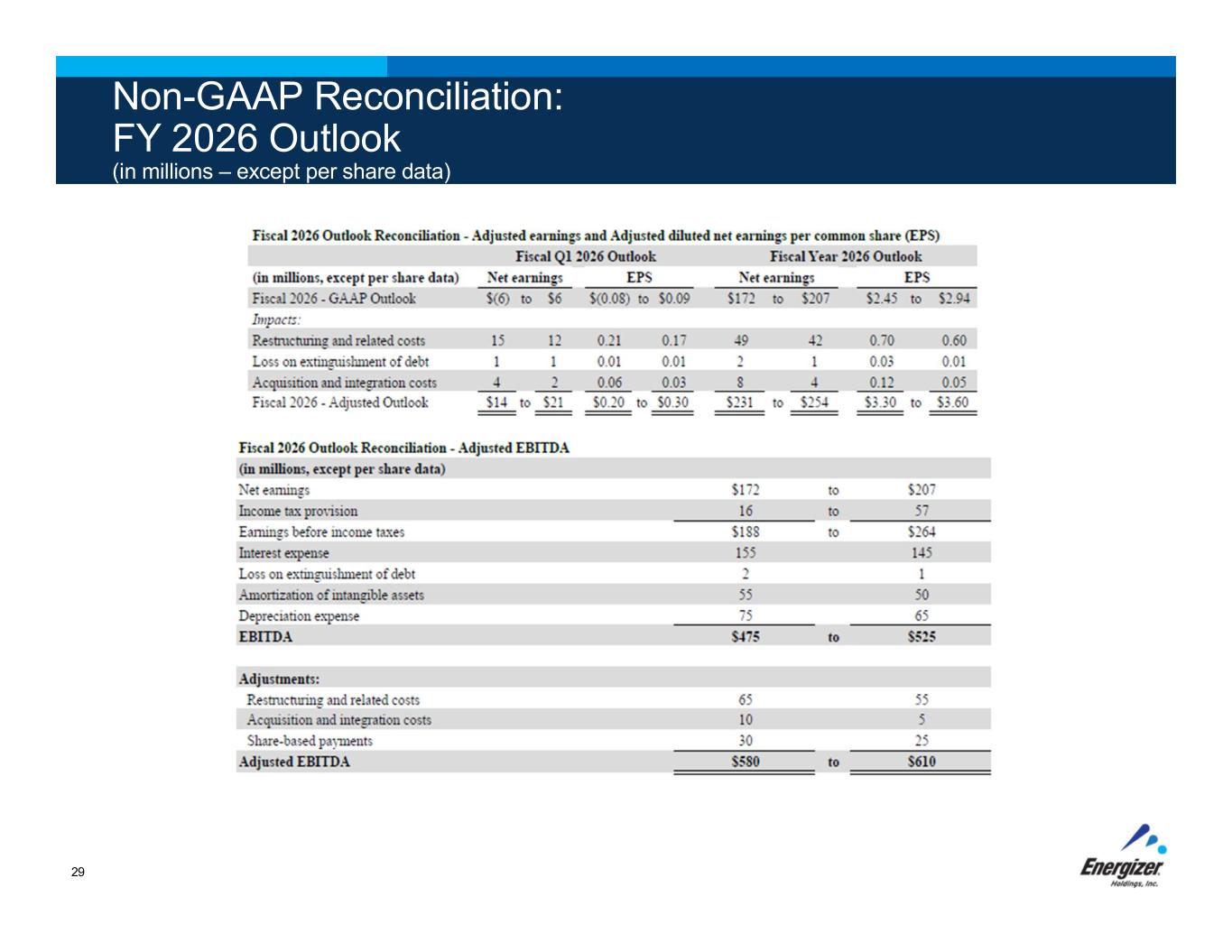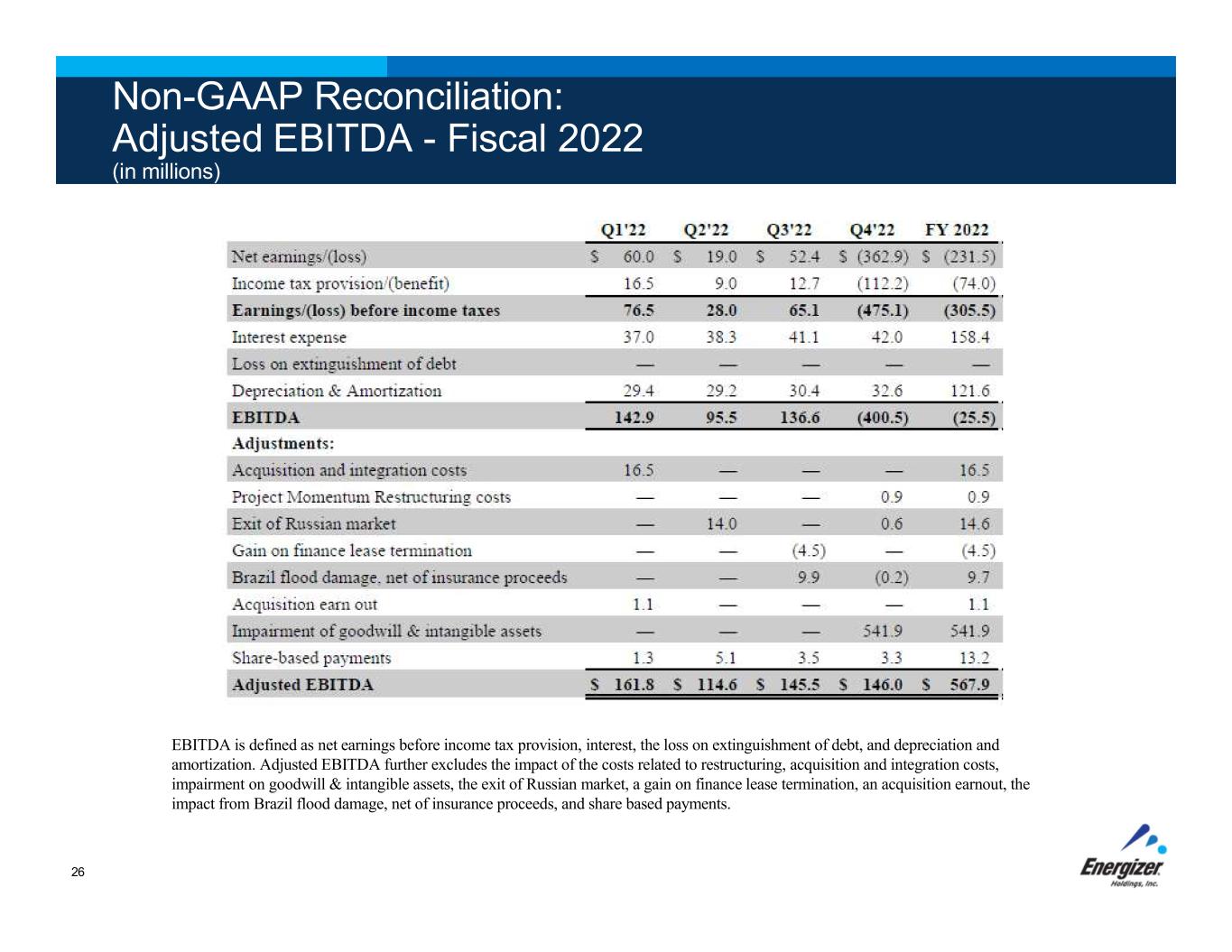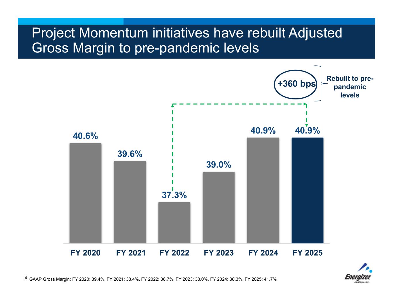 Non-GAAP Financial Measures The Company reports its financial results in accordance with accounting principles generally accepted in the U.S. ("GAAP"). However, management believes that certain non-GAAP financial measures provide users with additional meaningful comparisons to the corresponding historical or future period, and are used for management incentive compensation. These non-GAAP financial measures exclude items that are not reflective of the Company's on-going operating performance, such as impairment on intangible assets, restructuring and related costs, network transition costs, acquisition and integration costs, FY23 & FY24 production credits, a litigation matter, the Loss/(gain) on extinguishment/modification of debt, the December 2023 Argentina Economic Reform and the Settlement loss on US pension annuity buy out. In addition, these measures help investors to analyze year over year comparability when excluding currency fluctuations as well as other Company initiatives that are not on-going. We believe these non-GAAP financial measures are an enhancement to assist investors in understanding our business and in performing analysis consistent with financial models developed by research analysts. Investors should consider non-GAAP measures in addition to, not as a substitute for, or superior to, the comparable GAAP measures. In addition, these non-GAAP measures may not be the same as similar measures used by other companies due to possible differences in methods and in the items being adjusted. We provide the following non-GAAP measures and calculations, as well as the corresponding reconciliation to the closest GAAP measure in the following supplemental schedules: Organic. This is the non-GAAP financial measurement of the change in Net sales or segment profit that excludes or otherwise adjusts for the Acquisition impact, Change in highly inflationary markets and Impact of currency from the changes in foreign currency exchange rates as defined below: • Acquisition impact. The Company completed the Advanced Power Solutions NV (APS NV) acquisition on May 2, 2025. These adjustments include the impact of the operations associated with the acquired branded battery business. The Company will be working to transition from these branded business to legacy brands by December 31, 2025. This does not include the impact of acquisition and integration costs associated with this acquisition. • Change in highly inflationary markets. The Company is presenting separately all changes in sales and segment profit from our Egypt and Argentina affiliates due to the designation of the economies as highly inflationary as of October 1, 2024 and July 1, 2018, respectively. • Impact of currency. The Company evaluates the operating performance of our Company on a currency neutral basis. The Impact of Currency is the change in foreign currency exchange rates year-over-year on reported results, which is calculated by comparing the value of current year foreign operations at the current period USD exchange rate versus the value of current year foreign operations at the prior period USD exchange rate. The impact of currency also includes (gains)/losses of currency hedging programs, and it excludes highly inflationary markets. • Adjusted Comparisons. Detail for adjusted gross profit and adjusted gross margin are also supplemental non-GAAP measure disclosures. These measures exclude the impact of restructuring and related costs, network transition costs, acquisition and integration costs and FY23 & FY24 production credits. • Free Cash Flow. Free Cash Flow is defined as net cash provided by operating activities reduced by capital expenditures, net of the proceeds from asset sales. • Adjusted Net Earnings and Adjusted Diluted Net Earnings Per Common Share (EPS). These measures exclude the impact of restructuring and related costs, the costs related to acquisition and integration, network transition costs, FY23 & FY24 production credits, litigation matters, impairment of intangible assets, the loss/(gain) on extinguishment/modification of debt and the December 2023 Argentina Economic Reform. Adjusted EPS Excluding Production Credits further excludes the benefit of the FY25 production credits, net of related compensation costs and tax impacts. • EBITDA and Adjusted EBITDA. EBITDA is defined as net earnings before income tax provision, interest, the loss/(gain) on extinguishment/modification of debt, and depreciation and amortization. Adjusted EBITDA further excludes the impact of costs related to restructuring, network transition costs, acquisition and integration costs, FY23 & FY24 production credits, litigation matter, the December 2023 Argentina Economic Reform, the impairment of intangible assets, the Settlement loss on US pension annuity buy out and share based payments. • Net Debt. Net Debt is defined as total Company debt, less cash and cash equivalents. Net leverage is defined as Net debt divided by Adjusted EBITDA for the last twelve month period (LTM).