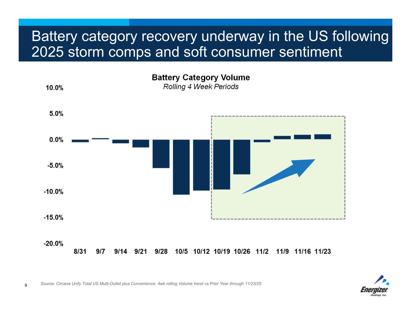 Battery category recovery underway in the US following 2025 storm comps and soft consumer sentiment 9 Source: Circana Unify Total US Multi-Outlet plus Convenience, 4wk rolling Volume trend vs Prior Year through 11/23/25 Battery Category Volume Rolling 4 Week Periods