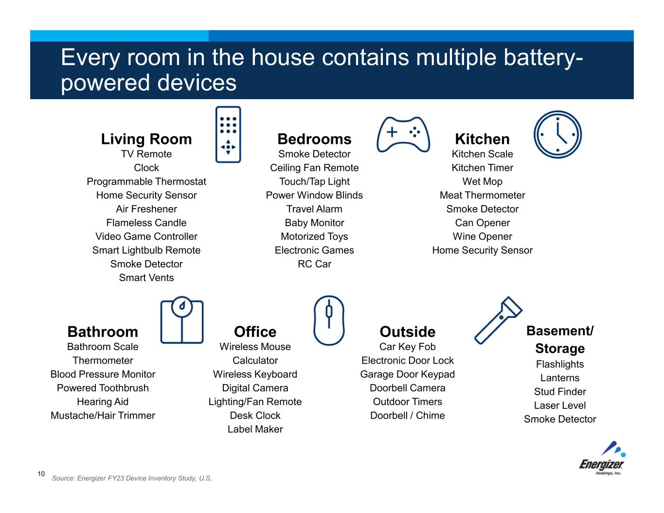 FOR INTERNAL USE ONLY – DO NOT DISTRIBUTE Basement/ Storage Flashlights Lanterns Stud Finder Laser Level Smoke Detector Bathroom Bathroom Scale Thermometer Blood Pressure Monitor Powered Toothbrush Hearing Aid Mustache/Hair Trimmer Outside Car Key Fob Electronic Door Lock Garage Door Keypad Doorbell Camera Outdoor Timers Doorbell / Chime Office Wireless Mouse Calculator Wireless Keyboard Digital Camera Lighting/Fan Remote Desk Clock Label Maker Kitchen Kitchen Scale Kitchen Timer Wet Mop Meat Thermometer Smoke Detector Can Opener Wine Opener Home Security Sensor Bedrooms Smoke Detector Ceiling Fan Remote Touch/Tap Light Power Window Blinds Travel Alarm Baby Monitor Motorized Toys Electronic Games RC Car Living Room TV Remote Clock Programmable Thermostat Home Security Sensor Air Freshener Flameless Candle Video Game Controller Smart Lightbulb Remote Smoke Detector Smart Vents Every room in the house contains multiple battery- powered devices Source: Energizer FY23 Device Inventory Study, U.S. 10