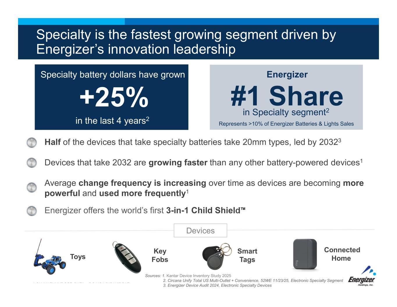 FOR INTERNAL USE ONLY – DO NOT DISTRIBUTE Half of the devices that take specialty batteries take 20mm types, led by 20323 Devices that take 2032 are growing faster than any other battery-powered devices1 Average change frequency is increasing over time as devices are becoming more powerful and used more frequently1 Energizer offers the world’s first 3-in-1 Child Shield Smart Tags Connected Home Key FobsToys +25% Specialty battery dollars have grown in the last 4 years2 Specialty is the fastest growing segment driven by Energizer’s innovation leadership #1 Share Energizer in Specialty segment2 Sources: 1. Kantar Device Inventory Study 2025 2. Circana Unify Total US Multi-Outlet + Convenience, 52WE 11/23/25, Electronic Specialty Segment 3. Energizer Device Audit 2024, Electronic Specialty Devices Represents >10% of Energizer Batteries & Lights Sales Devices