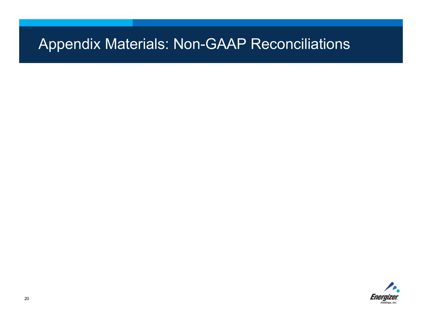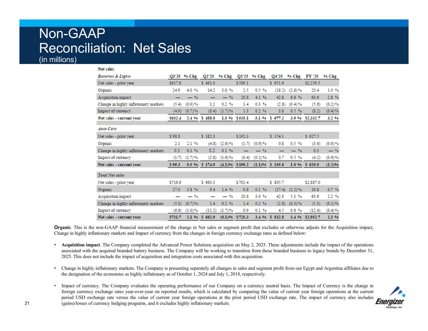 Non-GAAP Reconciliation: Net Sales (in millions) Organic. This is the non-GAAP financial measurement of the change in Net sales or segment profit that excludes or otherwise adjusts for the Acquisition impact, Change in highly inflationary markets and Impact of currency from the changes in foreign currency exchange rates as defined below: • Acquisition impact. The Company completed the Advanced Power Solutions acquisition on May 2, 2025. These adjustments include the impact of the operations associated with the acquired branded battery business. The Company will be working to transition from these branded business to legacy brands by December 31, 2025. This does not include the impact of acquisition and integration costs associated with this acquisition. • Change in highly inflationary markets. The Company is presenting separately all changes in sales and segment profit from our Egypt and Argentina affiliates due to the designation of the economies as highly inflationary as of October 1, 2024 and July 1, 2018, respectively. • Impact of currency. The Company evaluates the operating performance of our Company on a currency neutral basis. The Impact of Currency is the change in foreign currency exchange rates year-over-year on reported results, which is calculated by comparing the value of current year foreign operations at the current period USD exchange rate versus the value of current year foreign operations at the prior period USD exchange rate. The impact of currency also includes (gains)/losses of currency hedging programs, and it excludes highly inflationary markets.21