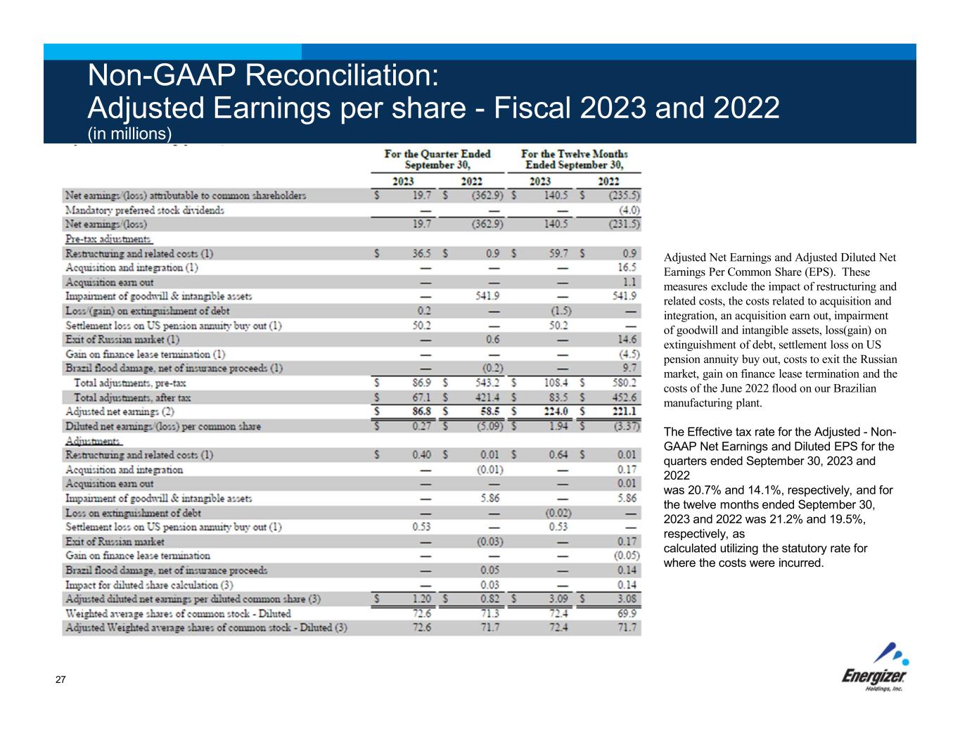 Non-GAAP Reconciliation: Adjusted Earnings per share - Fiscal 2023 and 2022 (in millions) 27 Adjusted Net Earnings and Adjusted Diluted Net Earnings Per Common Share (EPS). These measures exclude the impact of restructuring and related costs, the costs related to acquisition and integration, an acquisition earn out, impairment of goodwill and intangible assets, loss(gain) on extinguishment of debt, settlement loss on US pension annuity buy out, costs to exit the Russian market, gain on finance lease termination and the costs of the June 2022 flood on our Brazilian manufacturing plant. The Effective tax rate for the Adjusted - Non- GAAP Net Earnings and Diluted EPS for the quarters ended September 30, 2023 and 2022 was 20.7% and 14.1%, respectively, and for the twelve months ended September 30, 2023 and 2022 was 21.2% and 19.5%, respectively, as calculated utilizing the statutory rate for where the costs were incurred.