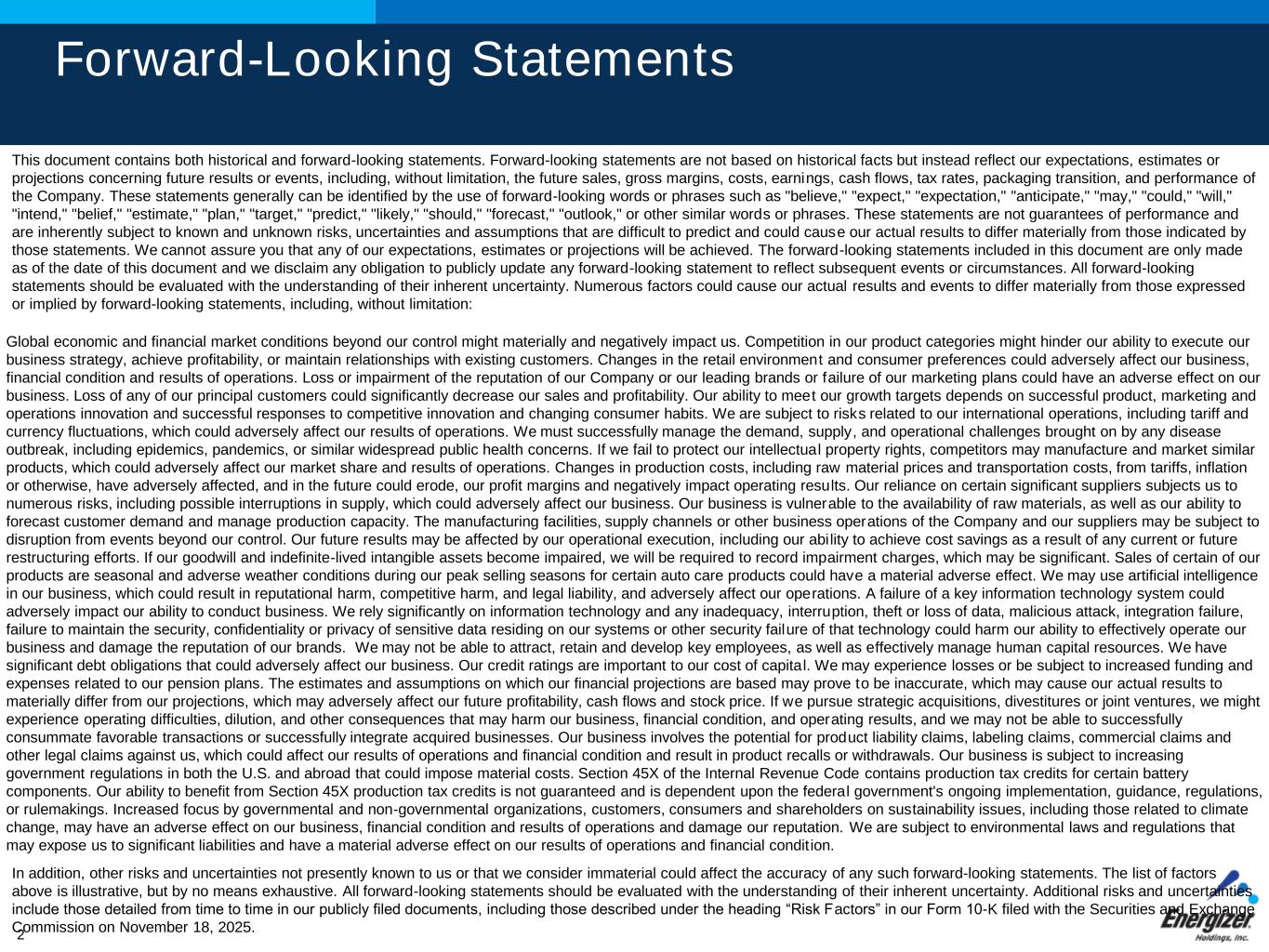 This document contains both historical and forward-looking statements. Forward-looking statements are not based on historical facts but instead reflect our expectations, estimates or projections concerning future results or events, including, without limitation, the future sales, gross margins, costs, earnings, cash flows, tax rates, packaging transition, and performance of the Company. These statements generally can be identified by the use of forward-looking words or phrases such as "believe," "expect," "expectation," "anticipate," "may," "could," "will," "intend," "belief," "estimate," "plan," "target," "predict," "likely," "should," "forecast," "outlook," or other similar words or phrases. These statements are not guarantees of performance and are inherently subject to known and unknown risks, uncertainties and assumptions that are difficult to predict and could cause our actual results to differ materially from those indicated by those statements. We cannot assure you that any of our expectations, estimates or projections will be achieved. The forward-looking statements included in this document are only made as of the date of this document and we disclaim any obligation to publicly update any forward-looking statement to reflect subsequent events or circumstances. All forward-looking statements should be evaluated with the understanding of their inherent uncertainty. Numerous factors could cause our actual results and events to differ materially from those expressed or implied by forward-looking statements, including, without limitation: Global economic and financial market conditions beyond our control might materially and negatively impact us. Competition in our product categories might hinder our ability to execute our business strategy, achieve profitability, or maintain relationships with existing customers. Changes in the retail environment and consumer preferences could adversely affect our business, financial condition and results of operations. Loss or impairment of the reputation of our Company or our leading brands or failure of our marketing plans could have an adverse effect on our business. Loss of any of our principal customers could significantly decrease our sales and profitability. Our ability to meet our growth targets depends on successful product, marketing and operations innovation and successful responses to competitive innovation and changing consumer habits. We are subject to risks related to our international operations, including tariff and currency fluctuations, which could adversely affect our results of operations. We must successfully manage the demand, supply, and operational challenges brought on by any disease outbreak, including epidemics, pandemics, or similar widespread public health concerns. If we fail to protect our intellectual property rights, competitors may manufacture and market similar products, which could adversely affect our market share and results of operations. Changes in production costs, including raw material prices and transportation costs, from tariffs, inflation or otherwise, have adversely affected, and in the future could erode, our profit margins and negatively impact operating results. Our reliance on certain significant suppliers subjects us to numerous risks, including possible interruptions in supply, which could adversely affect our business. Our business is vulnerable to the availability of raw materials, as well as our ability to forecast customer demand and manage production capacity. The manufacturing facilities, supply channels or other business operations of the Company and our suppliers may be subject to disruption from events beyond our control. Our future results may be affected by our operational execution, including our ability to achieve cost savings as a result of any current or future restructuring efforts. If our goodwill and indefinite-lived intangible assets become impaired, we will be required to record impairment charges, which may be significant. Sales of certain of our products are seasonal and adverse weather conditions during our peak selling seasons for certain auto care products could have a material adverse effect. We may use artificial intelligence in our business, which could result in reputational harm, competitive harm, and legal liability, and adversely affect our operations. A failure of a key information technology system could adversely impact our ability to conduct business. We rely significantly on information technology and any inadequacy, interruption, theft or loss of data, malicious attack, integration failure, failure to maintain the security, confidentiality or privacy of sensitive data residing on our systems or other security failure of that technology could harm our ability to effectively operate our business and damage the reputation of our brands. We may not be able to attract, retain and develop key employees, as well as effectively manage human capital resources. We have significant debt obligations that could adversely affect our business. Our credit ratings are important to our cost of capital. We may experience losses or be subject to increased funding and expenses related to our pension plans. The estimates and assumptions on which our financial projections are based may prove to be inaccurate, which may cause our actual results to materially differ from our projections, which may adversely affect our future profitability, cash flows and stock price. If we pursue strategic acquisitions, divestitures or joint ventures, we might experience operating difficulties, dilution, and other consequences that may harm our business, financial condition, and operating results, and we may not be able to successfully consummate favorable transactions or successfully integrate acquired businesses. Our business involves the potential for product liability claims, labeling claims, commercial claims and other legal claims against us, which could affect our results of operations and f