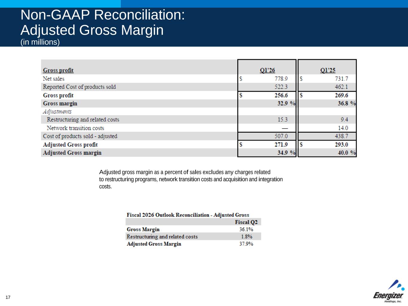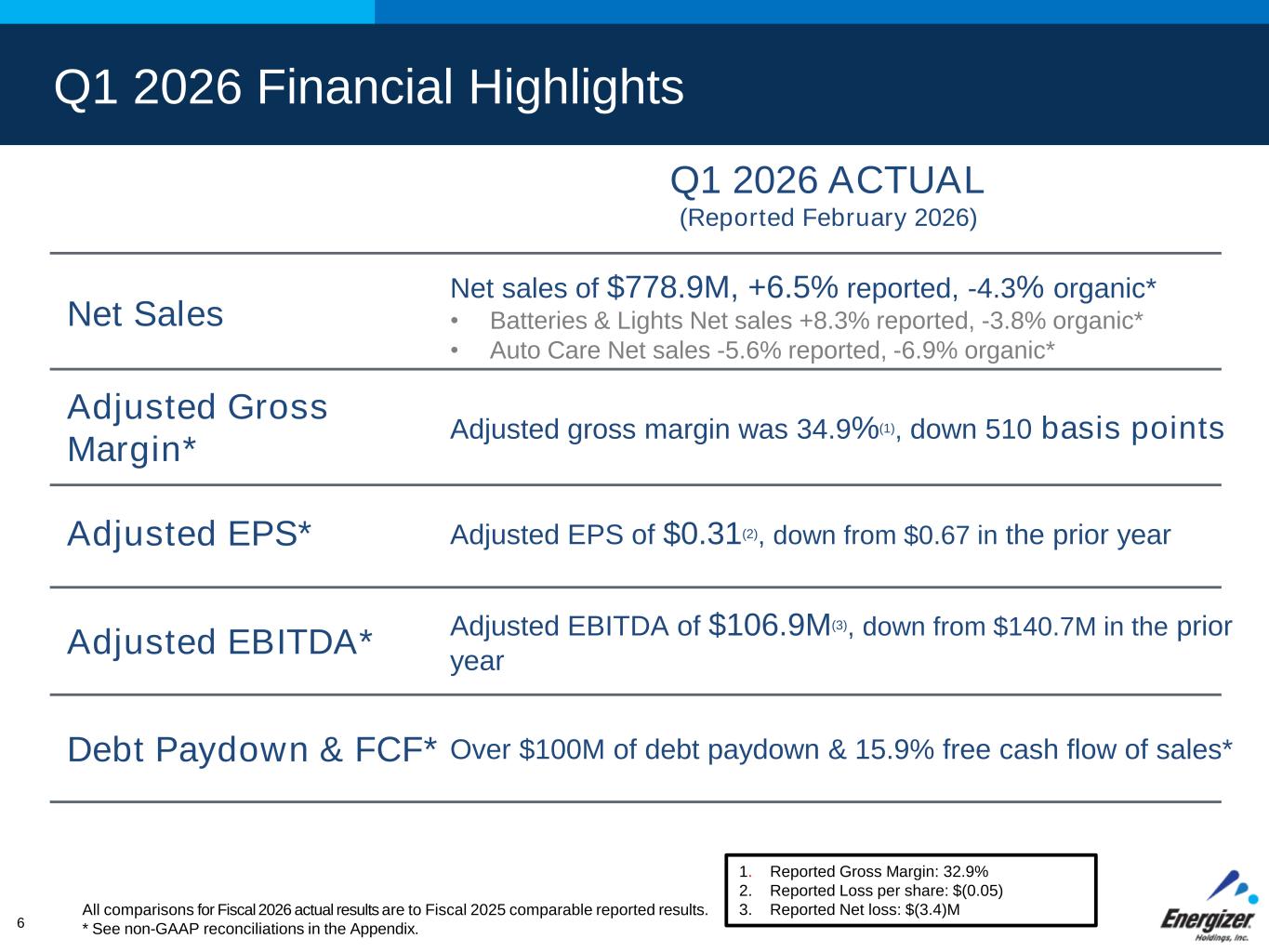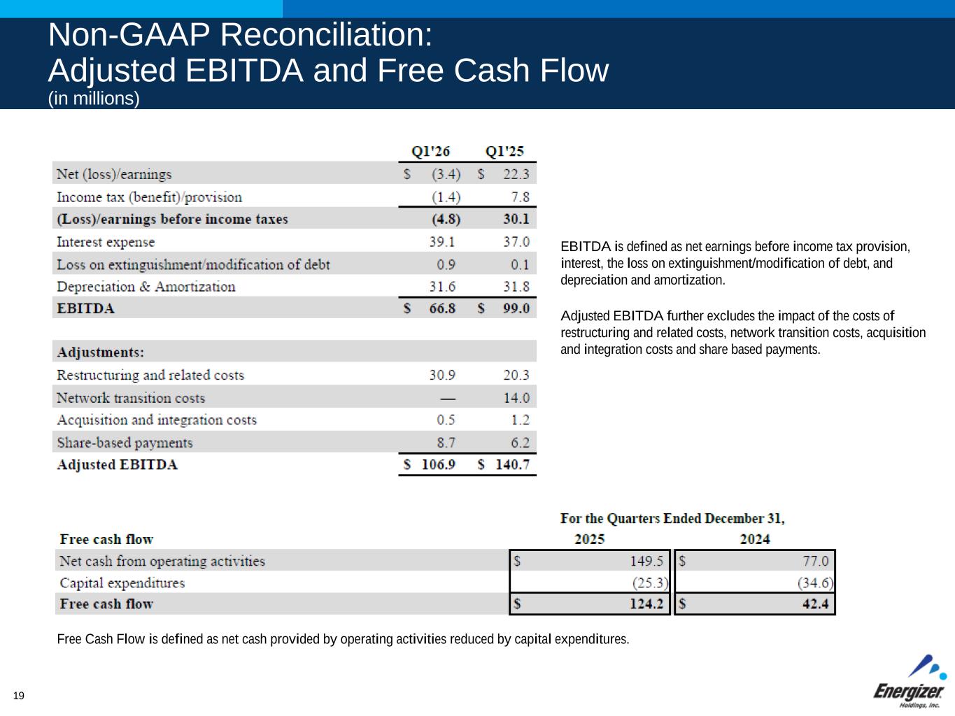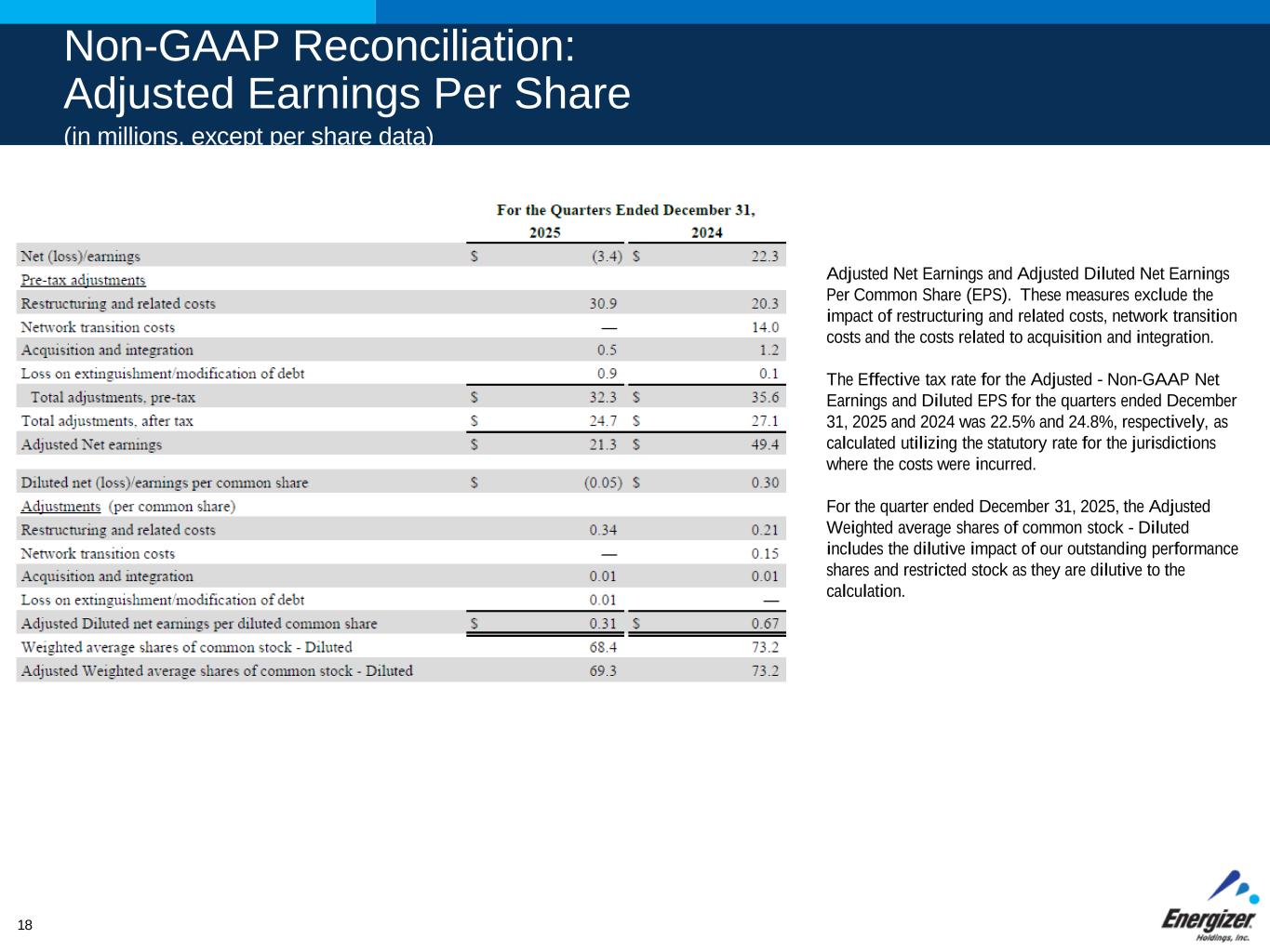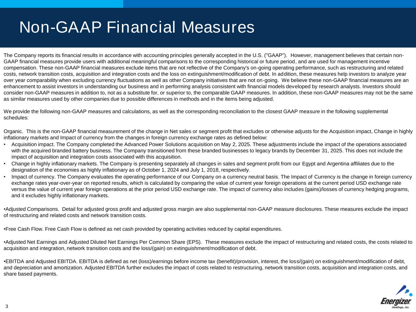 Non-GAAP Financial Measures The Company reports its financial results in accordance with accounting principles generally accepted in the U.S. ("GAAP"). However, management believes that certain non- GAAP financial measures provide users with additional meaningful comparisons to the corresponding historical or future period, and are used for management incentive compensation. These non-GAAP financial measures exclude items that are not reflective of the Company's on-going operating performance, such as restructuring and related costs, network transition costs, acquisition and integration costs and the loss on extinguishment/modification of debt. In addition, these measures help investors to analyze year over year comparability when excluding currency fluctuations as well as other Company initiatives that are not on-going. We believe these non-GAAP financial measures are an enhancement to assist investors in understanding our business and in performing analysis consistent with financial models developed by research analysts. Investors should consider non-GAAP measures in addition to, not as a substitute for, or superior to, the comparable GAAP measures. In addition, these non-GAAP measures may not be the same as similar measures used by other companies due to possible differences in methods and in the items being adjusted. We provide the following non-GAAP measures and calculations, as well as the corresponding reconciliation to the closest GAAP measure in the following supplemental schedules: Organic. This is the non-GAAP financial measurement of the change in Net sales or segment profit that excludes or otherwise adjusts for the Acquisition impact, Change in highly inflationary markets and Impact of currency from the changes in foreign currency exchange rates as defined below: • Acquisition impact. The Company completed the Advanced Power Solutions acquisition on May 2, 2025. These adjustments include the impact of the operations associated with the acquired branded battery business. The Company transitioned from these branded businesses to legacy brands by December 31, 2025. This does not include the impact of acquisition and integration costs associated with this acquisition. • Change in highly inflationary markets. The Company is presenting separately all changes in sales and segment profit from our Egypt and Argentina affiliates due to the designation of the economies as highly inflationary as of October 1, 2024 and July 1, 2018, respectively. • Impact of currency. The Company evaluates the operating performance of our Company on a currency neutral basis. The Impact of Currency is the change in foreign currency exchange rates year-over-year on reported results, which is calculated by comparing the value of current year foreign operations at the current period USD exchange rate versus the value of current year foreign operations at the prior period USD exchange rate. The impact of currency also includes (gains)/losses of currency hedging programs, and it excludes highly inflationary markets. •Adjusted Comparisons. Detail for adjusted gross profit and adjusted gross margin are also supplemental non-GAAP measure disclosures. These measures exclude the impact of restructuring and related costs and network transition costs. •Free Cash Flow. Free Cash Flow is defined as net cash provided by operating activities reduced by capital expenditures. •Adjusted Net Earnings and Adjusted Diluted Net Earnings Per Common Share (EPS). These measures exclude the impact of restructuring and related costs, the costs related to acquisition and integration, network transition costs and the loss/(gain) on extinguishment/modification of debt. •EBITDA and Adjusted EBITDA. EBITDA is defined as net (loss)/earnings before income tax (benefit)/provision, interest, the loss/(gain) on extinguishment/modification of debt, and depreciation and amortization. Adjusted EBITDA further excludes the impact of costs related to restructuring, network transition costs, acquisition and integration costs, and share based payments. 3
