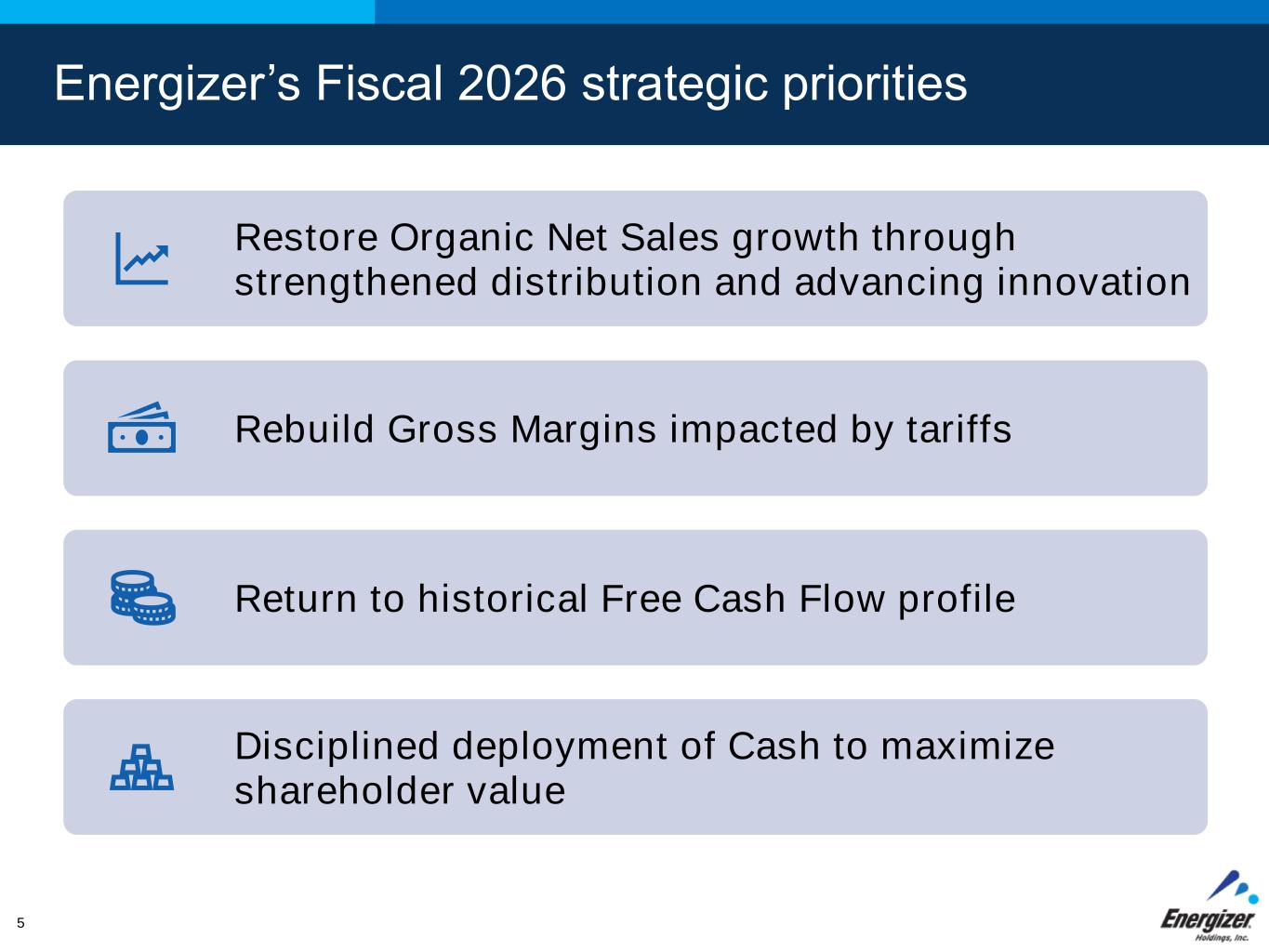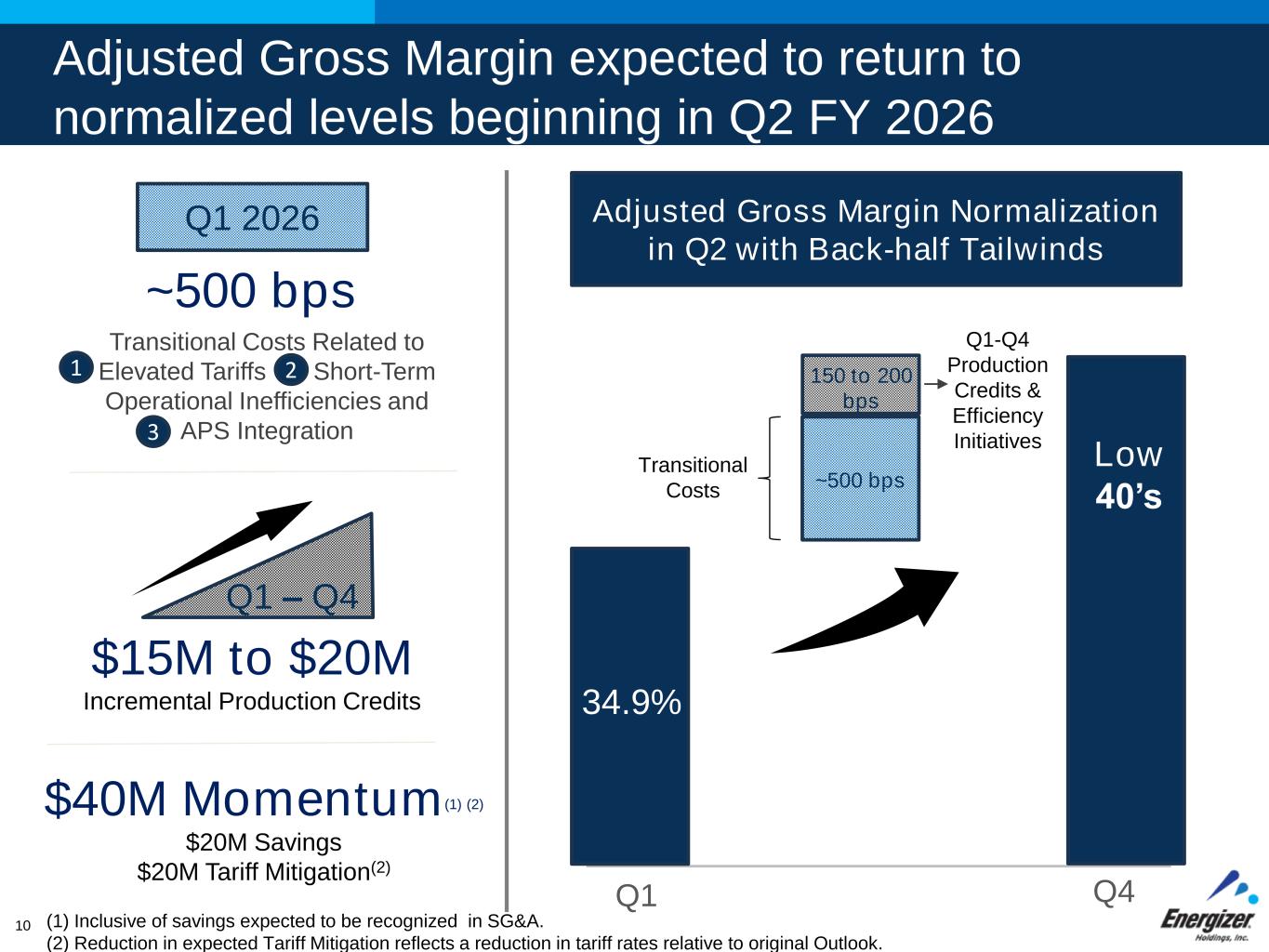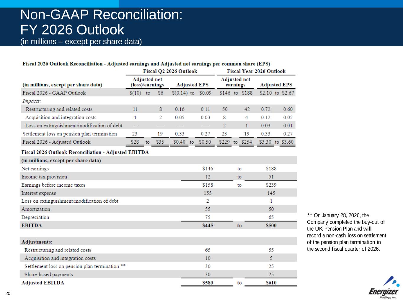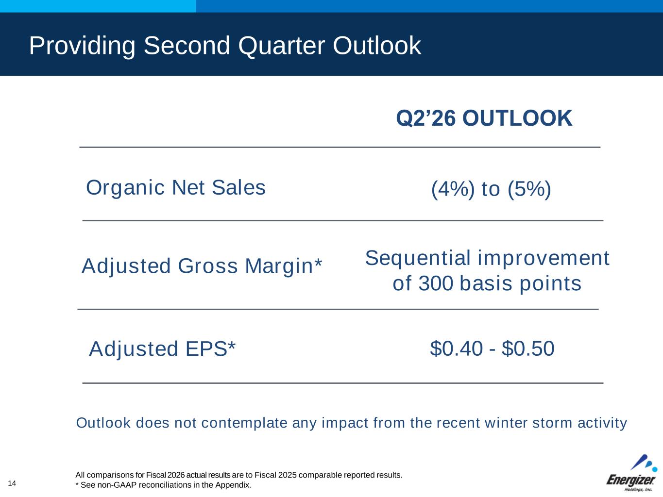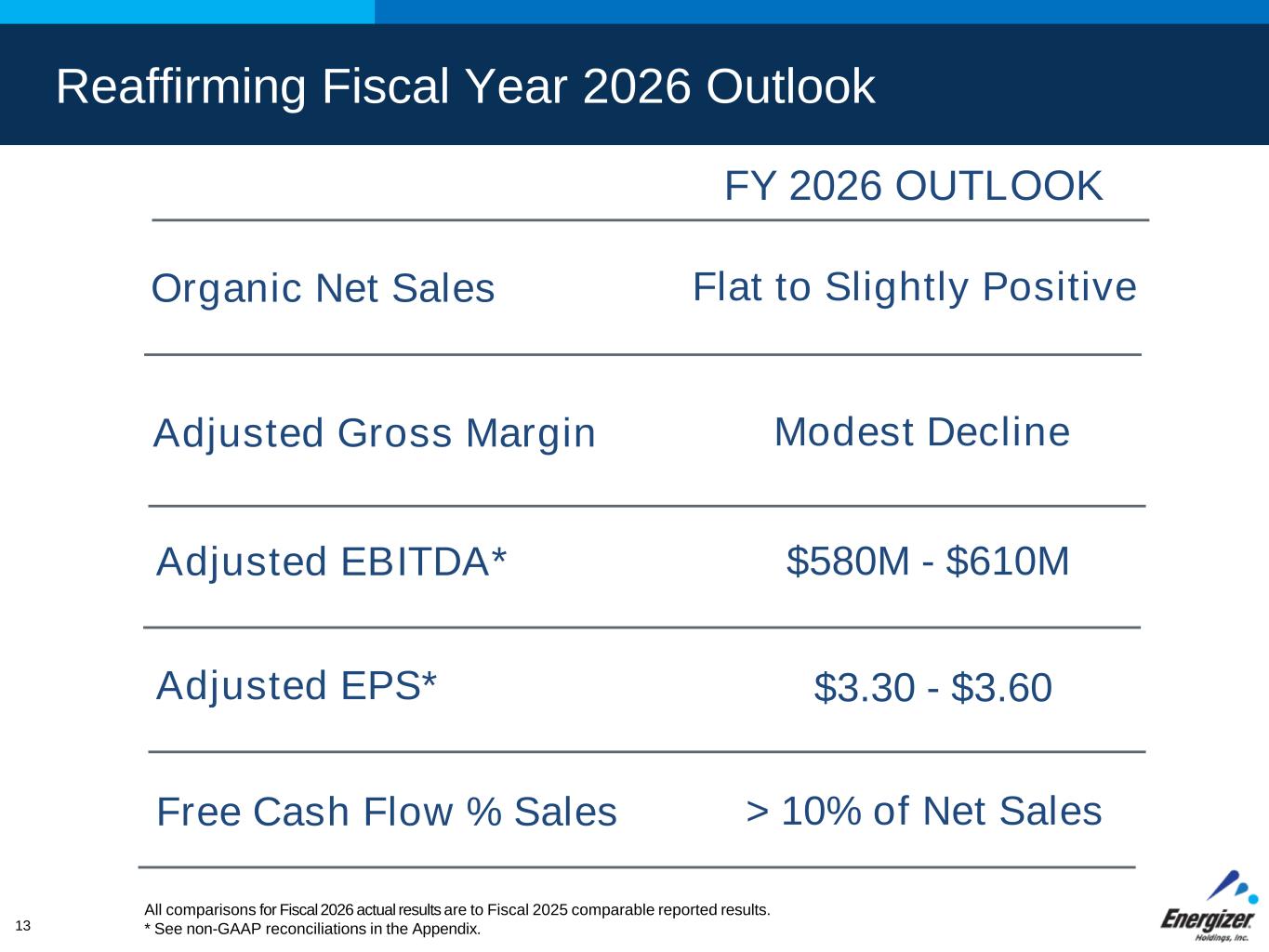 Non-GAAP Financial Measures The Company reports its financial results in accordance with accounting principles generally accepted in the U.S. ("GAAP"). However, management believes that certain non- GAAP financial measures provide users with additional meaningful comparisons to the corresponding historical or future period, and are used for management incentive compensation. These non-GAAP financial measures exclude items that are not reflective of the Company's on-going operating performance, such as restructuring and related costs, network transition costs, acquisition and integration costs and the loss on extinguishment/modification of debt. In addition, these measures help investors to analyze year over year comparability when excluding currency fluctuations as well as other Company initiatives that are not on-going. We believe these non-GAAP financial measures are an enhancement to assist investors in understanding our business and in performing analysis consistent with financial models developed by research analysts. Investors should consider non-GAAP measures in addition to, not as a substitute for, or superior to, the comparable GAAP measures. In addition, these non-GAAP measures may not be the same as similar measures used by other companies due to possible differences in methods and in the items being adjusted. We provide the following non-GAAP measures and calculations, as well as the corresponding reconciliation to the closest GAAP measure in the following supplemental schedules: Organic. This is the non-GAAP financial measurement of the change in Net sales or segment profit that excludes or otherwise adjusts for the Acquisition impact, Change in highly inflationary markets and Impact of currency from the changes in foreign currency exchange rates as defined below: • Acquisition impact. The Company completed the Advanced Power Solutions acquisition on May 2, 2025. These adjustments include the impact of the operations associated with the acquired branded battery business. The Company transitioned from these branded businesses to legacy brands by December 31, 2025. This does not include the impact of acquisition and integration costs associated with this acquisition. • Change in highly inflationary markets. The Company is presenting separately all changes in sales and segment profit from our Egypt and Argentina affiliates due to the designation of the economies as highly inflationary as of October 1, 2024 and July 1, 2018, respectively. • Impact of currency. The Company evaluates the operating performance of our Company on a currency neutral basis. The Impact of Currency is the change in foreign currency exchange rates year-over-year on reported results, which is calculated by comparing the value of current year foreign operations at the current period USD exchange rate versus the value of current year foreign operations at the prior period USD exchange rate. The impact of currency also includes (gains)/losses of currency hedging programs, and it excludes highly inflationary markets. •Adjusted Comparisons. Detail for adjusted gross profit and adjusted gross margin are also supplemental non-GAAP measure disclosures. These measures exclude the impact of restructuring and related costs and network transition costs. •Free Cash Flow. Free Cash Flow is defined as net cash provided by operating activities reduced by capital expenditures. •Adjusted Net Earnings and Adjusted Diluted Net Earnings Per Common Share (EPS). These measures exclude the impact of restructuring and related costs, the costs related to acquisition and integration, network transition costs and the loss/(gain) on extinguishment/modification of debt. •EBITDA and Adjusted EBITDA. EBITDA is defined as net (loss)/earnings before income tax (benefit)/provision, interest, the loss/(gain) on extinguishment/modification of debt, and depreciation and amortization. Adjusted EBITDA further excludes the impact of costs related to restructuring, network transition costs, acquisition and integration costs, and share based payments. 3