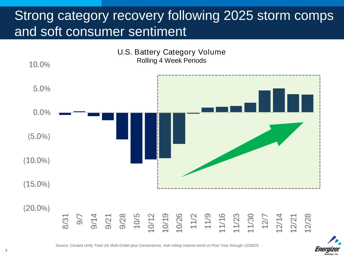 Strong category recovery following 2025 storm comps and soft consumer sentiment Source: Circana Unify Total US Multi-Outlet plus Convenience, 4wk rolling Volume trend vs Prior Year through 12/28/25 U.S. Battery Category Volume Rolling 4 Week Periods 7