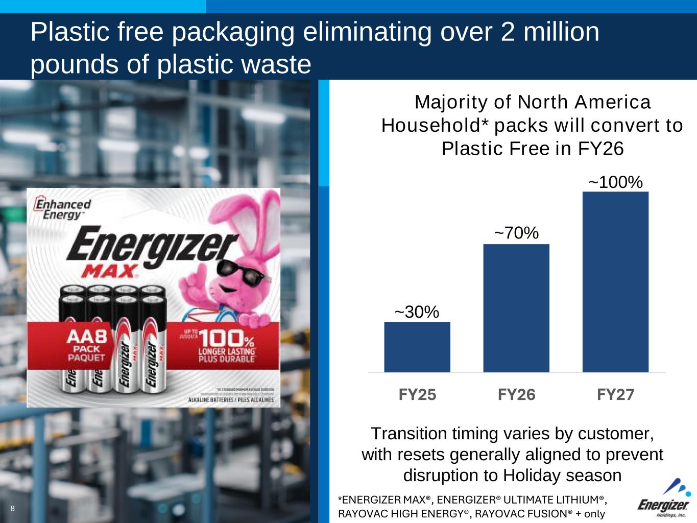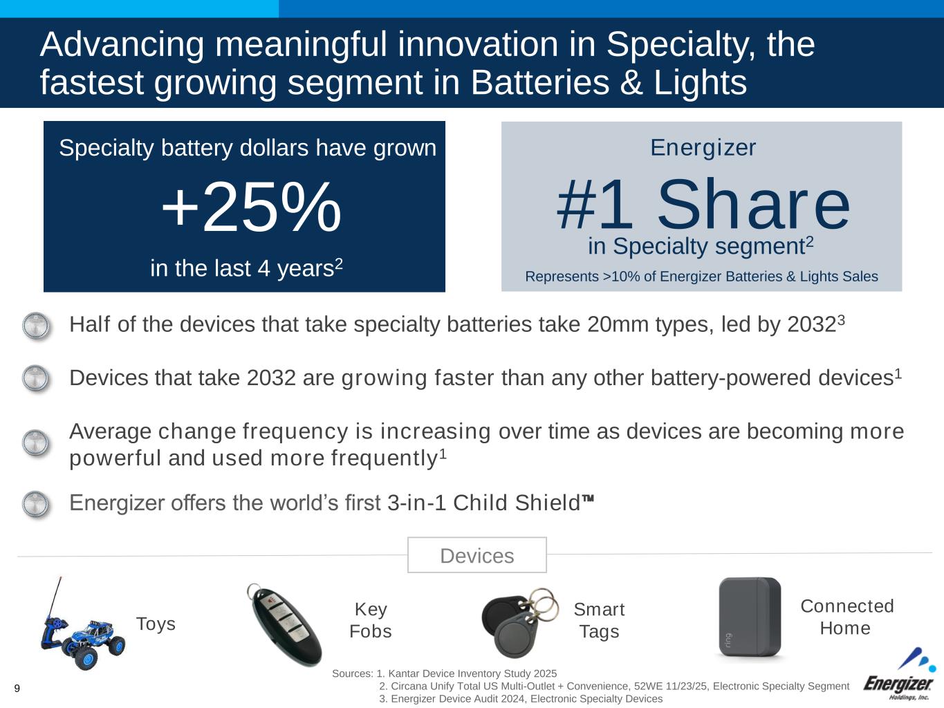 Plastic free packaging eliminating over 2 million pounds of plastic waste 8 FY25 FY26 FY27 ~30% ~70% ~100% Transition timing varies by customer, with resets generally aligned to prevent disruption to Holiday season 8 Majority of North America Household* packs will convert to Plastic Free in FY26 *ENERGIZER MAX®, ENERGIZER® ULTIMATE LITHIUM®, RAYOVAC HIGH ENERGY®, RAYOVAC FUSION® + only