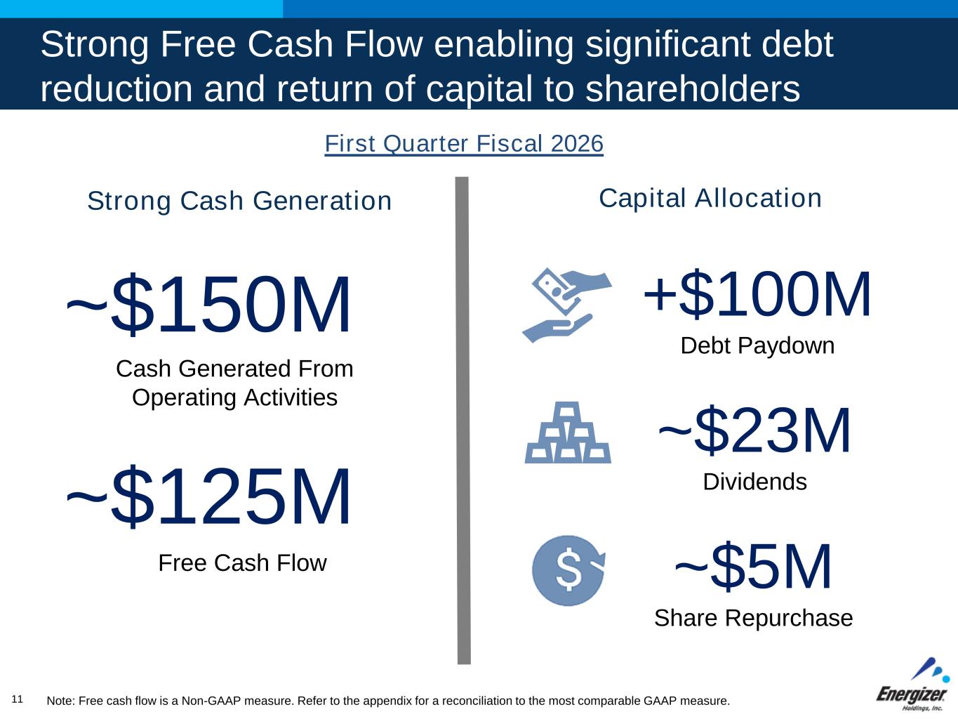 Q1 2026 Financial Highlights Q1 2026 ACTUAL (Reported February 2026) 6 1. Reported Gross Margin: 32.9% 2. Reported Loss per share: $(0.05) 3. Reported Net loss: $(3.4)M Net sales of $778.9M, +6.5% reported, -4.3% organic* • Batteries & Lights Net sales +8.3% reported, -3.8% organic* • Auto Care Net sales -5.6% reported, -6.9% organic* Adjusted gross margin was 34.9%(1), down 510 basis points Adjusted EPS of $0.31(2), down from $0.67 in the prior year Adjusted EBITDA of $106.9M(3), down from $140.7M in the prior year Net Sales Adjusted Gross Margin* Adjusted EPS* Adjusted EBITDA* Over $100M of debt paydown & 15.9% free cash flow of sales*Debt Paydown & FCF* All comparisons for Fiscal 2026 actual results are to Fiscal 2025 comparable reported results. * See non-GAAP reconciliations in the Appendix.