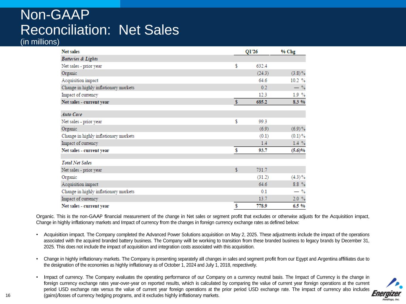 Non-GAAP Reconciliation: Net Sales (in millions) Organic. This is the non-GAAP financial measurement of the change in Net sales or segment profit that excludes or otherwise adjusts for the Acquisition impact, Change in highly inflationary markets and Impact of currency from the changes in foreign currency exchange rates as defined below: • Acquisition impact. The Company completed the Advanced Power Solutions acquisition on May 2, 2025. These adjustments include the impact of the operations associated with the acquired branded battery business. The Company will be working to transition from these branded business to legacy brands by December 31, 2025. This does not include the impact of acquisition and integration costs associated with this acquisition. • Change in highly inflationary markets. The Company is presenting separately all changes in sales and segment profit from our Egypt and Argentina affiliates due to the designation of the economies as highly inflationary as of October 1, 2024 and July 1, 2018, respectively. • Impact of currency. The Company evaluates the operating performance of our Company on a currency neutral basis. The Impact of Currency is the change in foreign currency exchange rates year-over-year on reported results, which is calculated by comparing the value of current year foreign operations at the current period USD exchange rate versus the value of current year foreign operations at the prior period USD exchange rate. The impact of currency also includes (gains)/losses of currency hedging programs, and it excludes highly inflationary markets.16