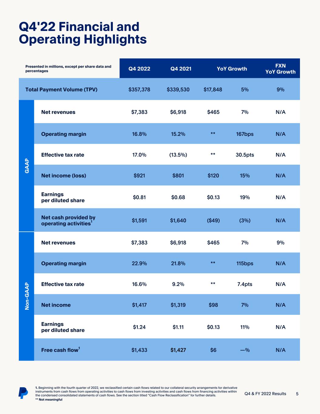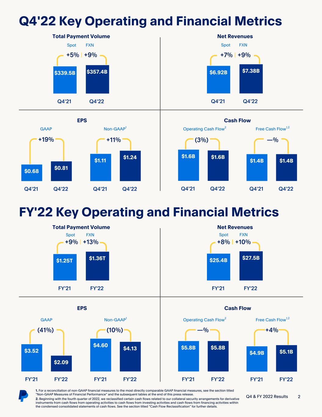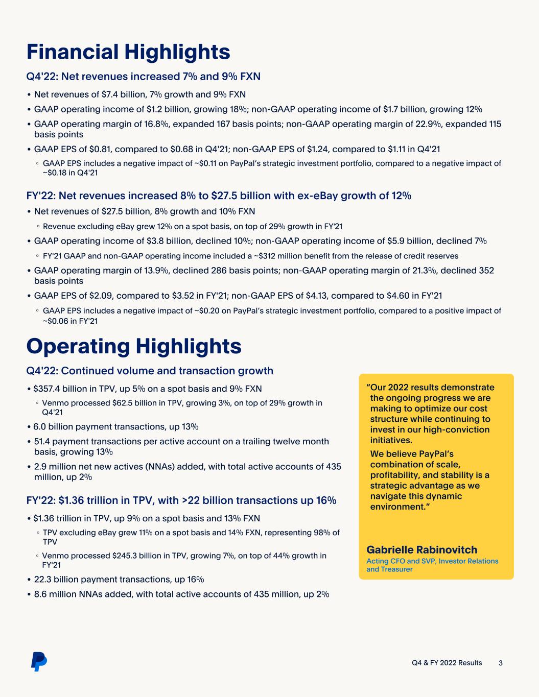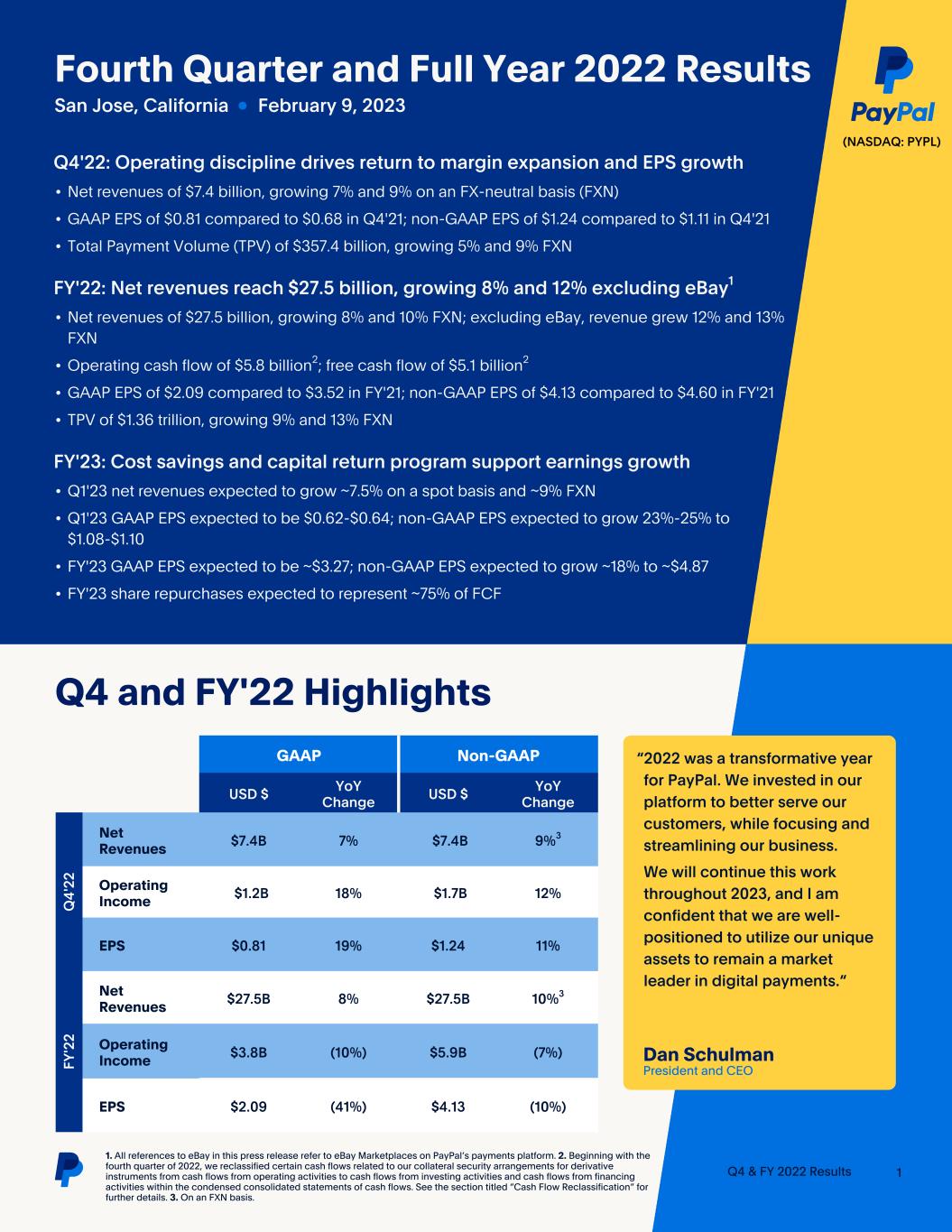 (NASDAQ: PYPL) Q4 & FY 2022 Results 1 Q4 and FY'22 Highlights 1. All references to eBay in this press release refer to eBay Marketplaces on PayPal’s payments platform. 2. Beginning with the fourth quarter of 2022, we reclassified certain cash flows related to our collateral security arrangements for derivative instruments from cash flows from operating activities to cash flows from investing activities and cash flows from financing activities within the condensed consolidated statements of cash flows. See the section titled “Cash Flow Reclassification” for further details. 3. On an FXN basis. GAAP Non-GAAP USD $ YoY Change USD $ YoY Change Q 4' 22 Net Revenues $7.4B 7% $7.4B 9%3 Operating Income $1.2B 18% $1.7B 12% EPS $0.81 19% $1.24 11% FY '2 2 Net Revenues $27.5B 8% $27.5B 10%3 Operating Income $3.8B (10%) $5.9B (7%) EPS $2.09 (41%) $4.13 (10%) Q4'22: Operating discipline drives return to margin expansion and EPS growth • Net revenues of $7.4 billion, growing 7% and 9% on an FX-neutral basis (FXN) • GAAP EPS of $0.81 compared to $0.68 in Q4'21; non-GAAP EPS of $1.24 compared to $1.11 in Q4'21 • Total Payment Volume (TPV) of $357.4 billion, growing 5% and 9% FXN FY'22: Net revenues reach $27.5 billion, growing 8% and 12% excluding eBay1 • Net revenues of $27.5 billion, growing 8% and 10% FXN; excluding eBay, revenue grew 12% and 13% FXN • Operating cash flow of $5.8 billion2; free cash flow of $5.1 billion2 • GAAP EPS of $2.09 compared to $3.52 in FY'21; non-GAAP EPS of $4.13 compared to $4.60 in FY'21 • TPV of $1.36 trillion, growing 9% and 13% FXN FY'23: Cost savings and capital return program support earnings growth • Q1'23 net revenues expected to grow ~7.5% on a spot basis and ~9% FXN • Q1'23 GAAP EPS expected to be $0.62-$0.64; non-GAAP EPS expected to grow 23%-25% to $1.08-$1.10 • FY'23 GAAP EPS expected to be ~$3.27; non-GAAP EPS expected to grow ~18% to ~$4.87 • FY'23 share repurchases expected to represent ~75% of FCF Fourth Quarter and Full Year 2022 Results San Jose, California  February 9, 2023 “2022 was a transformative year for PayPal. We invested in our platform to better serve our customers, while focusing and streamlining our business. We will continue this work throughout 2023, and I am confident that we are well- positioned to utilize our unique assets to remain a market leader in digital payments.“ Dan Schulman President and CEO