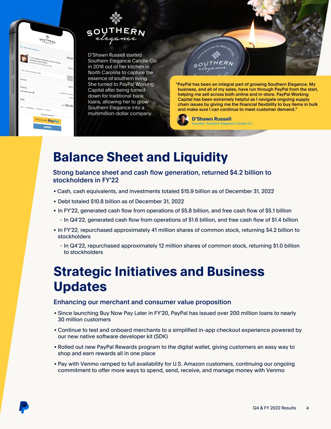 Q4 & FY 2022 Results 3 Operating Highlights Q4'22: Continued volume and transaction growth • $357.4 billion in TPV, up 5% on a spot basis and 9% FXN ◦ Venmo processed $62.5 billion in TPV, growing 3%, on top of 29% growth in Q4'21 • 6.0 billion payment transactions, up 13% • 51.4 payment transactions per active account on a trailing twelve month basis, growing 13% • 2.9 million net new actives (NNAs) added, with total active accounts of 435 million, up 2% FY'22: $1.36 trillion in TPV, with >22 billion transactions up 16% • $1.36 trillion in TPV, up 9% on a spot basis and 13% FXN ◦ TPV excluding eBay grew 11% on a spot basis and 14% FXN, representing 98% of TPV ◦ Venmo processed $245.3 billion in TPV, growing 7%, on top of 44% growth in FY'21 • 22.3 billion payment transactions, up 16% • 8.6 million NNAs added, with total active accounts of 435 million, up 2% Financial Highlights Q4'22: Net revenues increased 7% and 9% FXN • Net revenues of $7.4 billion, 7% growth and 9% FXN • GAAP operating income of $1.2 billion, growing 18%; non-GAAP operating income of $1.7 billion, growing 12% • GAAP operating margin of 16.8%, expanded 167 basis points; non-GAAP operating margin of 22.9%, expanded 115 basis points • GAAP EPS of $0.81, compared to $0.68 in Q4'21; non-GAAP EPS of $1.24, compared to $1.11 in Q4'21 ◦ GAAP EPS includes a negative impact of ~$0.11 on PayPal’s strategic investment portfolio, compared to a negative impact of ~$0.18 in Q4'21 FY'22: Net revenues increased 8% to $27.5 billion with ex-eBay growth of 12% • Net revenues of $27.5 billion, 8% growth and 10% FXN ◦ Revenue excluding eBay grew 12% on a spot basis, on top of 29% growth in FY'21 • GAAP operating income of $3.8 billion, declined 10%; non-GAAP operating income of $5.9 billion, declined 7% ◦ FY'21 GAAP and non-GAAP operating income included a ~$312 million benefit from the release of credit reserves • GAAP operating margin of 13.9%, declined 286 basis points; non-GAAP operating margin of 21.3%, declined 352 basis points • GAAP EPS of $2.09, compared to $3.52 in FY'21; non-GAAP EPS of $4.13, compared to $4.60 in FY'21 ◦ GAAP EPS includes a negative impact of ~$0.20 on PayPal’s strategic investment portfolio, compared to a positive impact of ~$0.06 in FY'21 “Our 2022 results demonstrate the ongoing progress we are making to optimize our cost structure while continuing to invest in our high-conviction initiatives. We believe PayPal’s combination of scale, profitability, and stability is a strategic advantage as we navigate this dynamic environment.“ Gabrielle Rabinovitch Acting CFO and SVP, Investor Relations and Treasurer