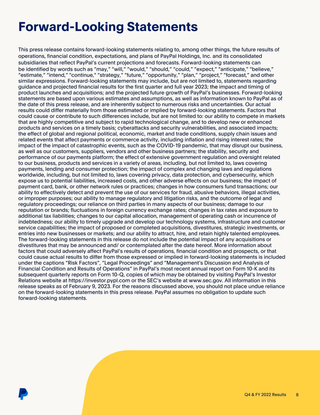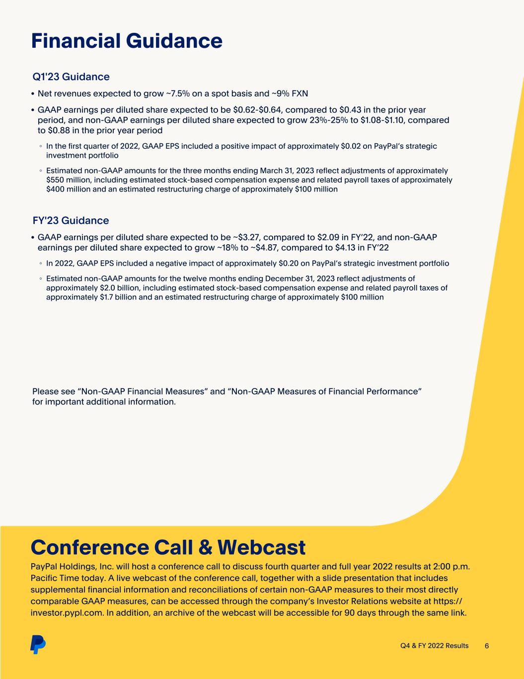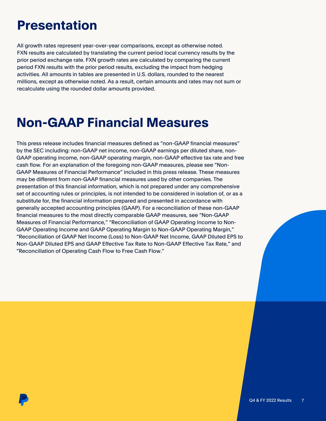 Q4 & FY 2022 Results 6 Financial Guidance Q1'23 Guidance • Net revenues expected to grow ~7.5% on a spot basis and ~9% FXN • GAAP earnings per diluted share expected to be $0.62-$0.64, compared to $0.43 in the prior year period, and non-GAAP earnings per diluted share expected to grow 23%-25% to $1.08-$1.10, compared to $0.88 in the prior year period ◦ In the first quarter of 2022, GAAP EPS included a positive impact of approximately $0.02 on PayPal’s strategic investment portfolio ◦ Estimated non-GAAP amounts for the three months ending March 31, 2023 reflect adjustments of approximately $550 million, including estimated stock-based compensation expense and related payroll taxes of approximately $400 million and an estimated restructuring charge of approximately $100 million FY'23 Guidance • GAAP earnings per diluted share expected to be ~$3.27, compared to $2.09 in FY’22, and non-GAAP earnings per diluted share expected to grow ~18% to ~$4.87, compared to $4.13 in FY’22 ◦ In 2022, GAAP EPS included a negative impact of approximately $0.20 on PayPal’s strategic investment portfolio ◦ Estimated non-GAAP amounts for the twelve months ending December 31, 2023 reflect adjustments of approximately $2.0 billion, including estimated stock-based compensation expense and related payroll taxes of approximately $1.7 billion and an estimated restructuring charge of approximately $100 million Conference Call & Webcast PayPal Holdings, Inc. will host a conference call to discuss fourth quarter and full year 2022 results at 2:00 p.m. Pacific Time today. A live webcast of the conference call, together with a slide presentation that includes supplemental financial information and reconciliations of certain non-GAAP measures to their most directly comparable GAAP measures, can be accessed through the company’s Investor Relations website at https:// investor.pypl.com. In addition, an archive of the webcast will be accessible for 90 days through the same link. Please see “Non-GAAP Financial Measures” and “Non-GAAP Measures of Financial Performance” for important additional information.
