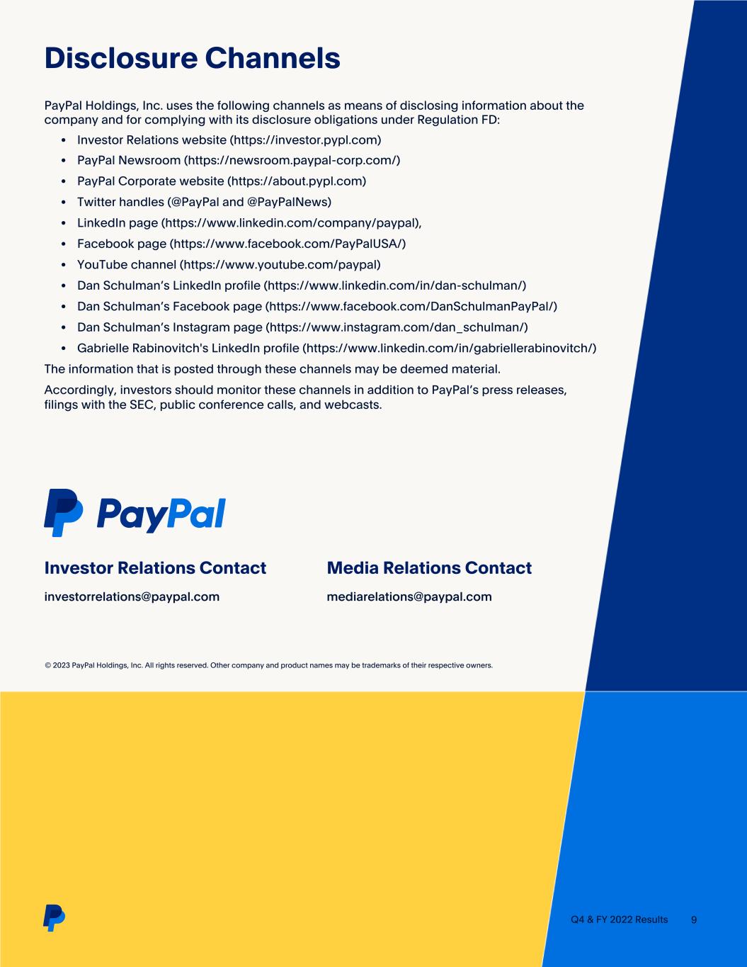 Q4 & FY 2022 Results 9 Disclosure Channels PayPal Holdings, Inc. uses the following channels as means of disclosing information about the company and for complying with its disclosure obligations under Regulation FD: • Investor Relations website (https://investor.pypl.com) • PayPal Newsroom (https://newsroom.paypal-corp.com/) • PayPal Corporate website (https://about.pypl.com) • Twitter handles (@PayPal and @PayPalNews) • LinkedIn page (https://www.linkedin.com/company/paypal), • Facebook page (https://www.facebook.com/PayPalUSA/) • YouTube channel (https://www.youtube.com/paypal) • Dan Schulman’s LinkedIn profile (https://www.linkedin.com/in/dan-schulman/) • Dan Schulman’s Facebook page (https://www.facebook.com/DanSchulmanPayPal/) • Dan Schulman’s Instagram page (https://www.instagram.com/dan_schulman/) • Gabrielle Rabinovitch's LinkedIn profile (https://www.linkedin.com/in/gabriellerabinovitch/) The information that is posted through these channels may be deemed material. Accordingly, investors should monitor these channels in addition to PayPal’s press releases, filings with the SEC, public conference calls, and webcasts. Investor Relations Contact investorrelations@paypal.com Media Relations Contact mediarelations@paypal.com © 2023 PayPal Holdings, Inc. All rights reserved. Other company and product names may be trademarks of their respective owners.