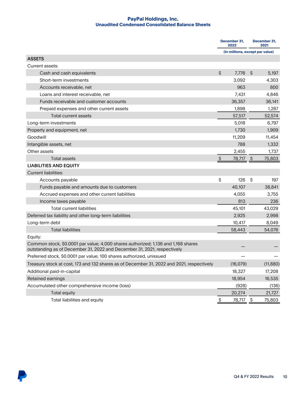 Q4 & FY 2022 Results 10 PayPal Holdings, Inc. Unaudited Condensed Consolidated Balance Sheets December 31, 2022 December 31, 2021 (In millions, except par value) ASSETS Current assets:     Cash and cash equivalents $ 7,776 $ 5,197 Short-term investments 3,092 4,303 Accounts receivable, net 963 800 Loans and interest receivable, net 7,431 4,846 Funds receivable and customer accounts 36,357 36,141 Prepaid expenses and other current assets 1,898 1,287 Total current assets 57,517 52,574 Long-term investments 5,018 6,797 Property and equipment, net 1,730 1,909 Goodwill 11,209 11,454 Intangible assets, net 788 1,332 Other assets 2,455 1,737 Total assets $ 78,717 $ 75,803 LIABILITIES AND EQUITY Current liabilities: Accounts payable $ 126 $ 197 Funds payable and amounts due to customers 40,107 38,841 Accrued expenses and other current liabilities 4,055 3,755 Income taxes payable 813 236 Total current liabilities 45,101 43,029 Deferred tax liability and other long-term liabilities 2,925 2,998 Long-term debt 10,417 8,049 Total liabilities 58,443 54,076 Equity: Common stock, $0.0001 par value; 4,000 shares authorized; 1,136 and 1,168 shares outstanding as of December 31, 2022 and December 31, 2021, respectively — — Preferred stock, $0.0001 par value; 100 shares authorized, unissued — — Treasury stock at cost, 173 and 132 shares as of December 31, 2022 and 2021, respectively (16,079) (11,880) Additional paid-in-capital 18,327 17,208 Retained earnings 18,954 16,535 Accumulated other comprehensive income (loss) (928) (136) Total equity 20,274 21,727 Total liabilities and equity $ 78,717 $ 75,803