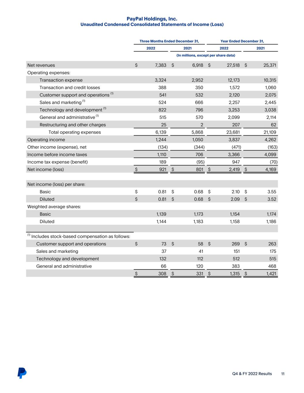 Q4 & FY 2022 Results 11 PayPal Holdings, Inc. Unaudited Condensed Consolidated Statements of Income (Loss)   Three Months Ended December 31, Year Ended December 31,   2022 2021 2022 2021   (In millions, except per share data) Net revenues $ 7,383 $ 6,918 $ 27,518 $ 25,371 Operating expenses: Transaction expense 3,324 2,952 12,173 10,315 Transaction and credit losses 388 350 1,572 1,060 Customer support and operations (1) 541 532 2,120 2,075 Sales and marketing (1) 524 666 2,257 2,445 Technology and development (1) 822 796 3,253 3,038 General and administrative (1) 515 570 2,099 2,114 Restructuring and other charges 25 2 207 62 Total operating expenses 6,139 5,868 23,681 21,109 Operating income 1,244 1,050 3,837 4,262 Other income (expense), net (134) (344) (471) (163) Income before income taxes 1,110 706 3,366 4,099 Income tax expense (benefit) 189 (95) 947 (70) Net income (loss) $ 921 $ 801 $ 2,419 $ 4,169 Net income (loss) per share: Basic $ 0.81 $ 0.68 $ 2.10 $ 3.55 Diluted $ 0.81 $ 0.68 $ 2.09 $ 3.52 Weighted average shares: Basic 1,139 1,173 1,154 1,174 Diluted 1,144 1,183 1,158 1,186 (1) Includes stock-based compensation as follows: Customer support and operations $ 73 $ 58 $ 269 $ 263 Sales and marketing 37 41 151 175 Technology and development 132 112 512 515 General and administrative 66 120 383 468 $ 308 $ 331 $ 1,315 $ 1,421