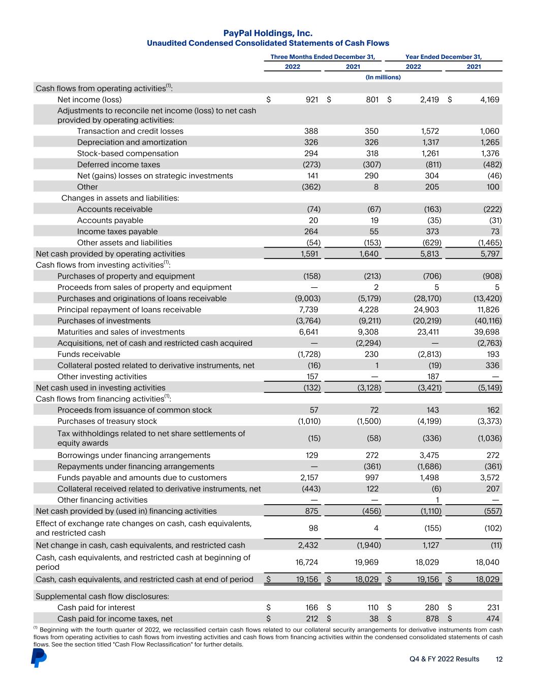 Q4 & FY 2022 Results 12 PayPal Holdings, Inc. Unaudited Condensed Consolidated Statements of Cash Flows Three Months Ended December 31, Year Ended December 31, 2022 2021 2022 2021 (In millions) Cash flows from operating activities(1): Net income (loss) $ 921 $ 801 $ 2,419 $ 4,169 Adjustments to reconcile net income (loss) to net cash provided by operating activities: Transaction and credit losses 388 350 1,572 1,060 Depreciation and amortization 326 326 1,317 1,265 Stock-based compensation 294 318 1,261 1,376 Deferred income taxes (273) (307) (811) (482) Net (gains) losses on strategic investments 141 290 304 (46) Other (362) 8 205 100 Changes in assets and liabilities: Accounts receivable (74) (67) (163) (222) Accounts payable 20 19 (35) (31) Income taxes payable 264 55 373 73 Other assets and liabilities (54) (153) (629) (1,465) Net cash provided by operating activities 1,591 1,640 5,813 5,797 Cash flows from investing activities(1): Purchases of property and equipment (158) (213) (706) (908) Proceeds from sales of property and equipment — 2 5 5 Purchases and originations of loans receivable (9,003) (5,179) (28,170) (13,420) Principal repayment of loans receivable 7,739 4,228 24,903 11,826 Purchases of investments (3,764) (9,211) (20,219) (40,116) Maturities and sales of investments 6,641 9,308 23,411 39,698 Acquisitions, net of cash and restricted cash acquired — (2,294) — (2,763) Funds receivable (1,728) 230 (2,813) 193 Collateral posted related to derivative instruments, net (16) 1 (19) 336 Other investing activities 157 — 187 — Net cash used in investing activities (132) (3,128) (3,421) (5,149) Cash flows from financing activities(1): Proceeds from issuance of common stock 57 72 143 162 Purchases of treasury stock (1,010) (1,500) (4,199) (3,373) Tax withholdings related to net share settlements of equity awards (15) (58) (336) (1,036) Borrowings under financing arrangements 129 272 3,475 272 Repayments under financing arrangements — (361) (1,686) (361) Funds payable and amounts due to customers 2,157 997 1,498 3,572 Collateral received related to derivative instruments, net (443) 122 (6) 207 Other financing activities — — 1 — Net cash provided by (used in) financing activities 875 (456) (1,110) (557) Effect of exchange rate changes on cash, cash equivalents, and restricted cash 98 4 (155) (102) Net change in cash, cash equivalents, and restricted cash 2,432 (1,940) 1,127 (11) Cash, cash equivalents, and restricted cash at beginning of period 16,724 19,969 18,029 18,040 Cash, cash equivalents, and restricted cash at end of period $ 19,156 $ 18,029 $ 19,156 $ 18,029 Supplemental cash flow disclosures: Cash paid for interest $ 166 $ 110 $ 280 $ 231 Cash paid for income taxes, net $ 212 $ 38 $ 878 $ 474 (1) Beginning with the fourth quarter of 2022, we reclassified certain cash flows related to our collateral security arrangements for derivative instruments from cash flows from operating activities to cash flows from investing activities and cash flows from financing activities within the condensed consolidated statements of cash flows. See the section titled "Cash Flow Reclassification" for further details.