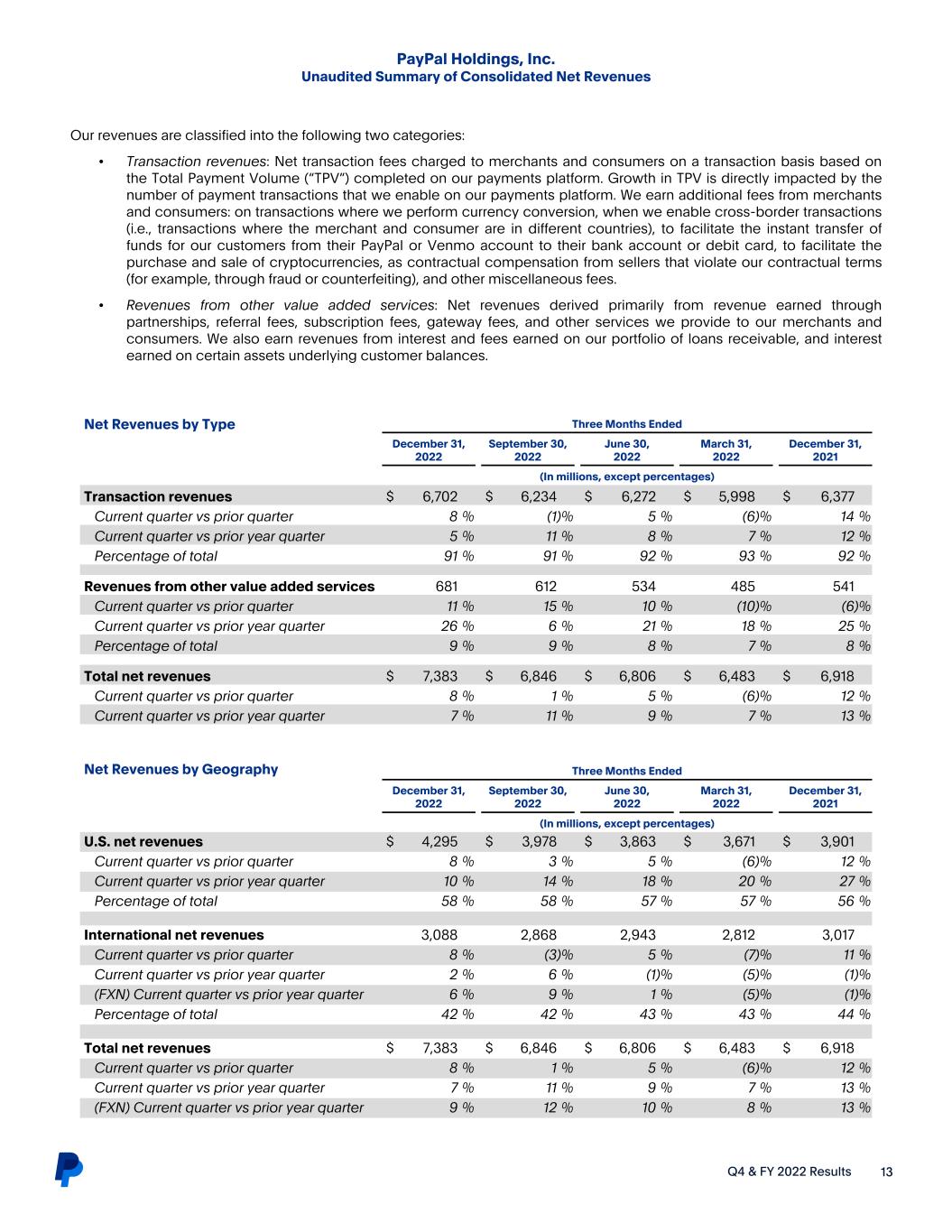 Q4 & FY 2022 Results 13 PayPal Holdings, Inc. Unaudited Summary of Consolidated Net Revenues Our revenues are classified into the following two categories: • Transaction revenues: Net transaction fees charged to merchants and consumers on a transaction basis based on the Total Payment Volume (“TPV”) completed on our payments platform. Growth in TPV is directly impacted by the number of payment transactions that we enable on our payments platform. We earn additional fees from merchants and consumers: on transactions where we perform currency conversion, when we enable cross-border transactions (i.e., transactions where the merchant and consumer are in different countries), to facilitate the instant transfer of funds for our customers from their PayPal or Venmo account to their bank account or debit card, to facilitate the purchase and sale of cryptocurrencies, as contractual compensation from sellers that violate our contractual terms (for example, through fraud or counterfeiting), and other miscellaneous fees. • Revenues from other value added services: Net revenues derived primarily from revenue earned through partnerships, referral fees, subscription fees, gateway fees, and other services we provide to our merchants and consumers. We also earn revenues from interest and fees earned on our portfolio of loans receivable, and interest earned on certain assets underlying customer balances. Net Revenues by Type Three Months Ended December 31, 2022 September 30, 2022 June 30, 2022 March 31, 2022 December 31, 2021 (In millions, except percentages) Transaction revenues $ 6,702 $ 6,234 $ 6,272 $ 5,998 $ 6,377 Current quarter vs prior quarter 8 % (1) % 5 % (6) % 14 % Current quarter vs prior year quarter 5 % 11 % 8 % 7 % 12 % Percentage of total 91 % 91 % 92 % 93 % 92 % Revenues from other value added services 681 612 534 485 541 Current quarter vs prior quarter 11 % 15 % 10 % (10) % (6) % Current quarter vs prior year quarter 26 % 6 % 21 % 18 % 25 % Percentage of total 9 % 9 % 8 % 7 % 8 % Total net revenues $ 7,383 $ 6,846 $ 6,806 $ 6,483 $ 6,918 Current quarter vs prior quarter 8 % 1 % 5 % (6) % 12 % Current quarter vs prior year quarter 7 % 11 % 9 % 7 % 13 % Net Revenues by Geography Three Months Ended December 31, 2022 September 30, 2022 June 30, 2022 March 31, 2022 December 31, 2021 (In millions, except percentages) U.S. net revenues $ 4,295 $ 3,978 $ 3,863 $ 3,671 $ 3,901 Current quarter vs prior quarter 8 % 3 % 5 % (6) % 12 % Current quarter vs prior year quarter 10 % 14 % 18 % 20 % 27 % Percentage of total 58 % 58 % 57 % 57 % 56 % International net revenues 3,088 2,868 2,943 2,812 3,017 Current quarter vs prior quarter 8 % (3) % 5 % (7) % 11 % Current quarter vs prior year quarter 2 % 6 % (1) % (5) % (1) % (FXN) Current quarter vs prior year quarter 6 % 9 % 1 % (5) % (1) % Percentage of total 42 % 42 % 43 % 43 % 44 % Total net revenues $ 7,383 $ 6,846 $ 6,806 $ 6,483 $ 6,918 Current quarter vs prior quarter 8 % 1 % 5 % (6) % 12 % Current quarter vs prior year quarter 7 % 11 % 9 % 7 % 13 % (FXN) Current quarter vs prior year quarter 9 % 12 % 10 % 8 % 13 %