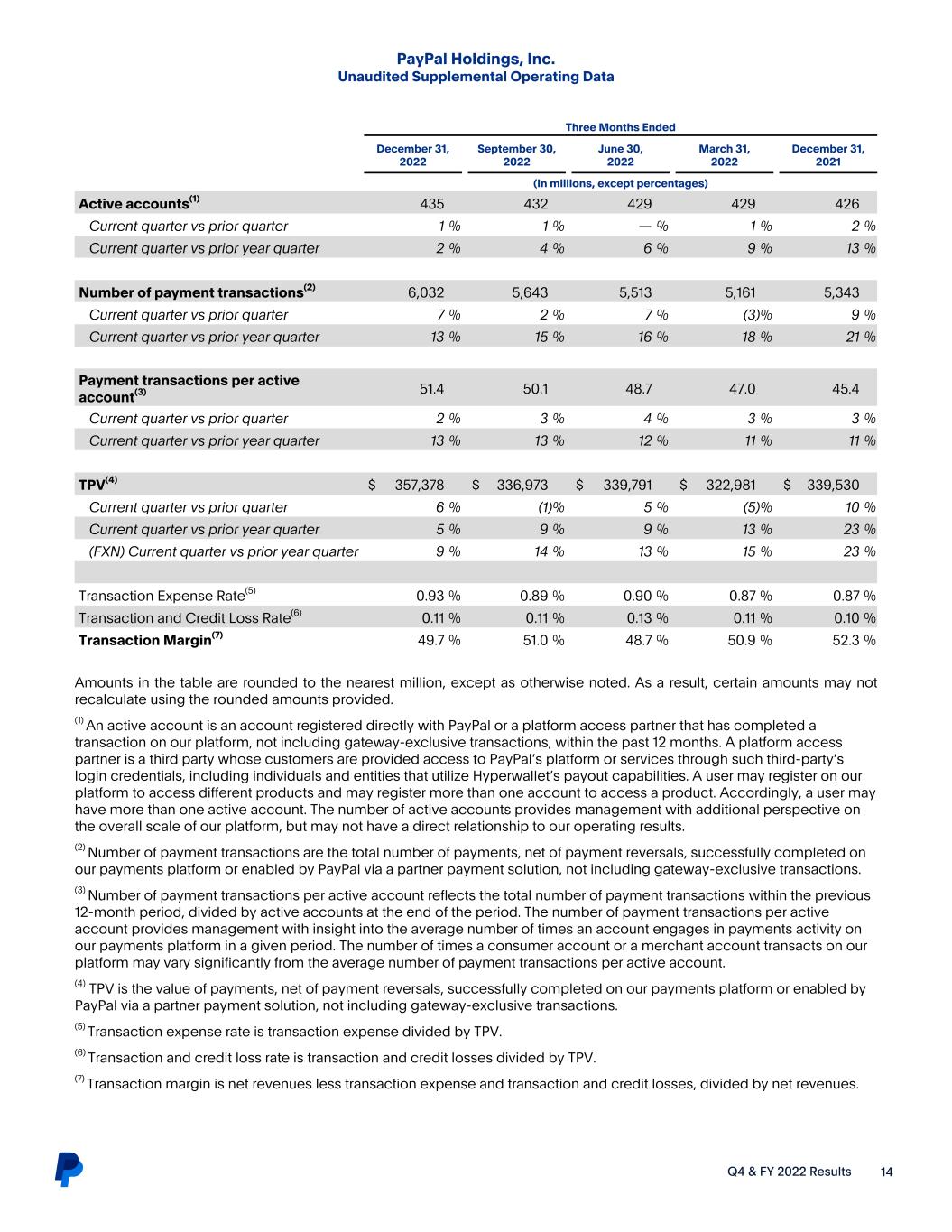 Q4 & FY 2022 Results 14 PayPal Holdings, Inc. Unaudited Supplemental Operating Data Three Months Ended December 31, 2022 September 30, 2022 June 30, 2022 March 31, 2022 December 31, 2021 (In millions, except percentages) Active accounts(1) 435 432 429 429 426 Current quarter vs prior quarter 1 % 1 % — % 1 % 2 % Current quarter vs prior year quarter 2 % 4 % 6 % 9 % 13 % Number of payment transactions(2) 6,032 5,643 5,513 5,161 5,343 Current quarter vs prior quarter 7 % 2 % 7 % (3) % 9 % Current quarter vs prior year quarter 13 % 15 % 16 % 18 % 21 % Payment transactions per active account(3) 51.4 50.1 48.7 47.0 45.4 Current quarter vs prior quarter 2 % 3 % 4 % 3 % 3 % Current quarter vs prior year quarter 13 % 13 % 12 % 11 % 11 % TPV(4) $ 357,378 $ 336,973 $ 339,791 $ 322,981 $ 339,530 Current quarter vs prior quarter 6 % (1) % 5 % (5) % 10 % Current quarter vs prior year quarter 5 % 9 % 9 % 13 % 23 % (FXN) Current quarter vs prior year quarter 9 % 14 % 13 % 15 % 23 % Transaction Expense Rate(5) 0.93 % 0.89 % 0.90 % 0.87 % 0.87 % Transaction and Credit Loss Rate(6) 0.11 % 0.11 % 0.13 % 0.11 % 0.10 % Transaction Margin(7) 49.7 % 51.0 % 48.7 % 50.9 % 52.3 % Amounts in the table are rounded to the nearest million, except as otherwise noted. As a result, certain amounts may not recalculate using the rounded amounts provided. (1) An active account is an account registered directly with PayPal or a platform access partner that has completed a transaction on our platform, not including gateway-exclusive transactions, within the past 12 months. A platform access partner is a third party whose customers are provided access to PayPal’s platform or services through such third-party’s login credentials, including individuals and entities that utilize Hyperwallet’s payout capabilities. A user may register on our platform to access different products and may register more than one account to access a product. Accordingly, a user may have more than one active account. The number of active accounts provides management with additional perspective on the overall scale of our platform, but may not have a direct relationship to our operating results. (2) Number of payment transactions are the total number of payments, net of payment reversals, successfully completed on our payments platform or enabled by PayPal via a partner payment solution, not including gateway-exclusive transactions. (3) Number of payment transactions per active account reflects the total number of payment transactions within the previous 12-month period, divided by active accounts at the end of the period. The number of payment transactions per active account provides management with insight into the average number of times an account engages in payments activity on our payments platform in a given period. The number of times a consumer account or a merchant account transacts on our platform may vary significantly from the average number of payment transactions per active account. (4) TPV is the value of payments, net of payment reversals, successfully completed on our payments platform or enabled by PayPal via a partner payment solution, not including gateway-exclusive transactions. (5) Transaction expense rate is transaction expense divided by TPV. (6) Transaction and credit loss rate is transaction and credit losses divided by TPV. (7) Transaction margin is net revenues less transaction expense and transaction and credit losses, divided by net revenues.